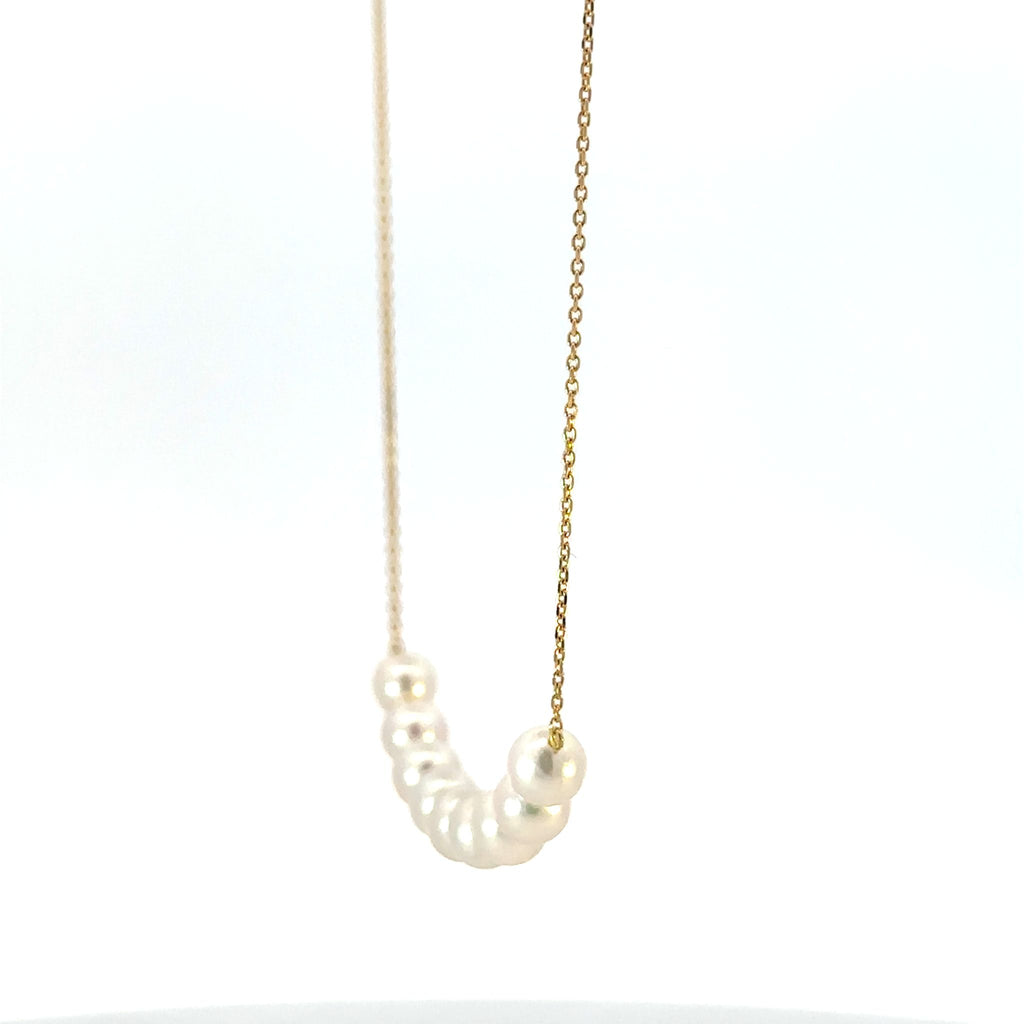 直線ではなく自然なカーブに並べたアコヤパールは、身に着けた人をより優しくフェミニンな印象に見せてくれます。