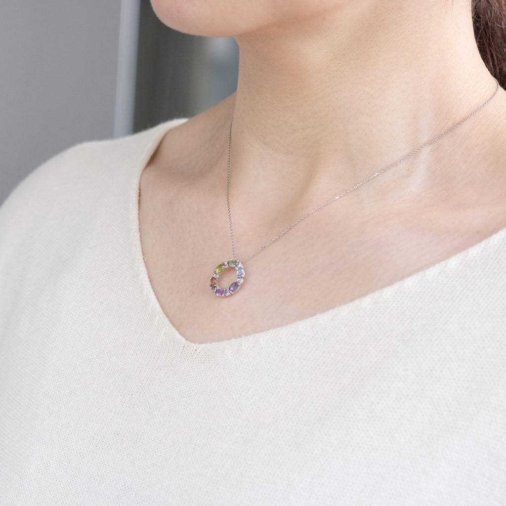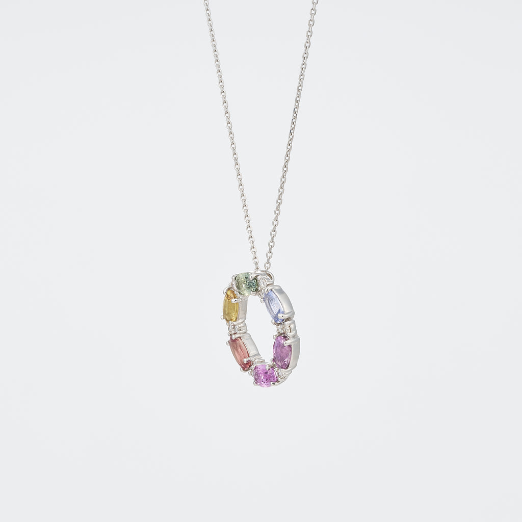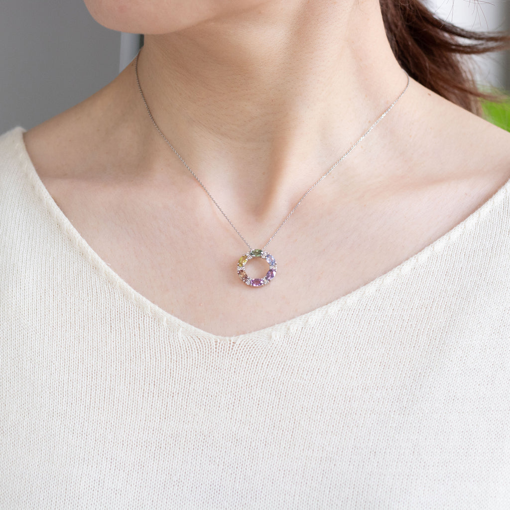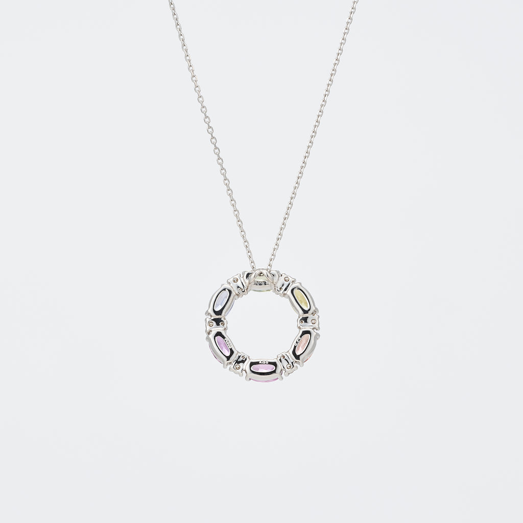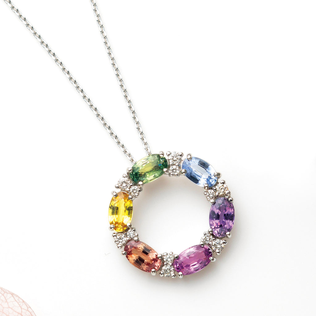 色彩豊かなファンシーカラーサファイアの特徴を生かした華やかなマルチカラーのネックレスです。