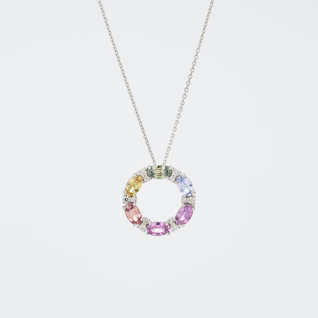イエロー、オレンジ、ピンク、パープル、ライトブルー、グリーン、と同じ大きさのオーバルシェイプのサファイアをぐるりとサークルに留めました。美しい6色のサファイアの間にはキラキラと輝くメレダイヤを2石ずつセットしました。