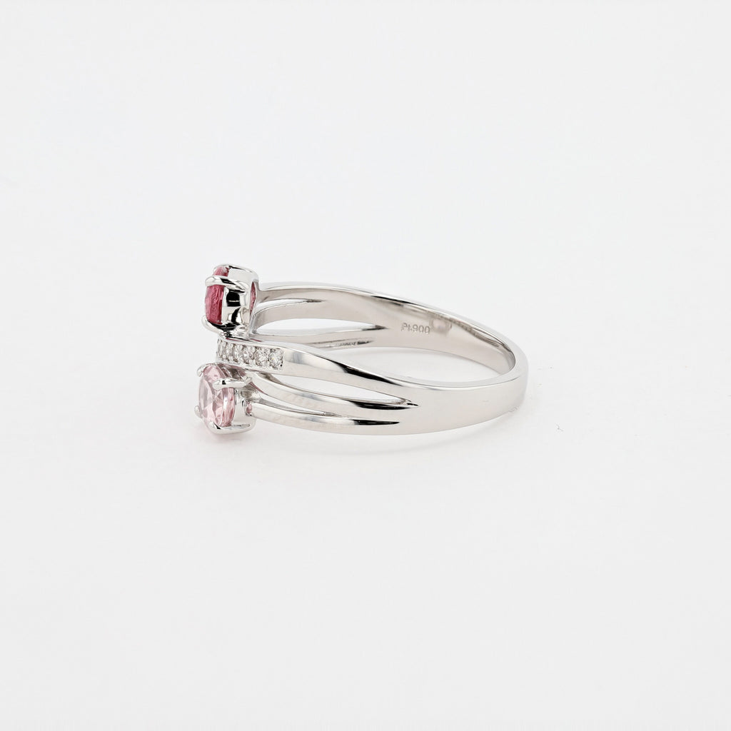 リングの中央を斜めに横切るメレダイヤのラインを挟んで、上下に1石ずつ留めた2石のピンク色のカラーストーン。