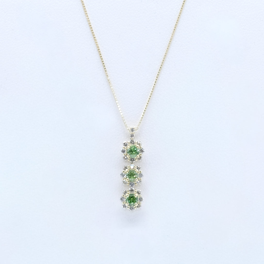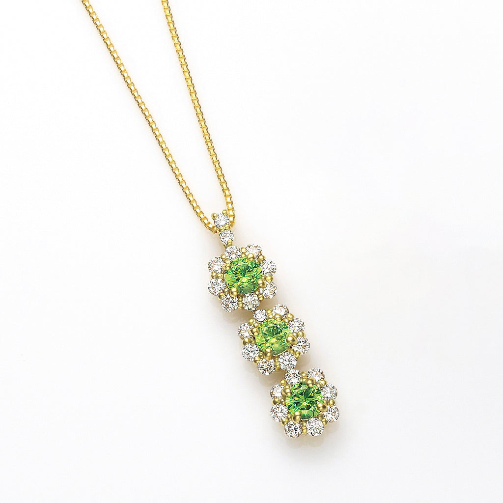 キラキラとした輝きを引き出すラウンドブリリアントカットにしたデマントイドガーネットを、その鮮やかなグリーンが映える18金イエローゴールド製のネックレスにセットしました。