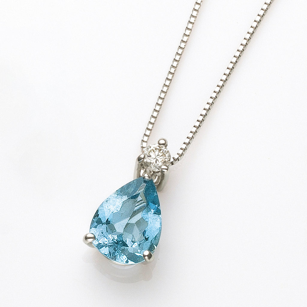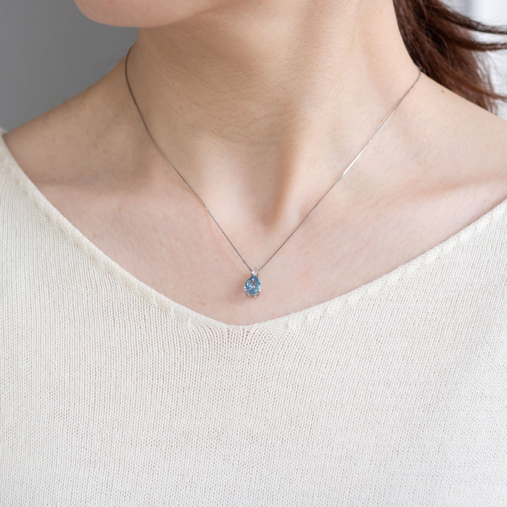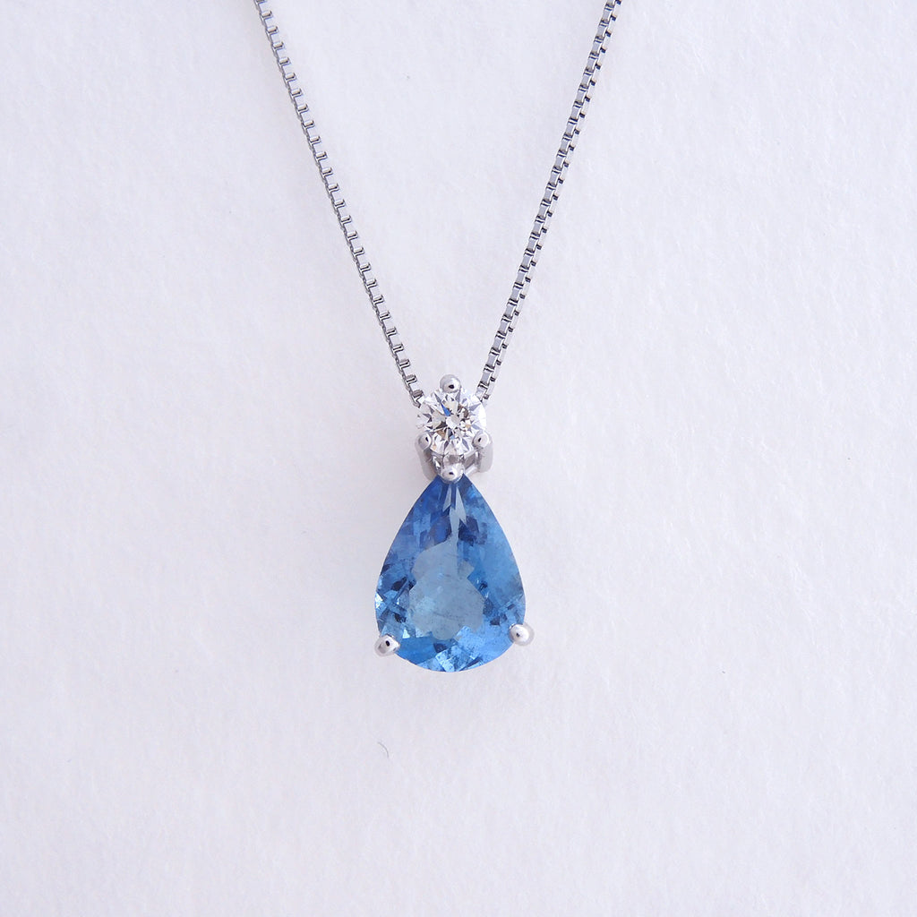 アクアマリンの名前にぴったりな雫形のアクアマリンを相性抜群のプラチナ製の枠にセットしました。チェーンを通すバチカン部分にキラッと輝くメレダイヤを1石留めただけのシンプルなデザインは、優雅な印象のペアシェイプの形を際立たせています。