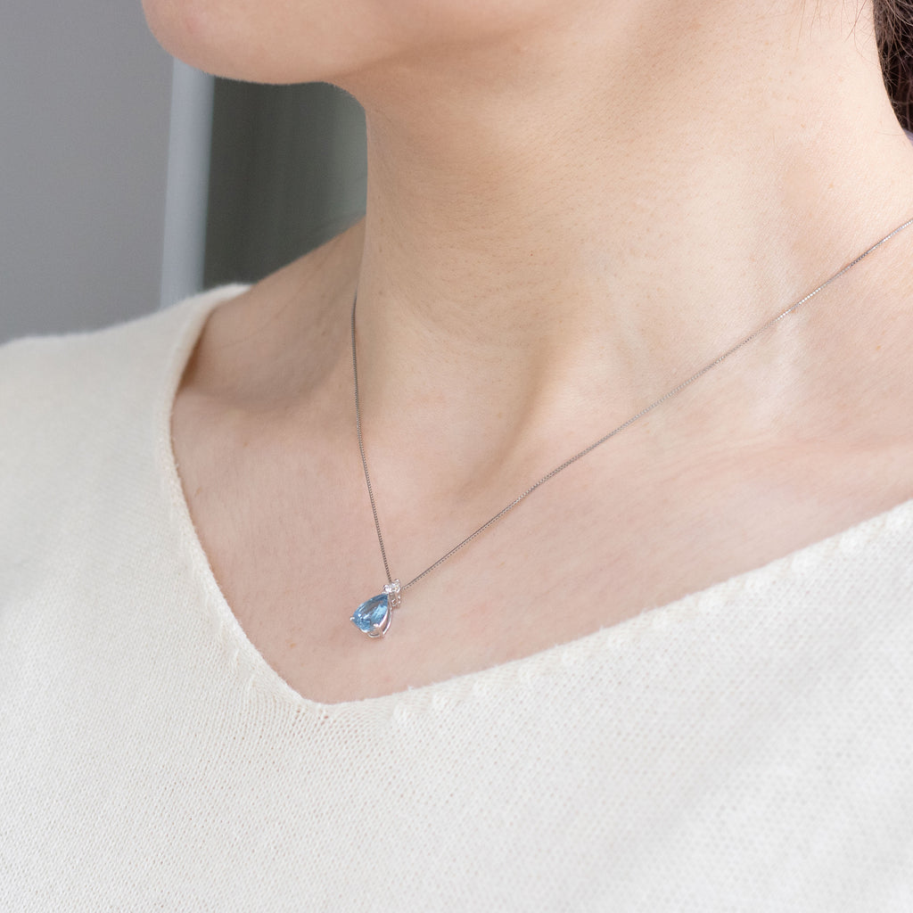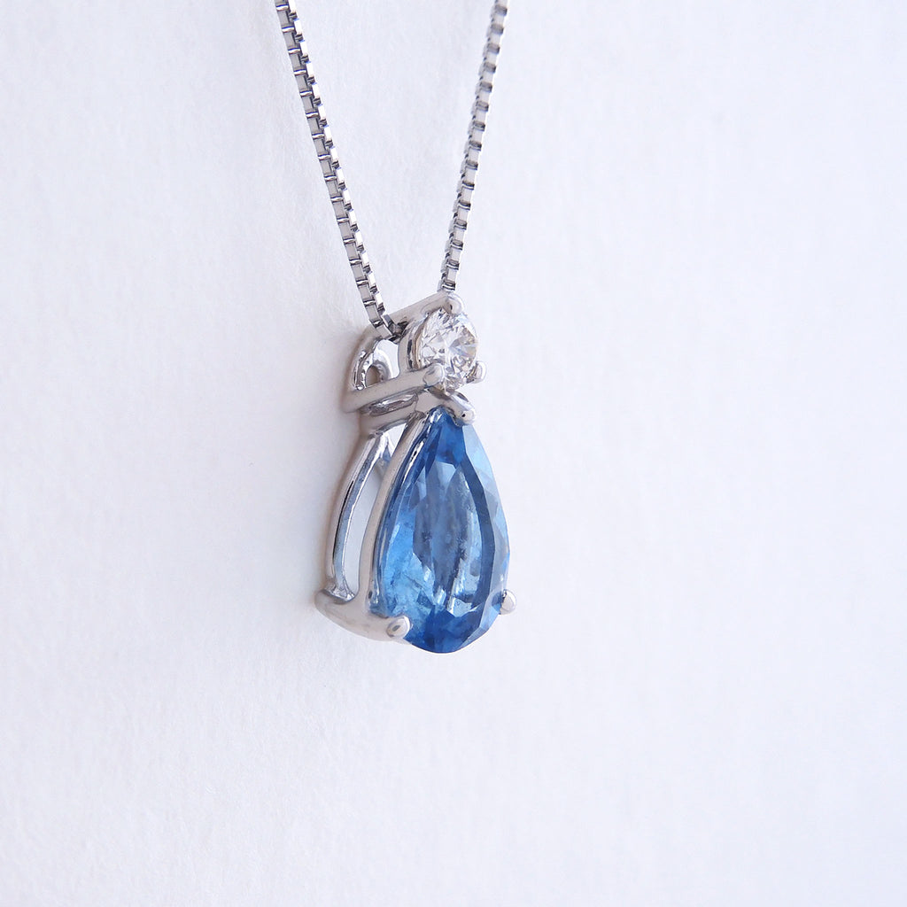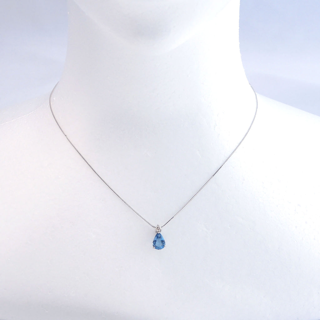 アクアマリンの名前にぴったりな雫形のアクアマリンを相性抜群のプラチナ製の枠にセットしました。チェーンを通すバチカン部分にキラッと輝くメレダイヤを1石留めただけのシンプルなデザインは、優雅な印象のペアシェイプの形を際立たせています。