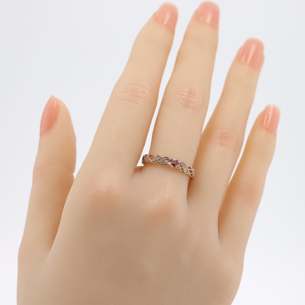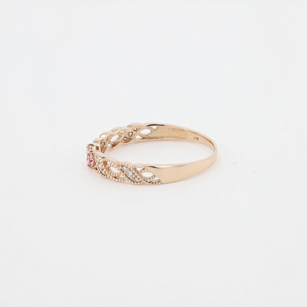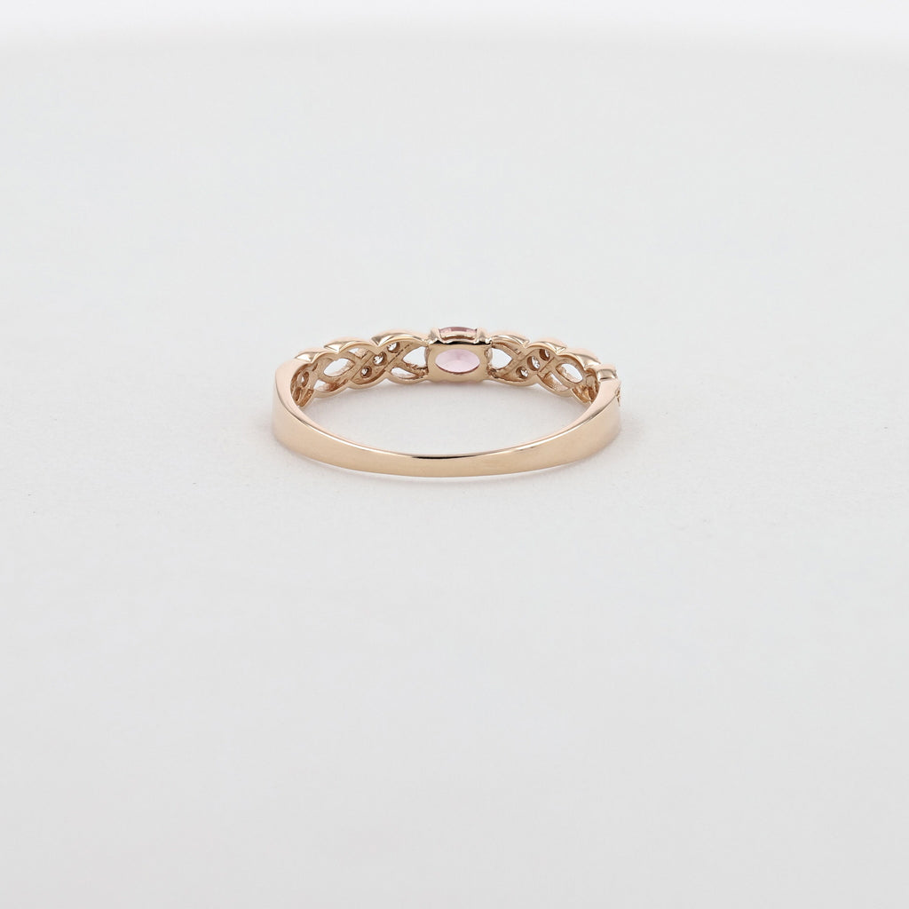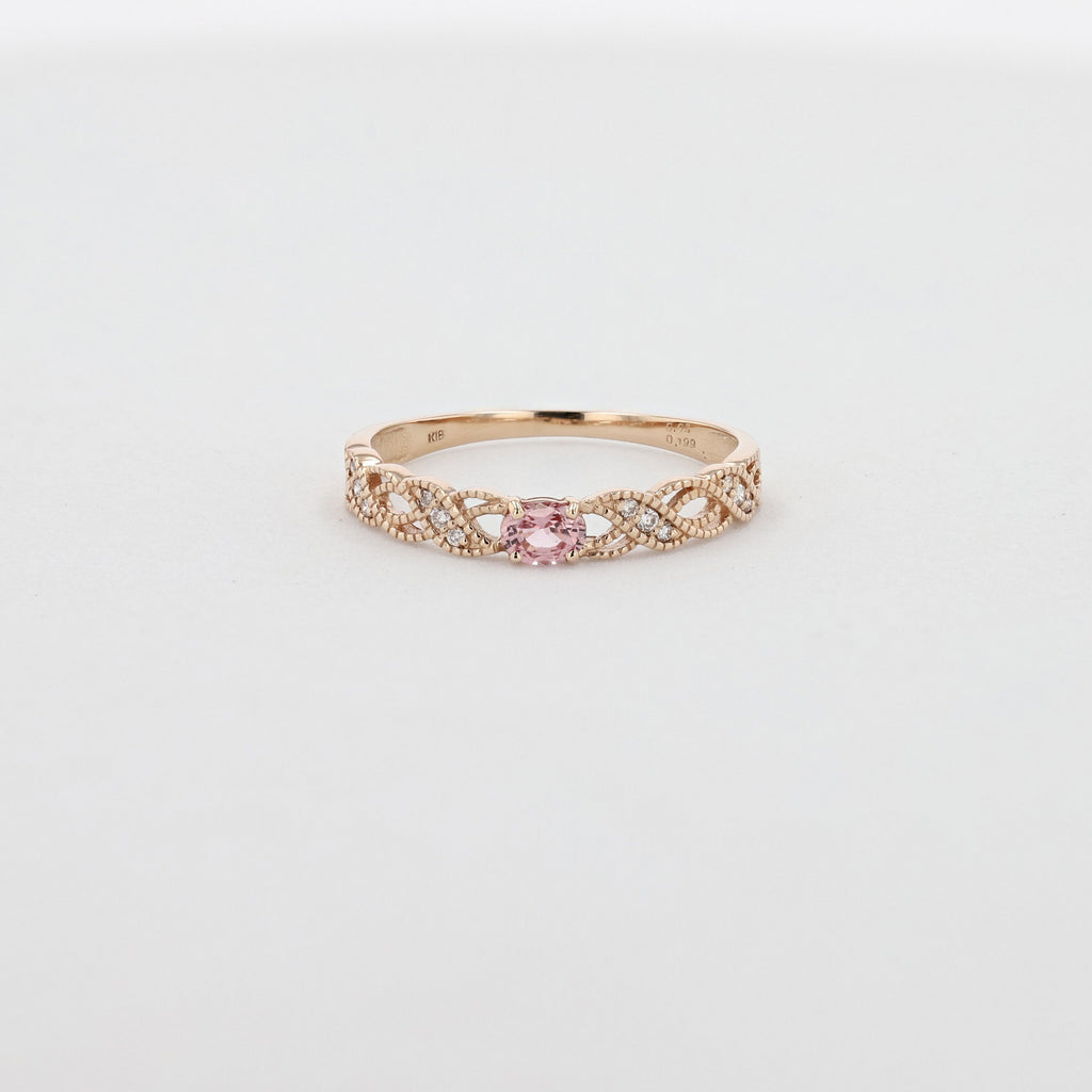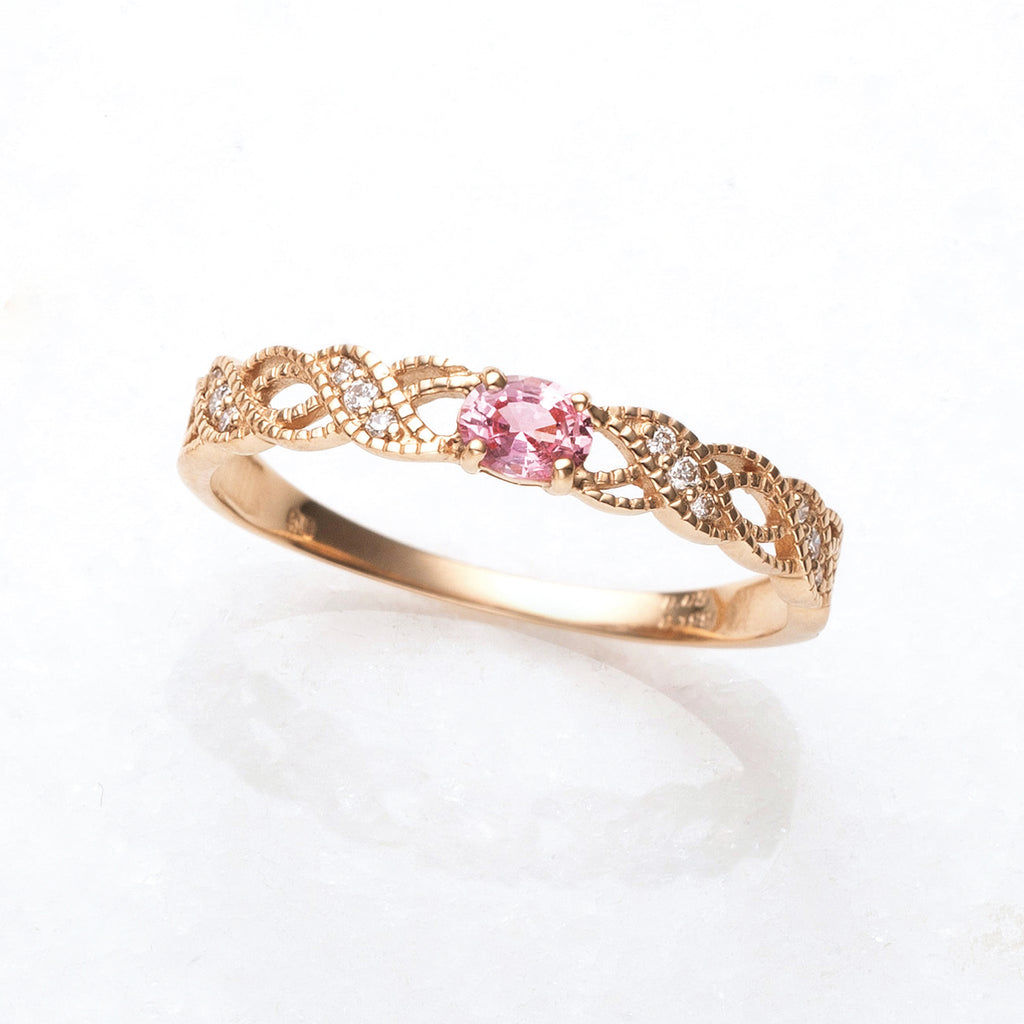 リングの幅とほぼ同じサイズの小ぶりなパパラチアサファイアをセットしたリングです。パパラチアサファイアの色と相性抜群の18金ピンクゴールド製の枠にセットしてあります。