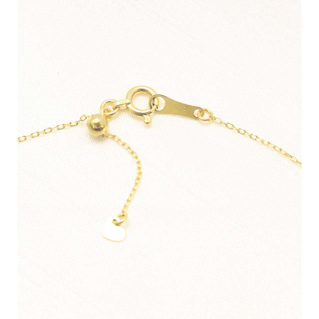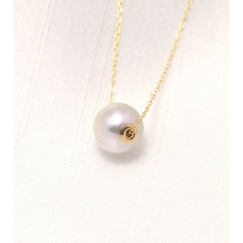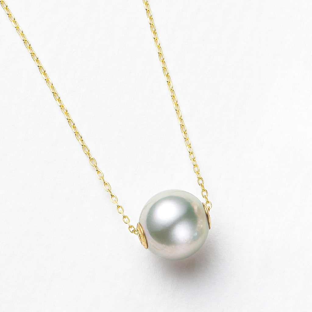 チェーンを通すためにアコヤパールに開けた穴は開けっ放しではなく、18金イエローゴールドのキャップ状のパーツを付けた丁寧なつくりになっています。