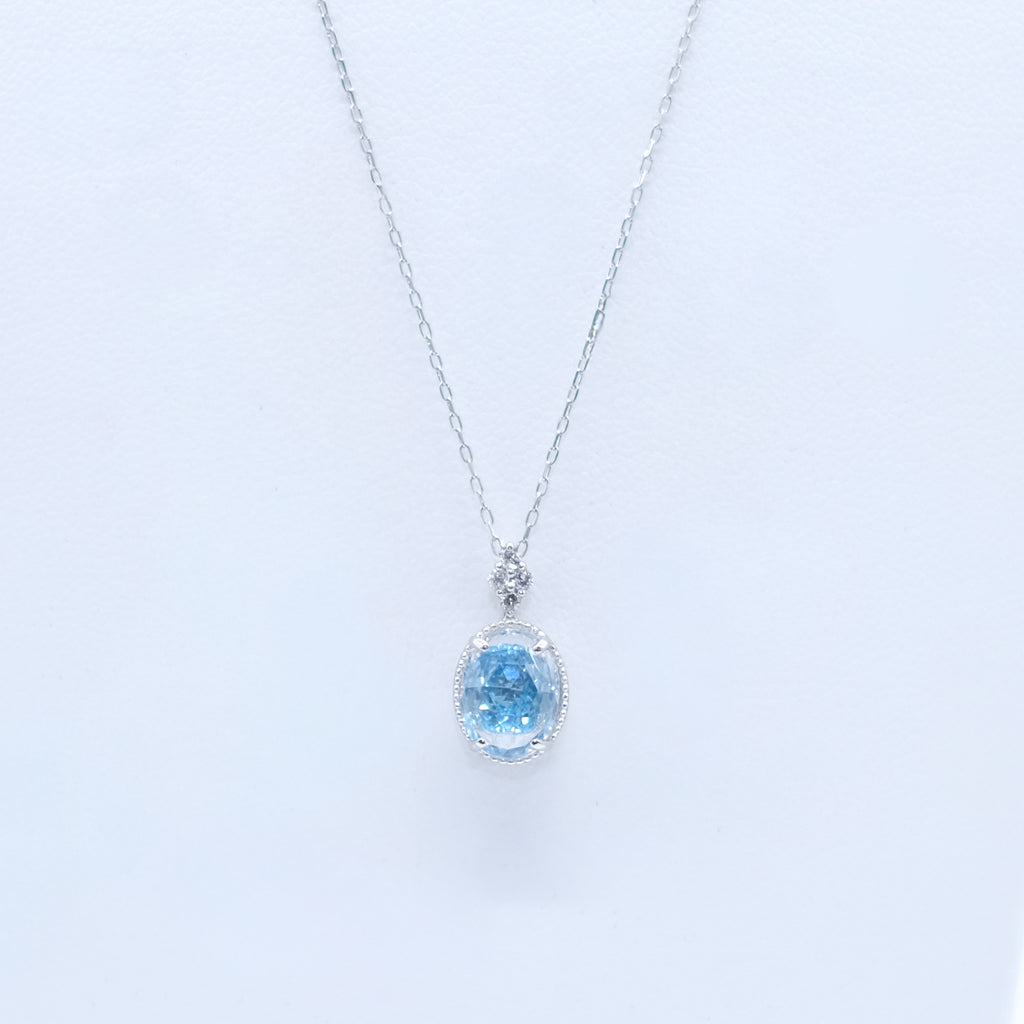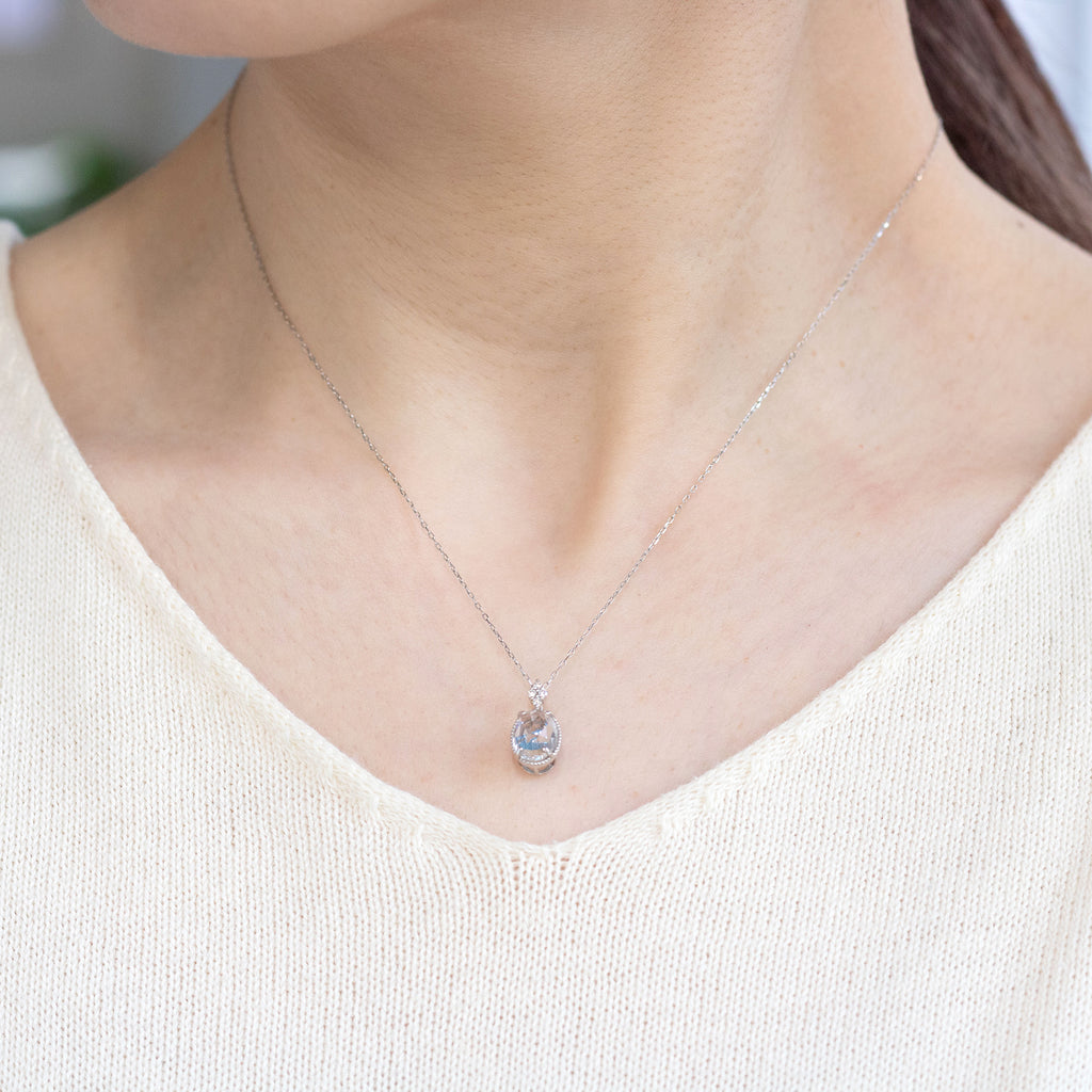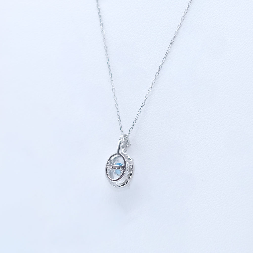 無色透明のロッククリスタル越しに揺れるブルートパーズの輝きを楽しめる、今までになかった特殊な構造のネックレスです。