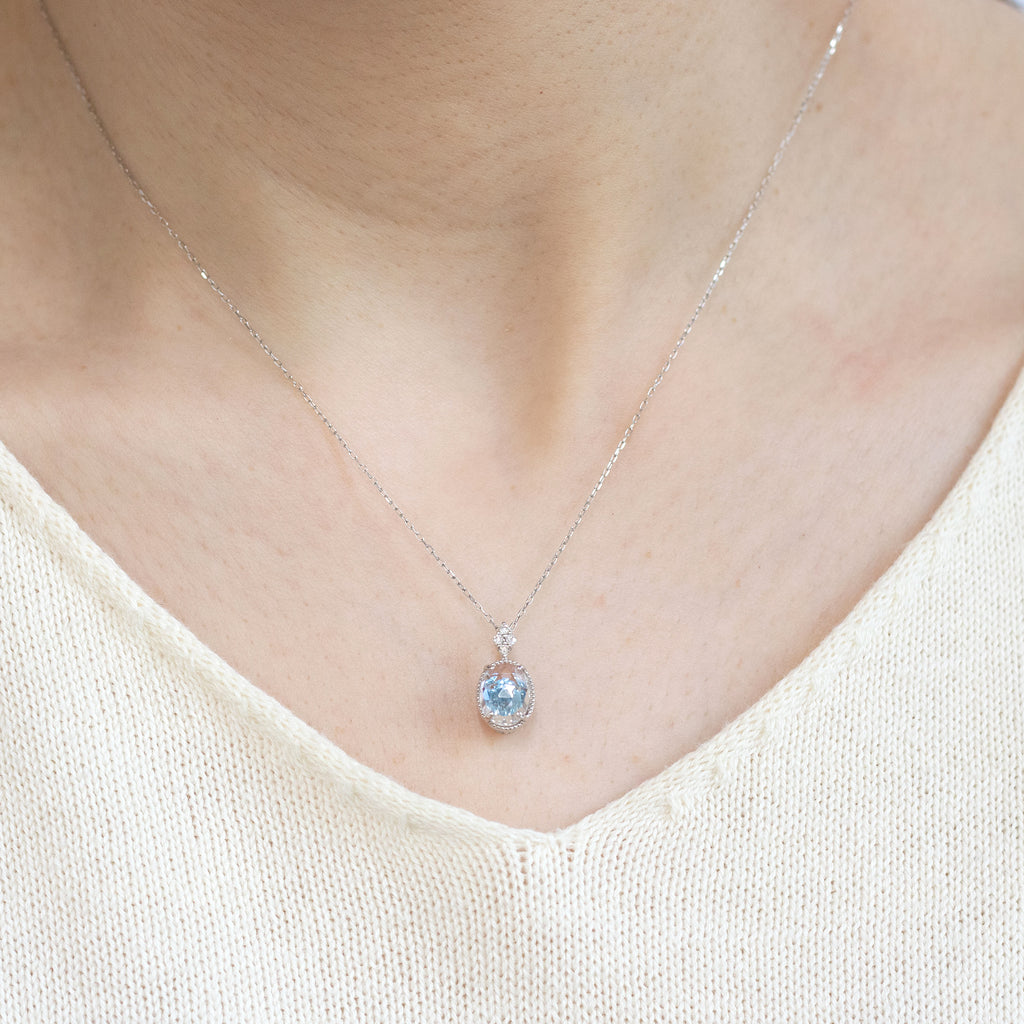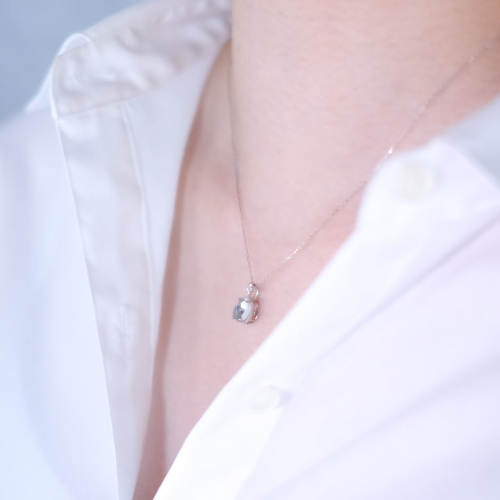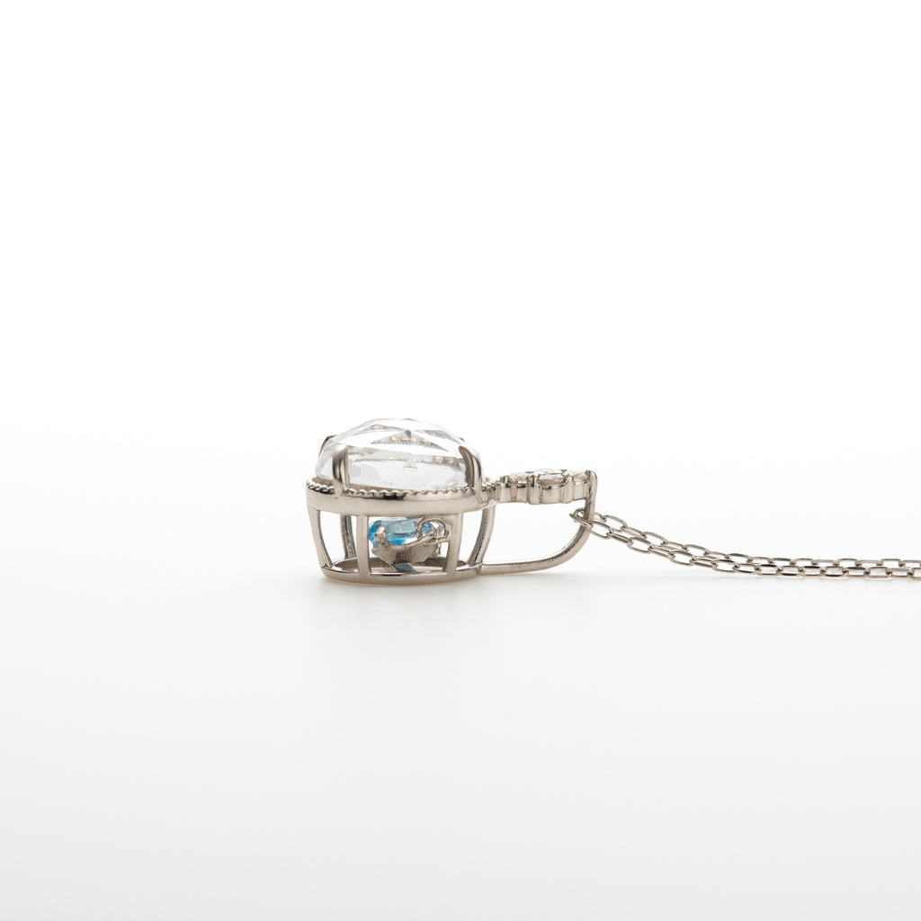 ペンダントトップに留められているのはローズカットが施されたロッククリスタルです。高さのあるセッティングで留めたロッククリスタルの下にはダンシングストーンセッティングにしたブルートパーズが留められています。