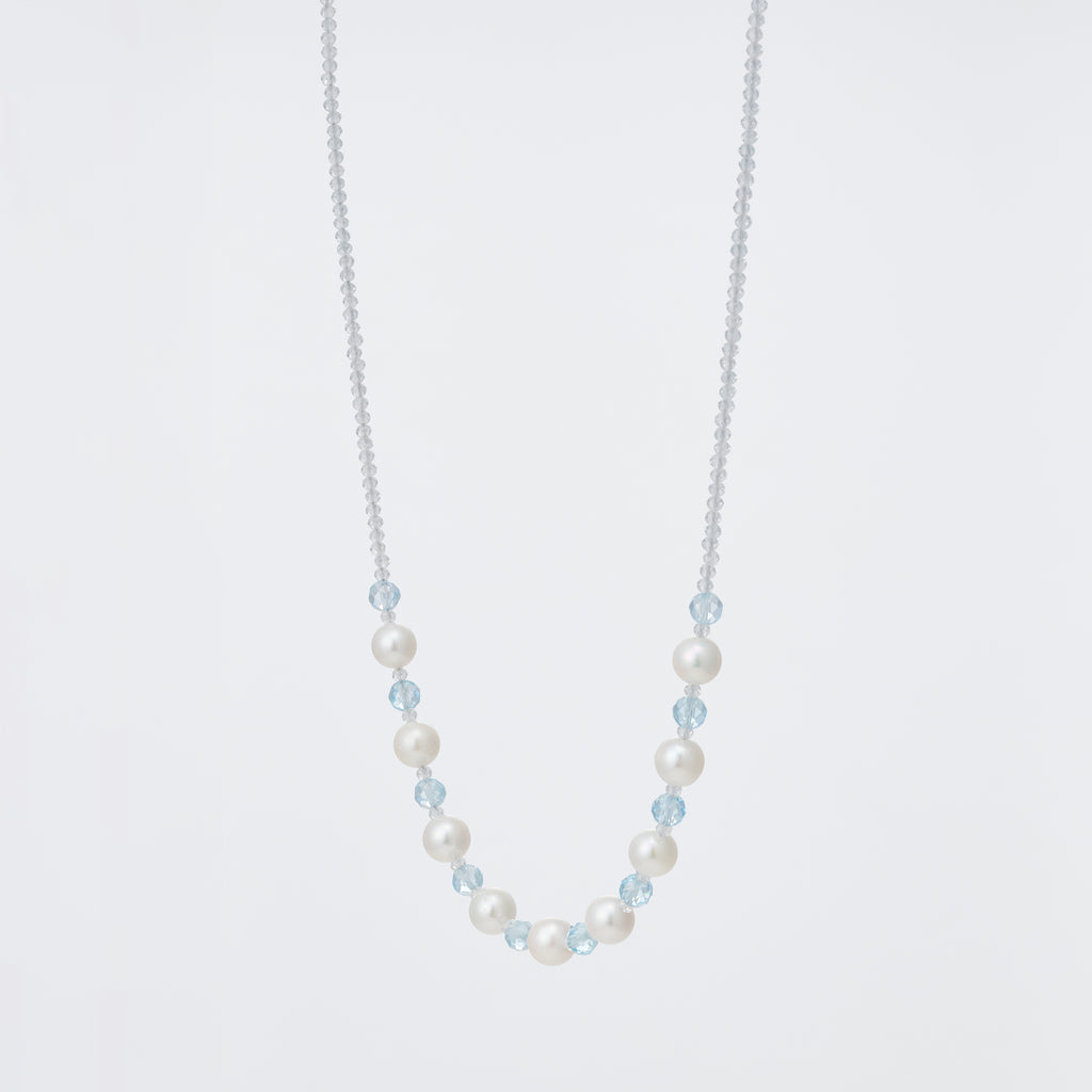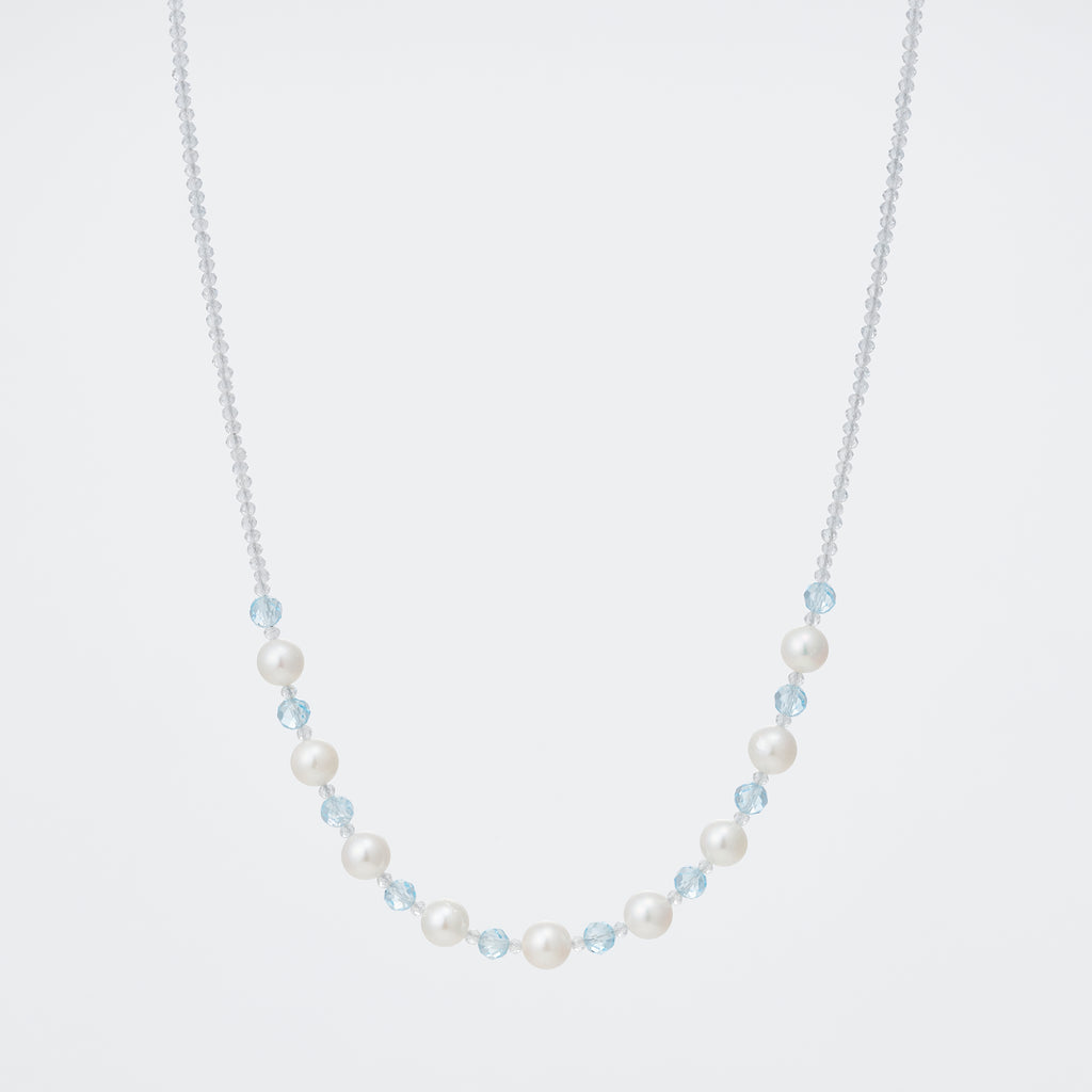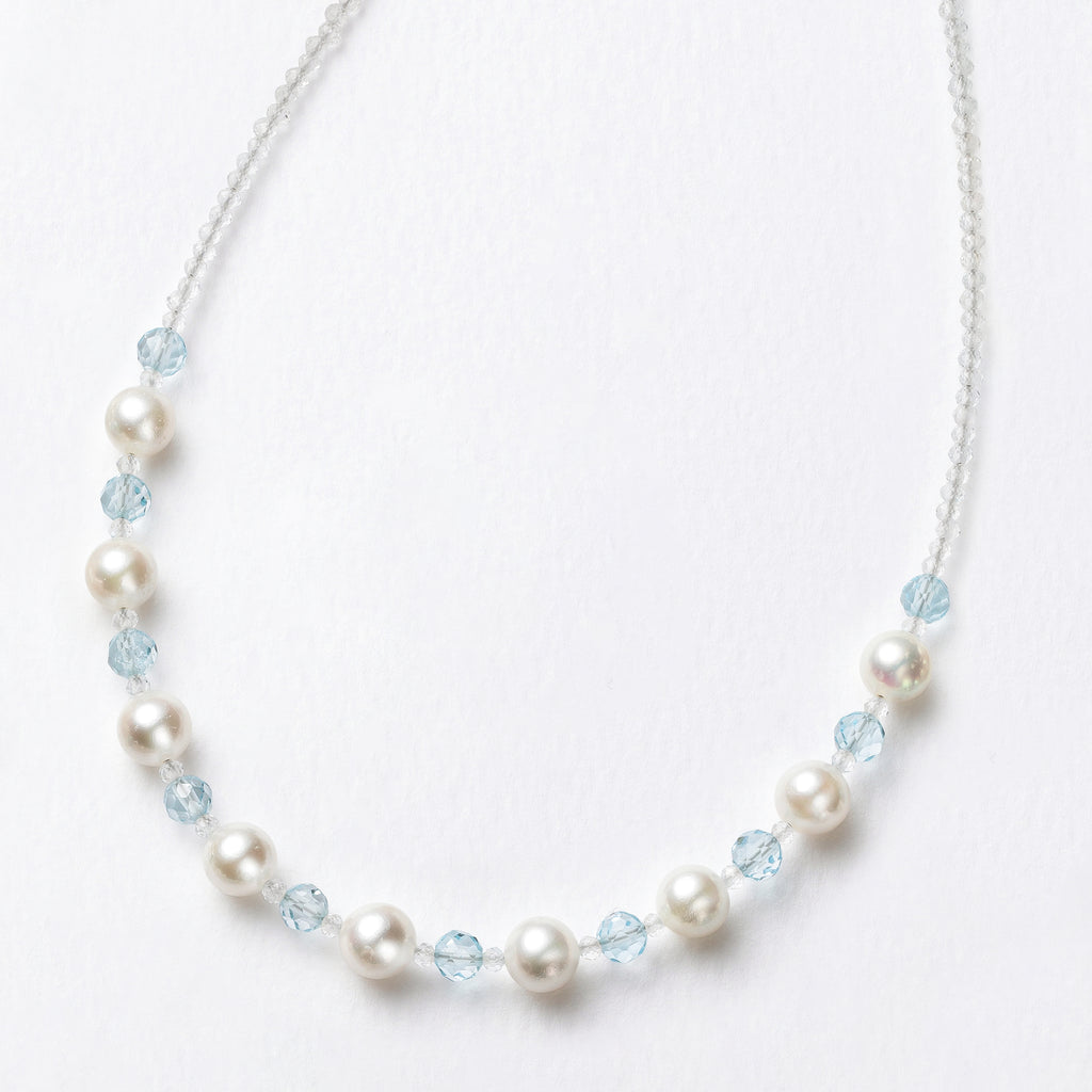白とブルーの組み合わせが爽やかで春にぴったりなネックレスです。 上品な光沢感が美しいアコヤパールと、爽やかなブルーのブルートパーズ、キラキラと輝く無色透明のホワイトトパーズを組み合わせました。