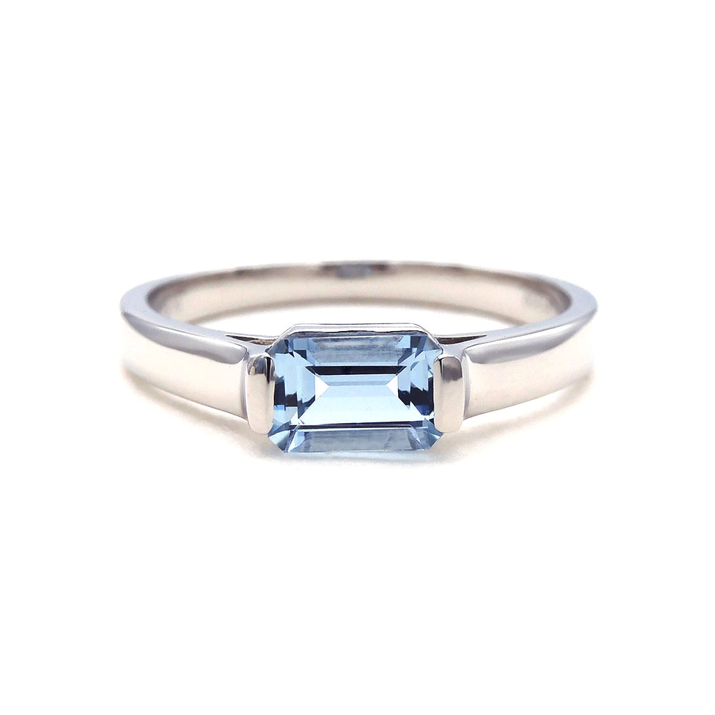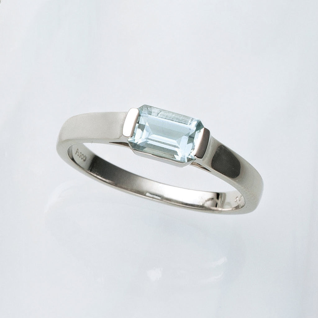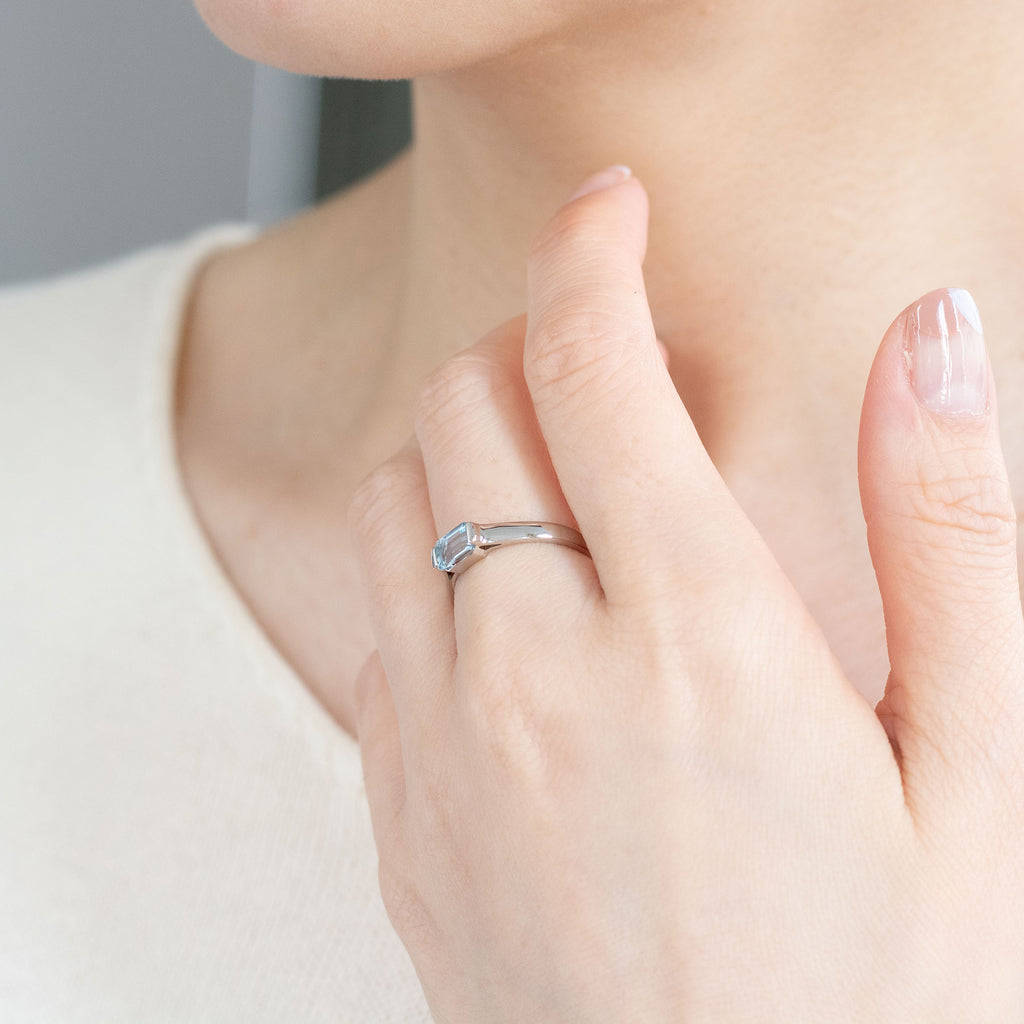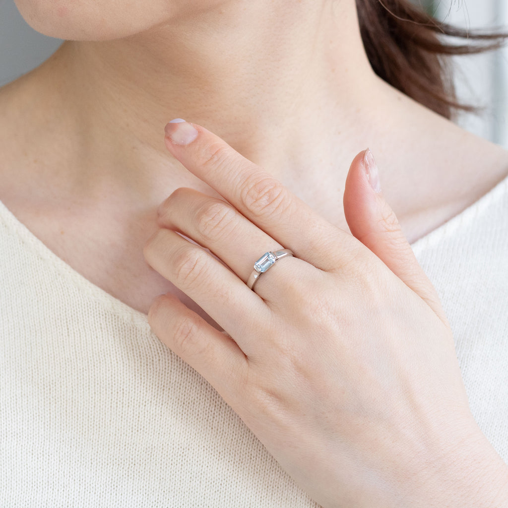 端正な印象のエメラルドカットを横向きにセット。プラチナの枠で挟むこむようにセットした洗練されたデザインのリングです。