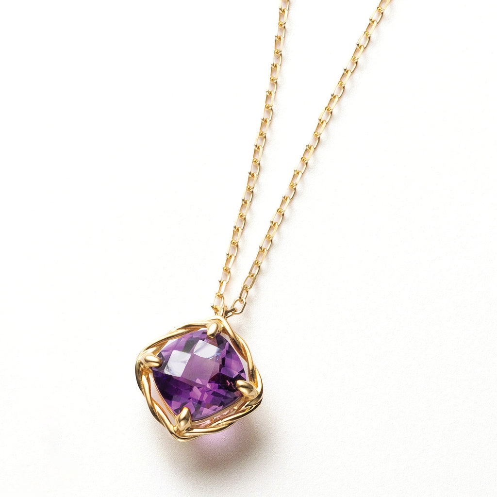 大粒1ctのアメシストを10金イエローゴールド製の金線をよじったようなデザインにセット。アメシストの紫色がイエローゴールドに映えて大人っぽい印象です。