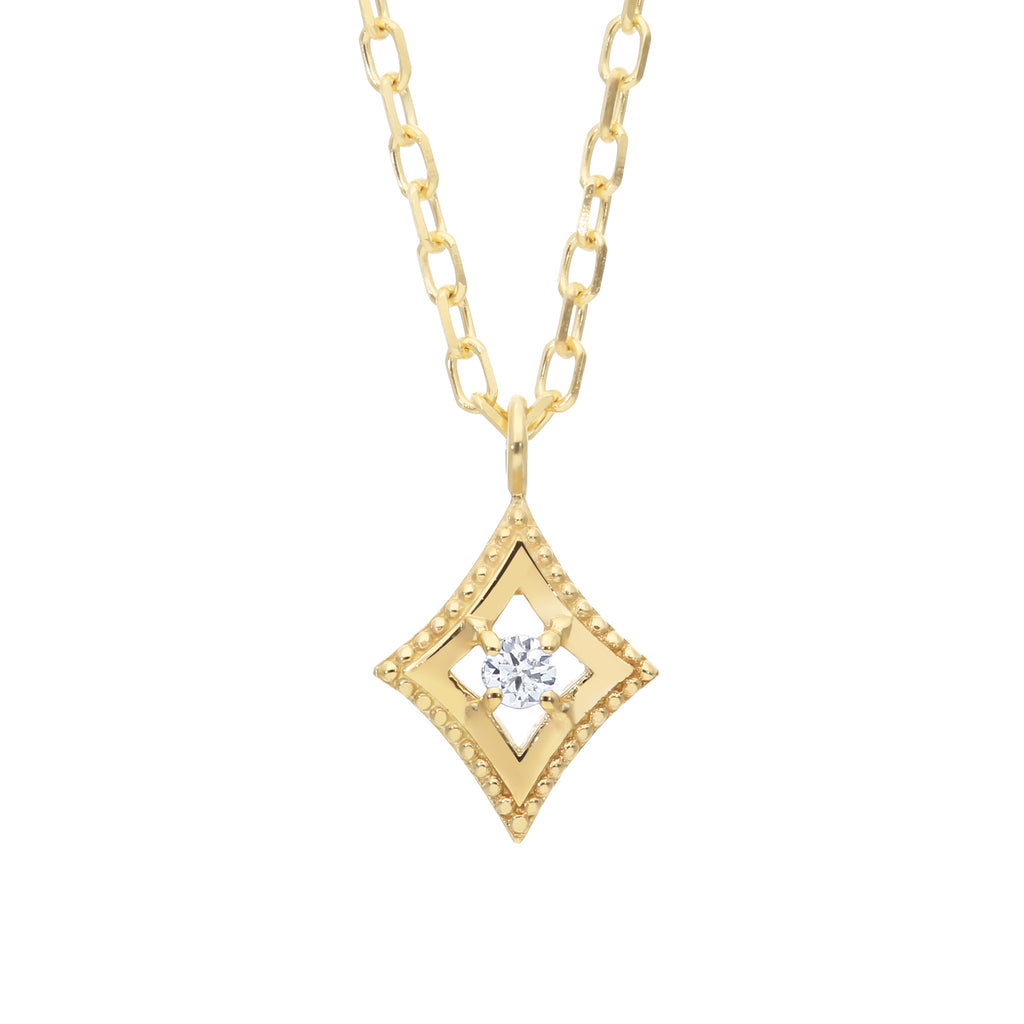 ダイヤ形のペンダントトップの縁部分を繊細なミル打ち風のテクスチャーで取り巻いてあり、小ぶりながらも細部まで凝ったつくりになっています。