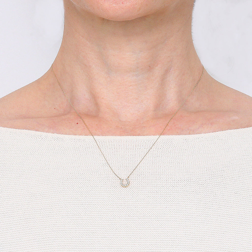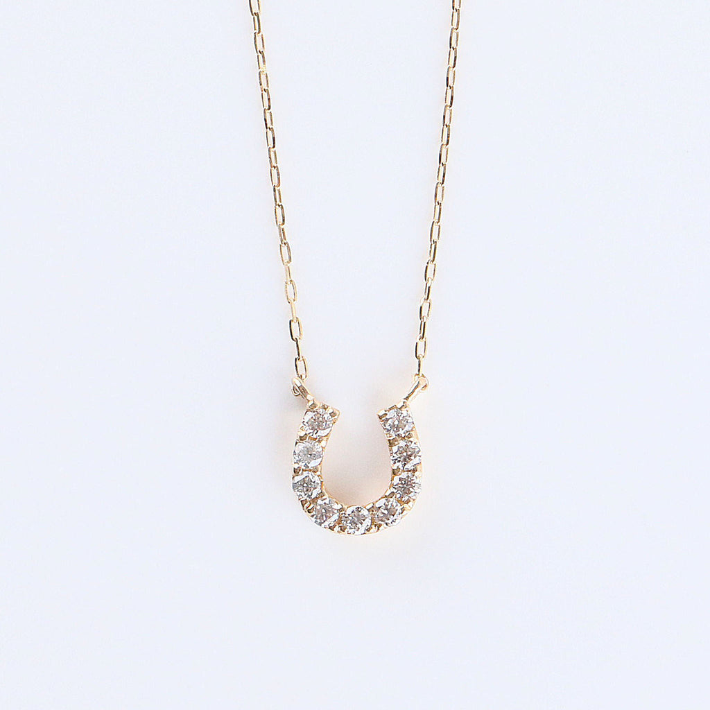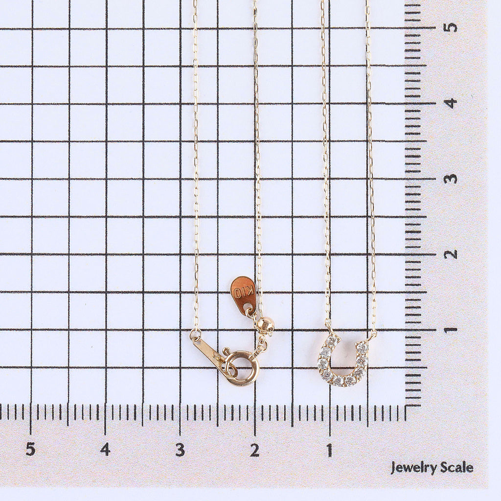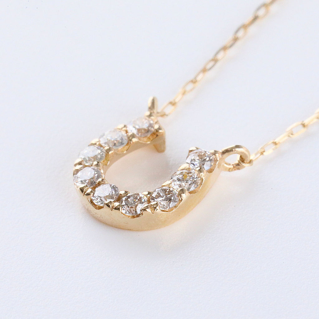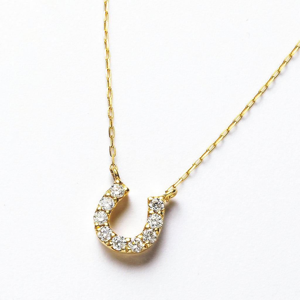 ラッキーモチーフとして大人気の馬蹄の形にメレダイヤを留めた10金イエローゴールド製のネックレスです。