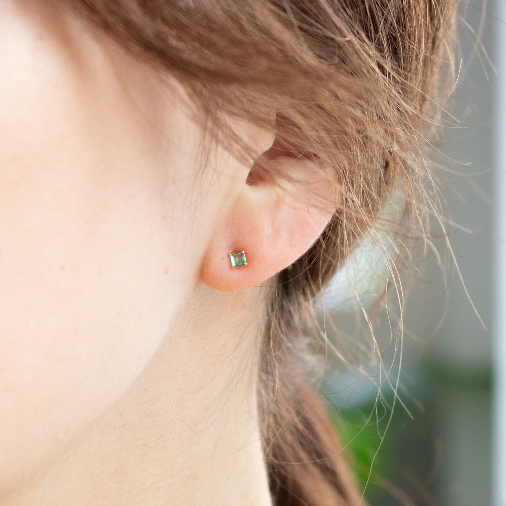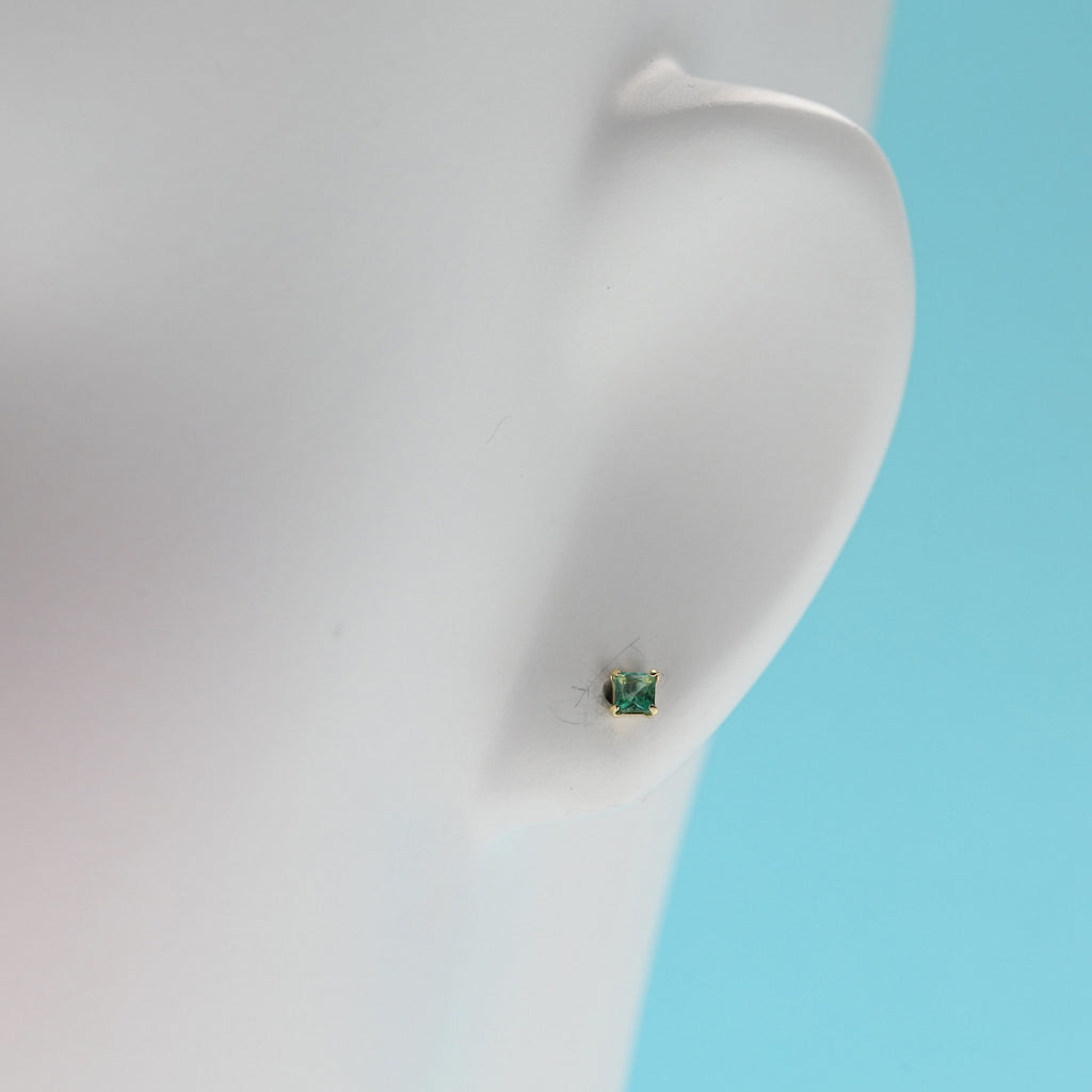 すっきりとモダンな印象のスクエアカットのエメラルドを4本の爪でセットしたベーシックなスタッドタイプのピアスです。