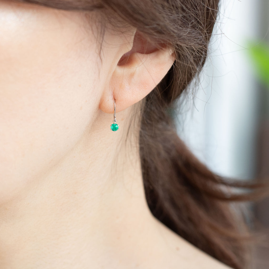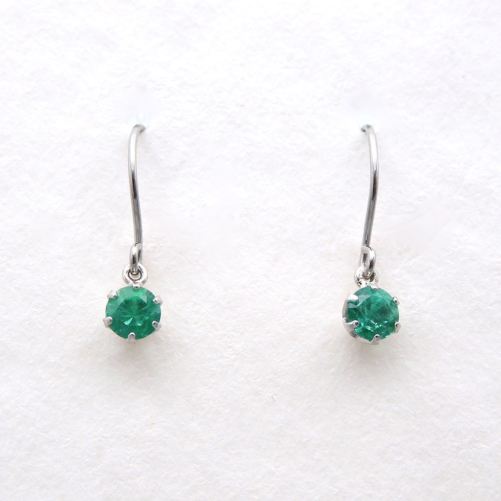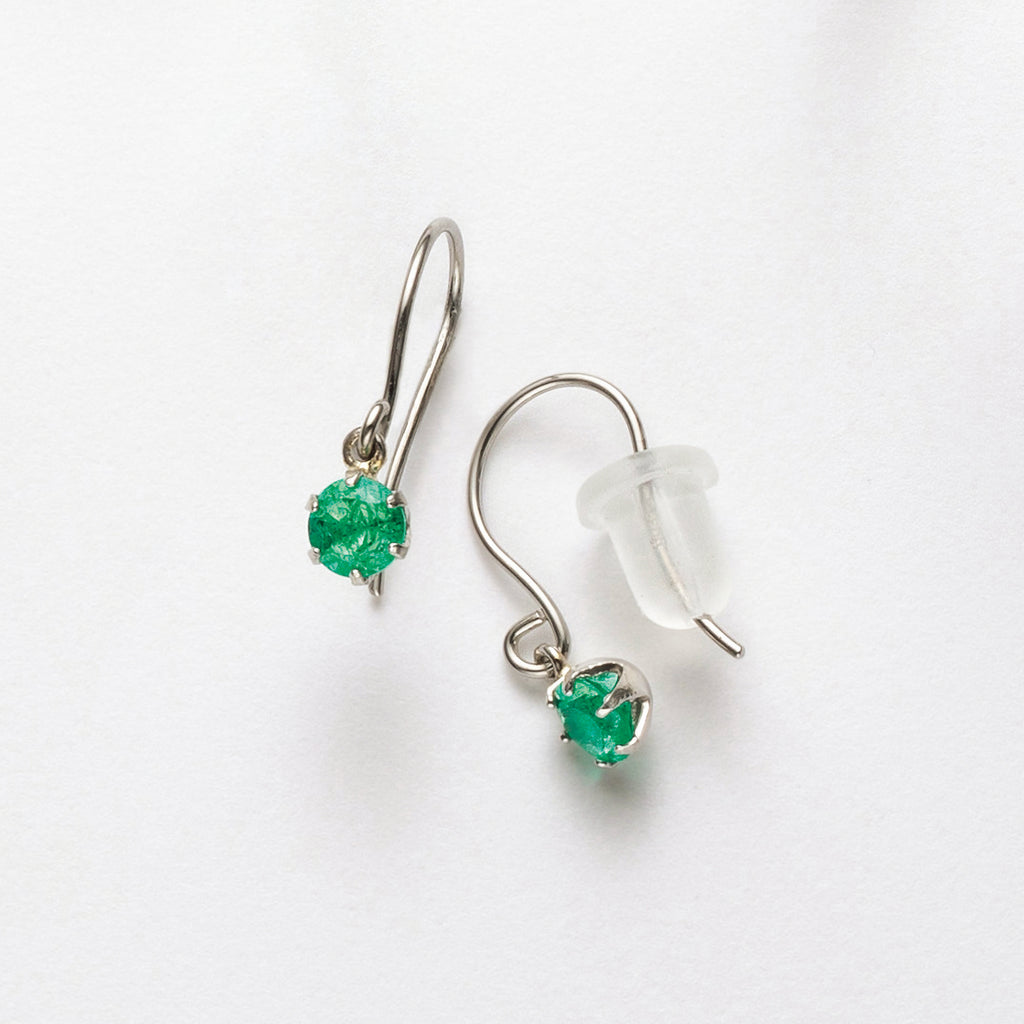 小ぶりなラウンドカットのエメラルドをプラチナ製の枠にセット。着けやすいフック式ピアス金具の下に丸環で留めた、よく揺れるデザインにしました。