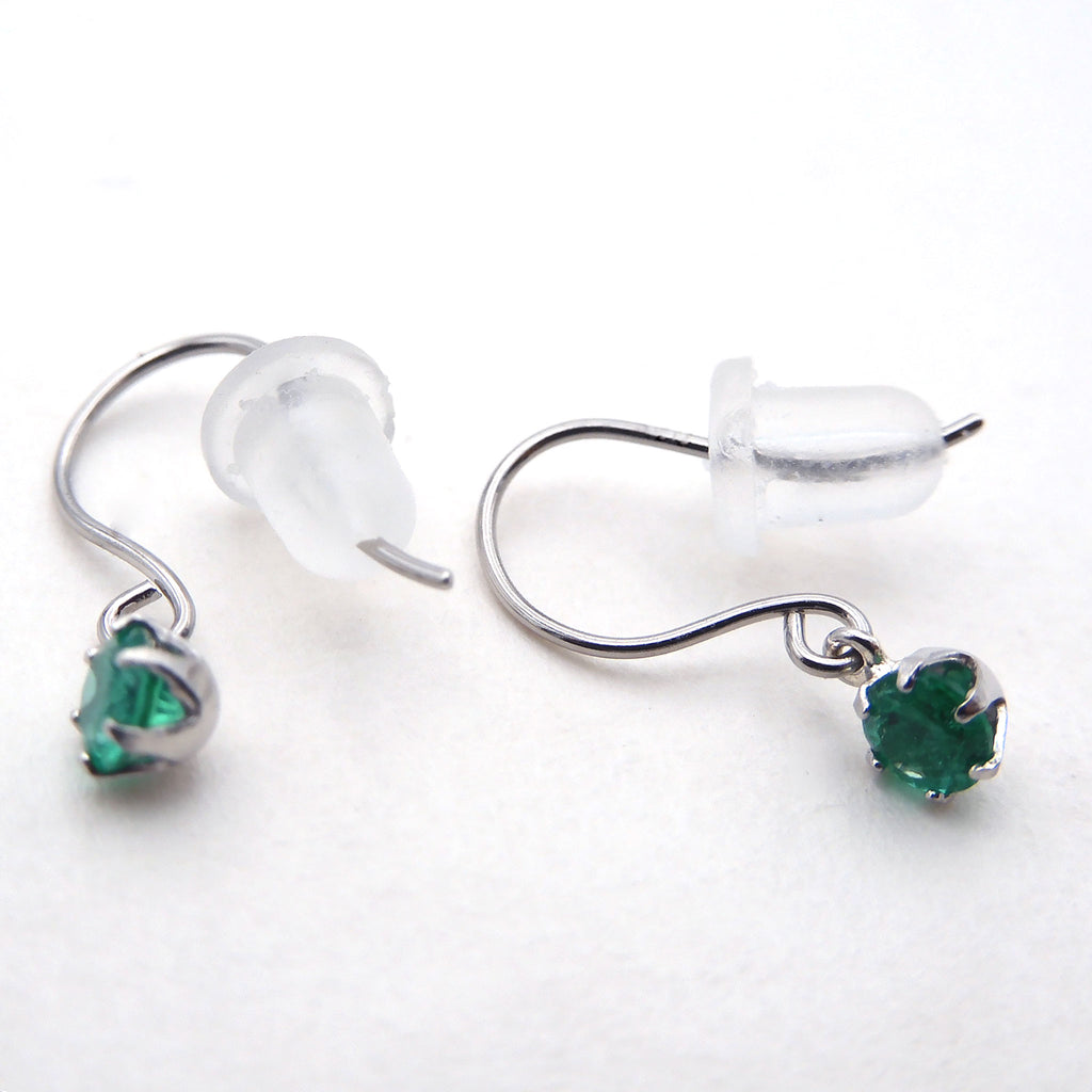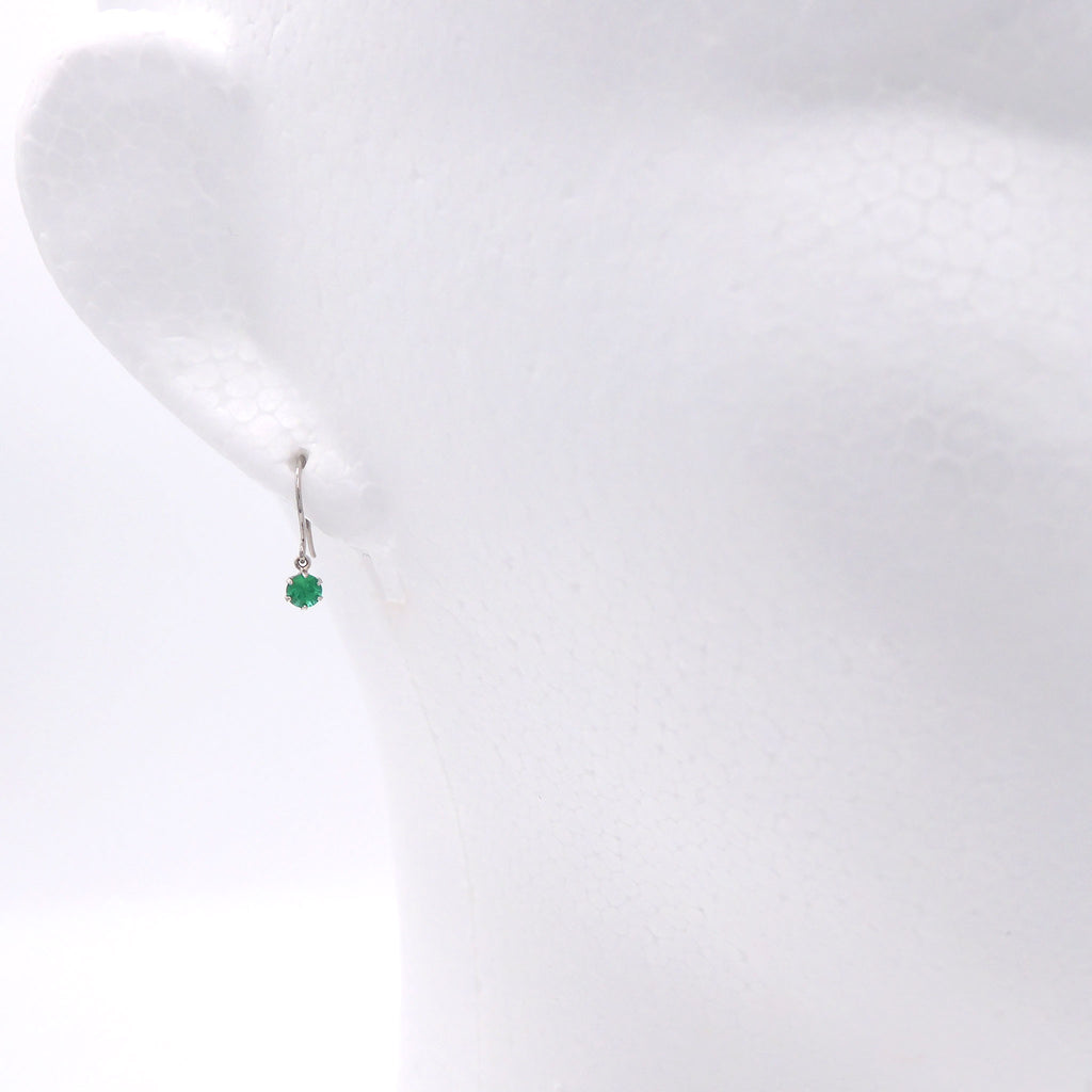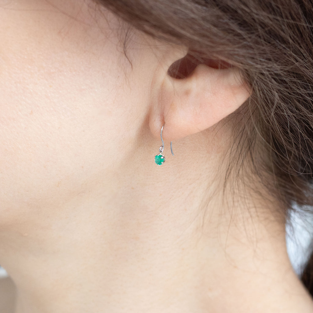 小ぶりなラウンドカットのエメラルドをプラチナ製の枠にセット。着けやすいフック式ピアス金具の下に丸環で留めた、よく揺れるデザインにしました。