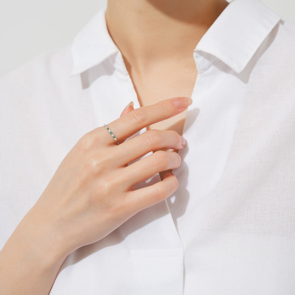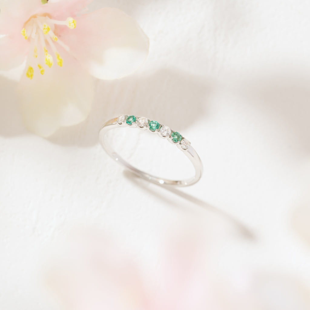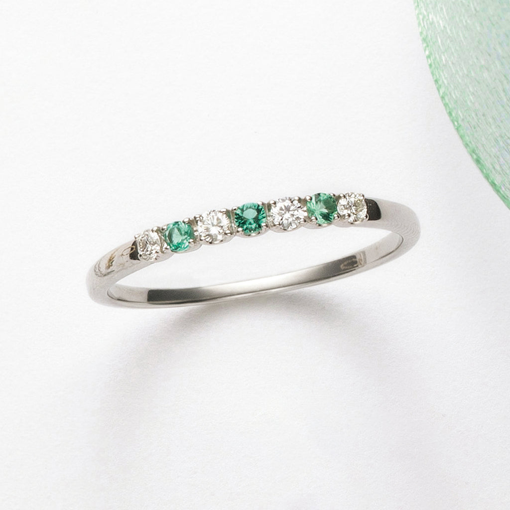 見る者を癒してくれる美しいグリーンが魅力的なエメラルドを、キラキラと輝くメレダイヤと交互に一列にセットしたリングです。