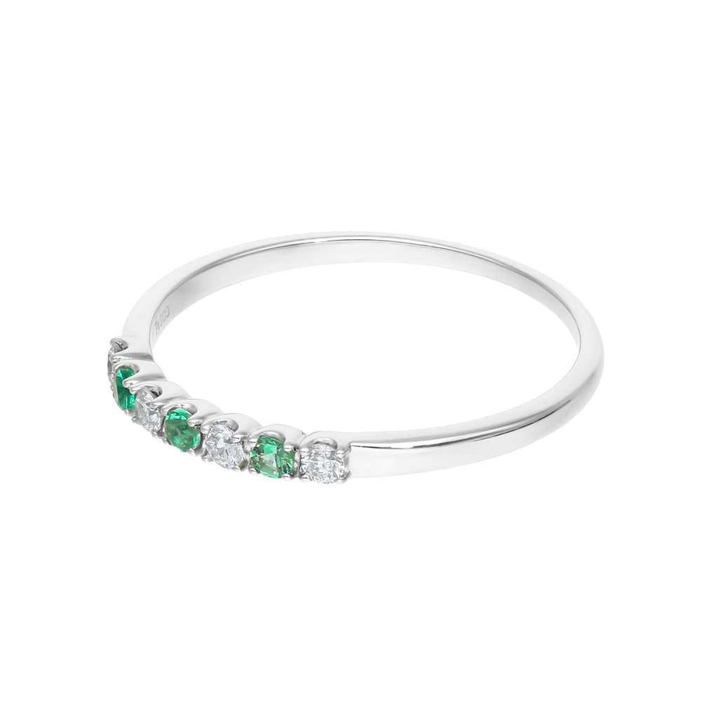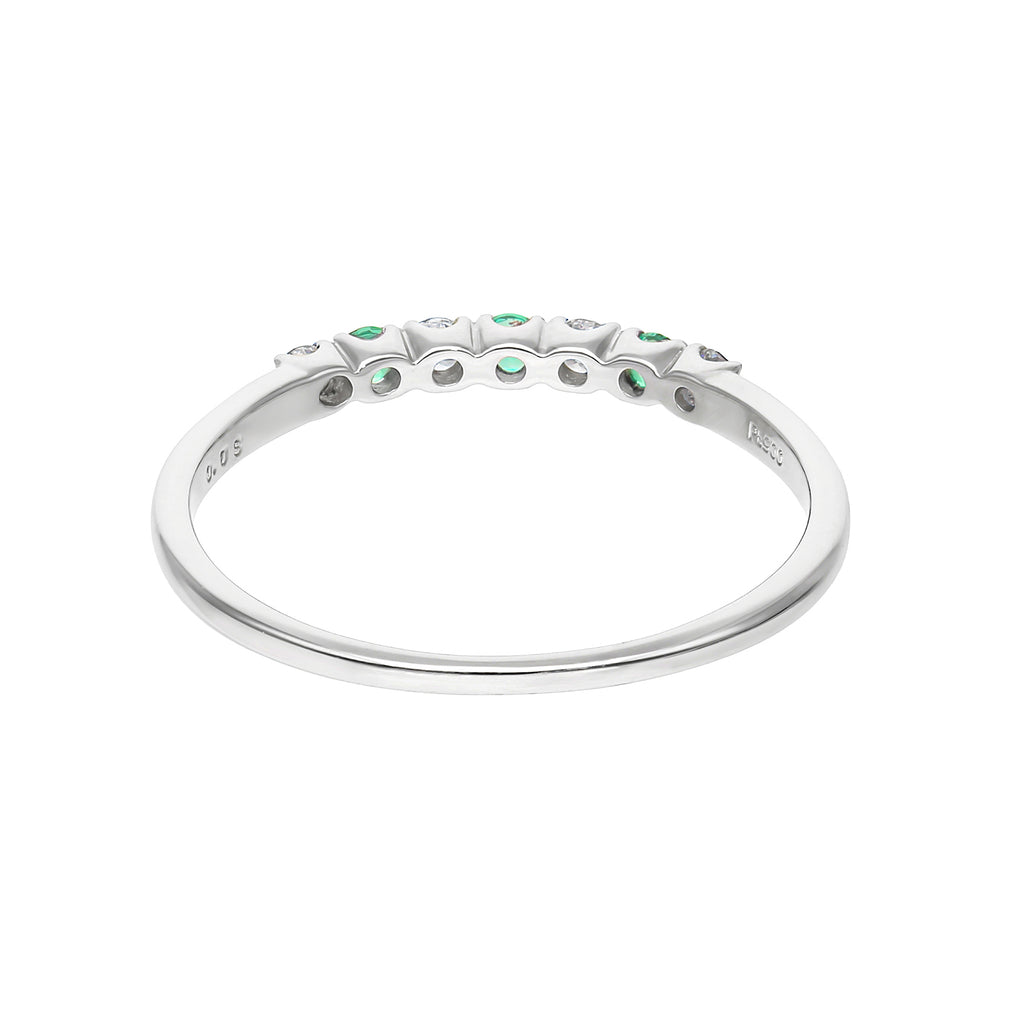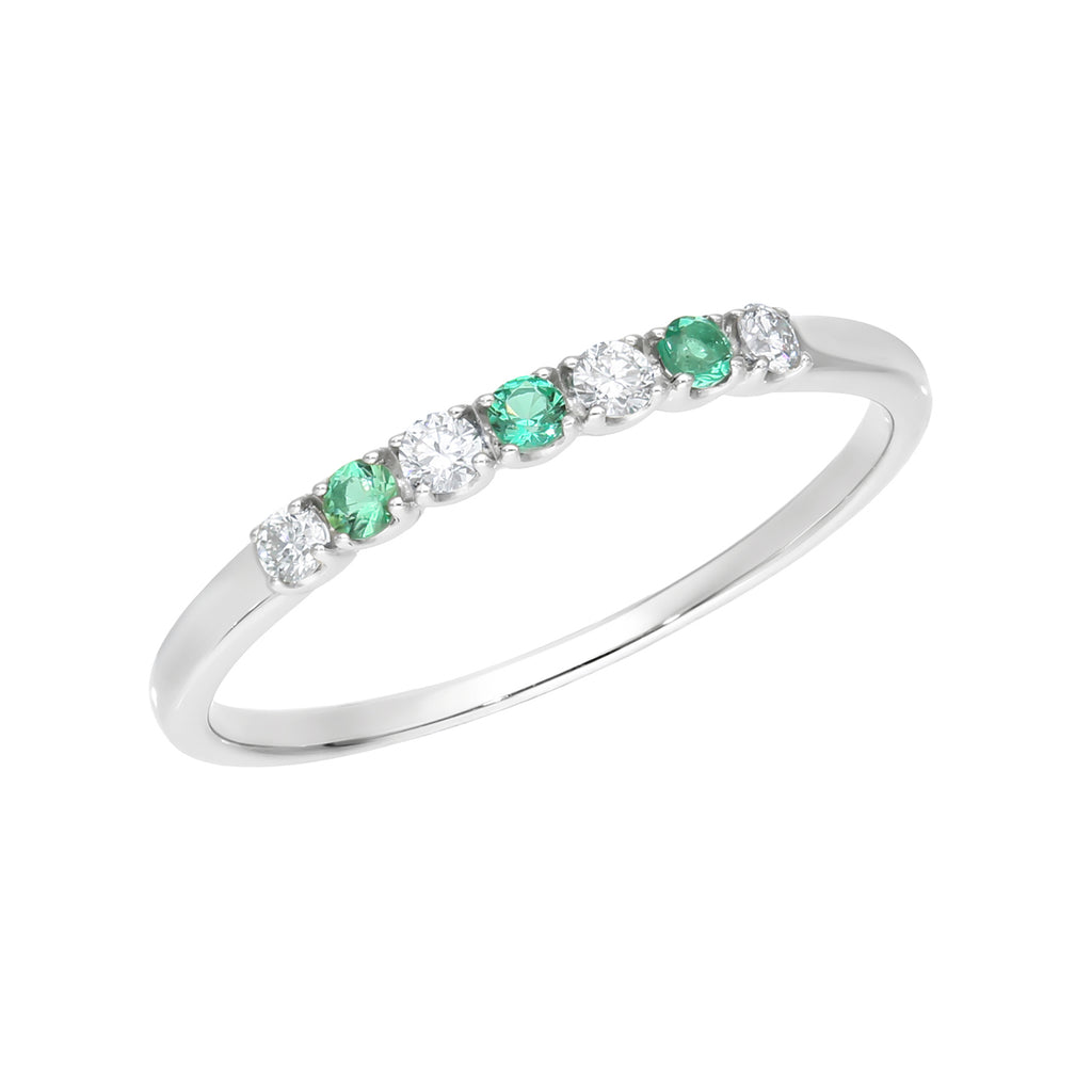 見る者を癒してくれる美しいグリーンが魅力的なエメラルドを、キラキラと輝くメレダイヤと交互に一列にセットしたリングです。