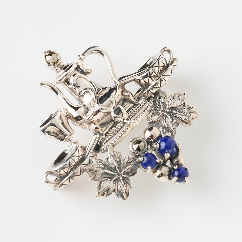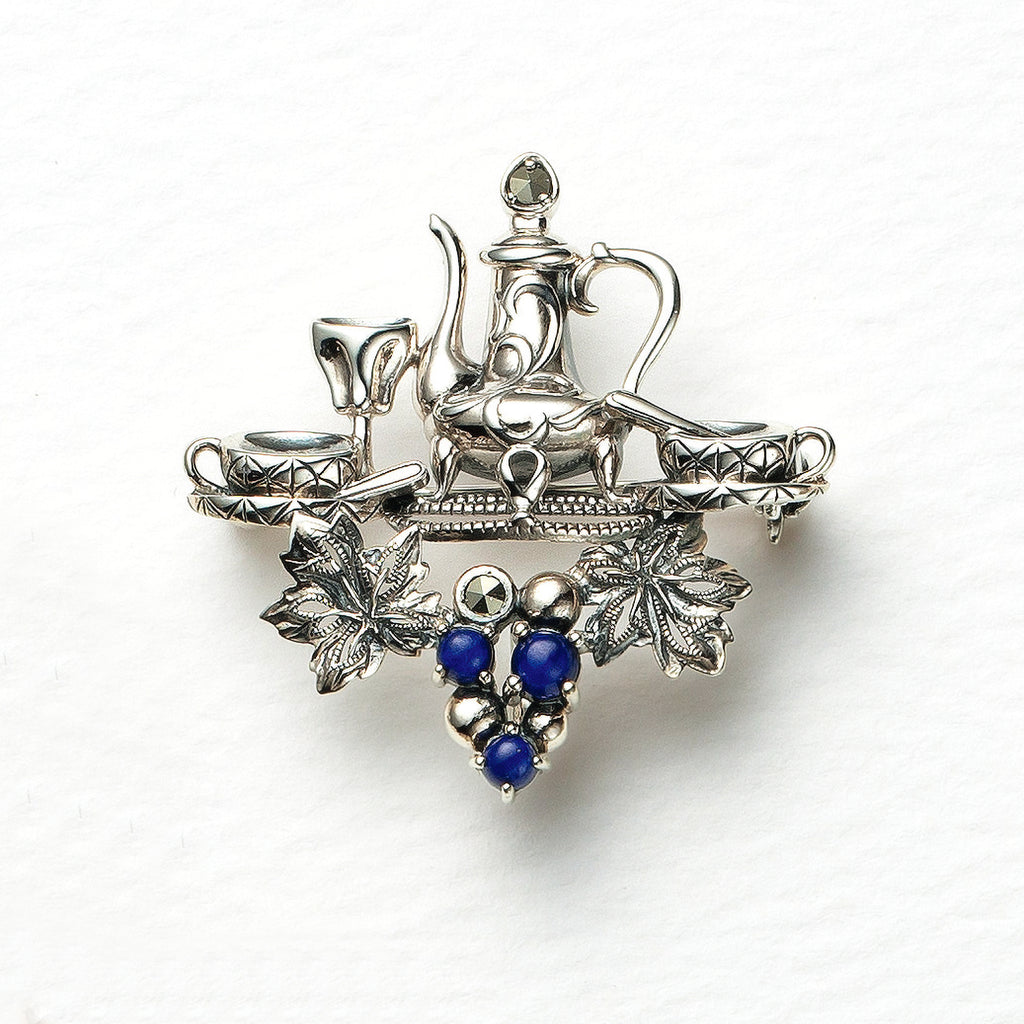 クラシカルな印象の銀製のティーセットとブドウのモチーフを組み合わせました。ブドウは「豊かさ」と「幸運」の象徴とされて人気のモチーフです。