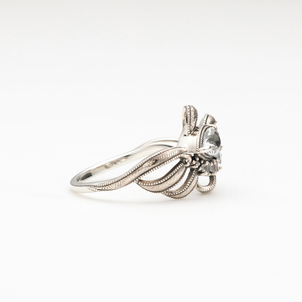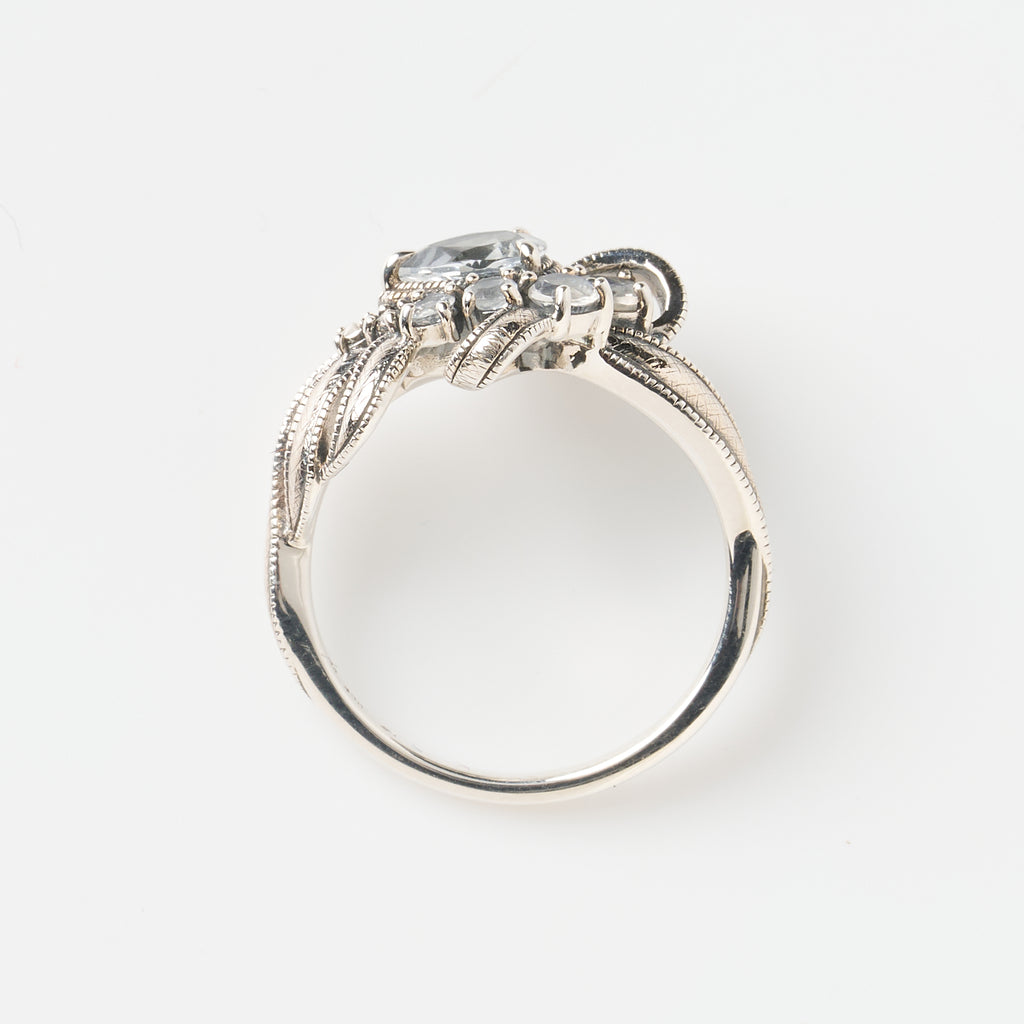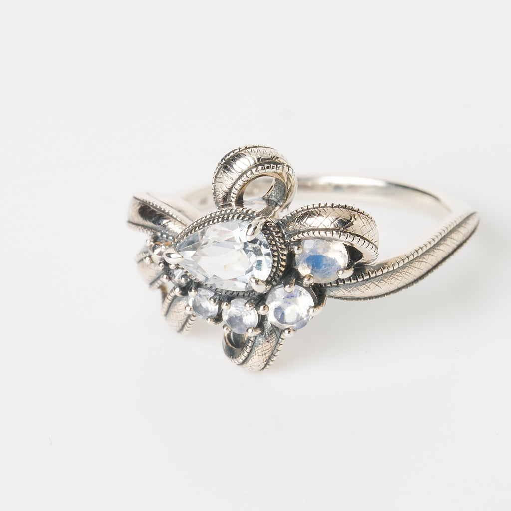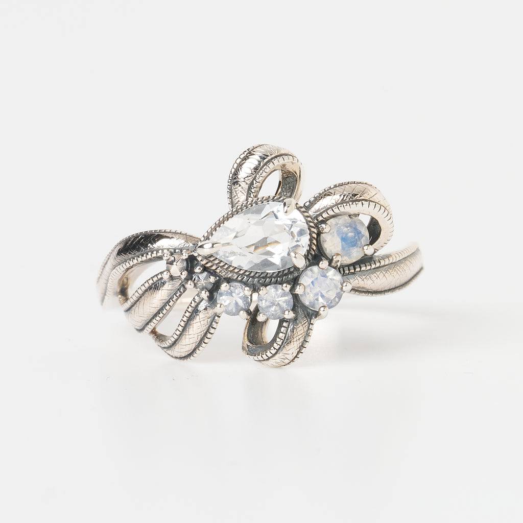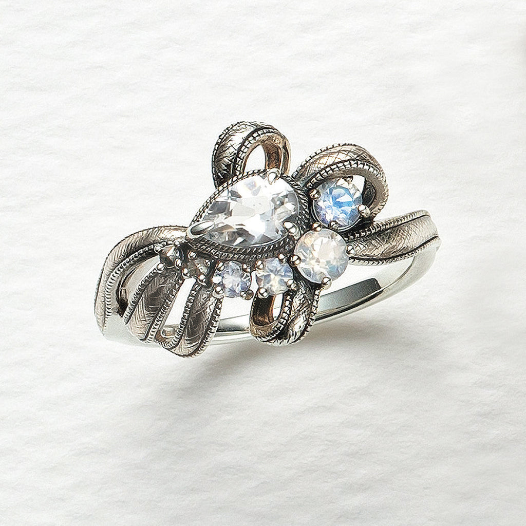 リボンの中央にはペアシェイプのホワイトトパーズと、ミステリアスなブルーの輝きを放つラブラドライトをセットしました。優しい輝きが魅力的です。