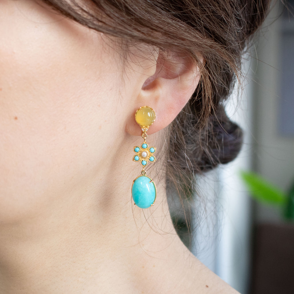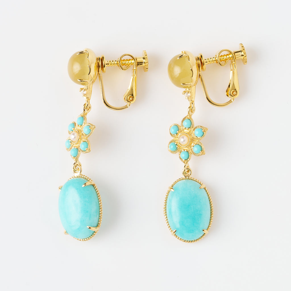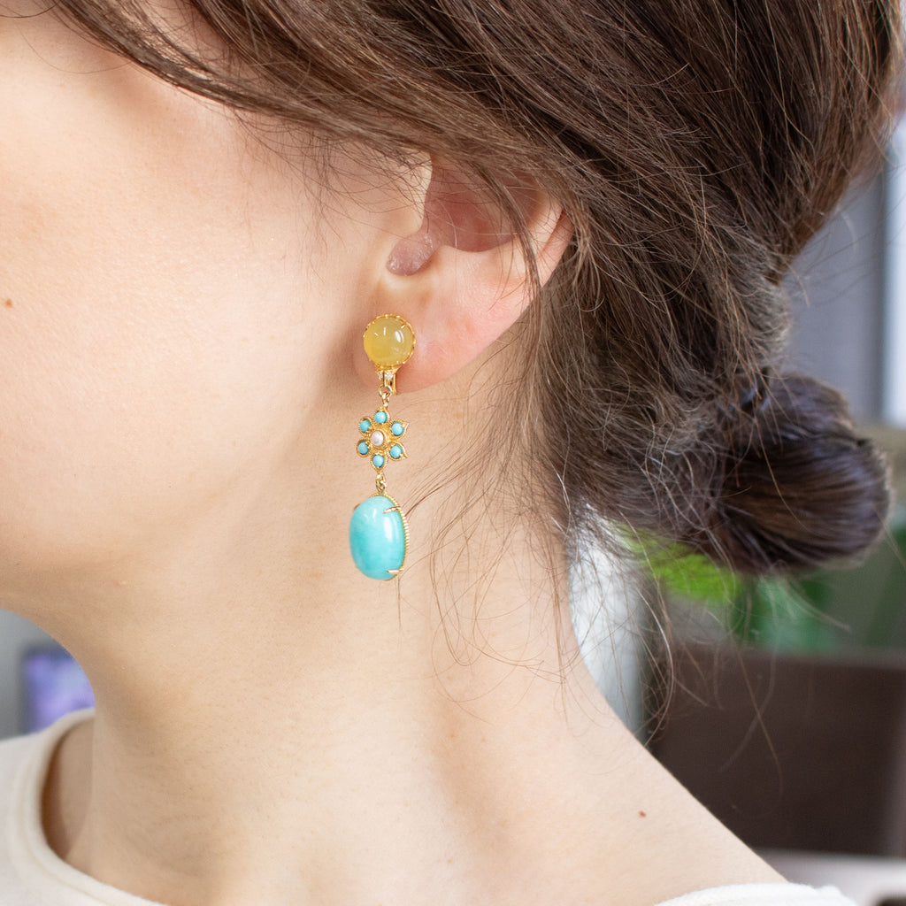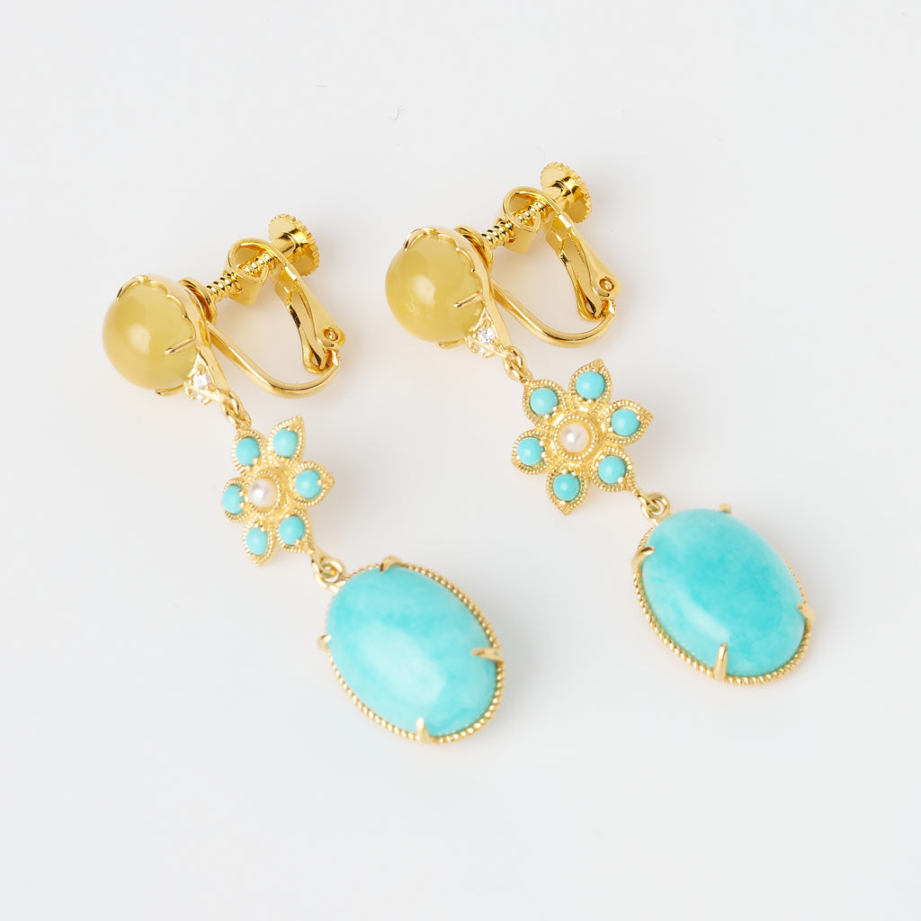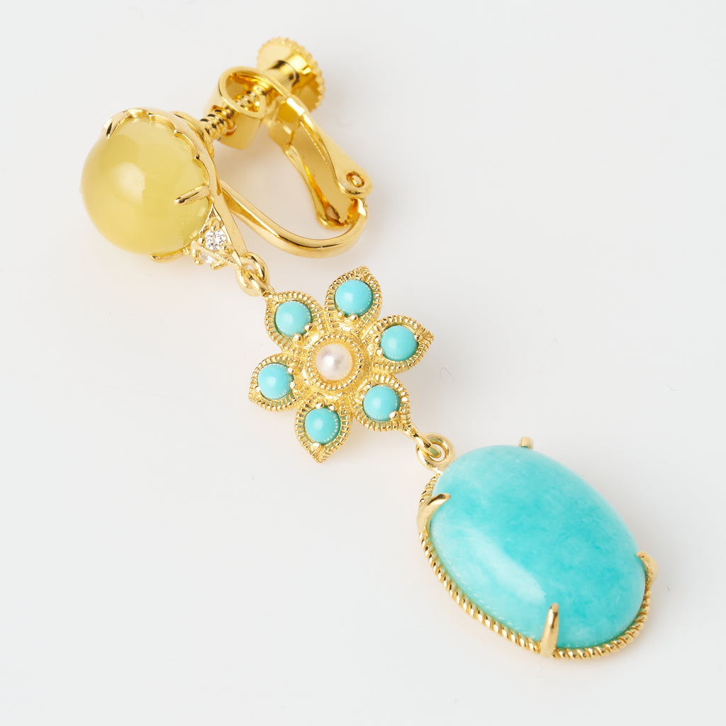 ふっくらとボリューミーなカラーストーンを使用。上からイエローカラーのカルセドニー、小粒のトルコ石をぐるりと留めたフラワーモチーフ、やや青みがかったグリーンがきれいな大粒のアマゾナイトを縦にセットしました。