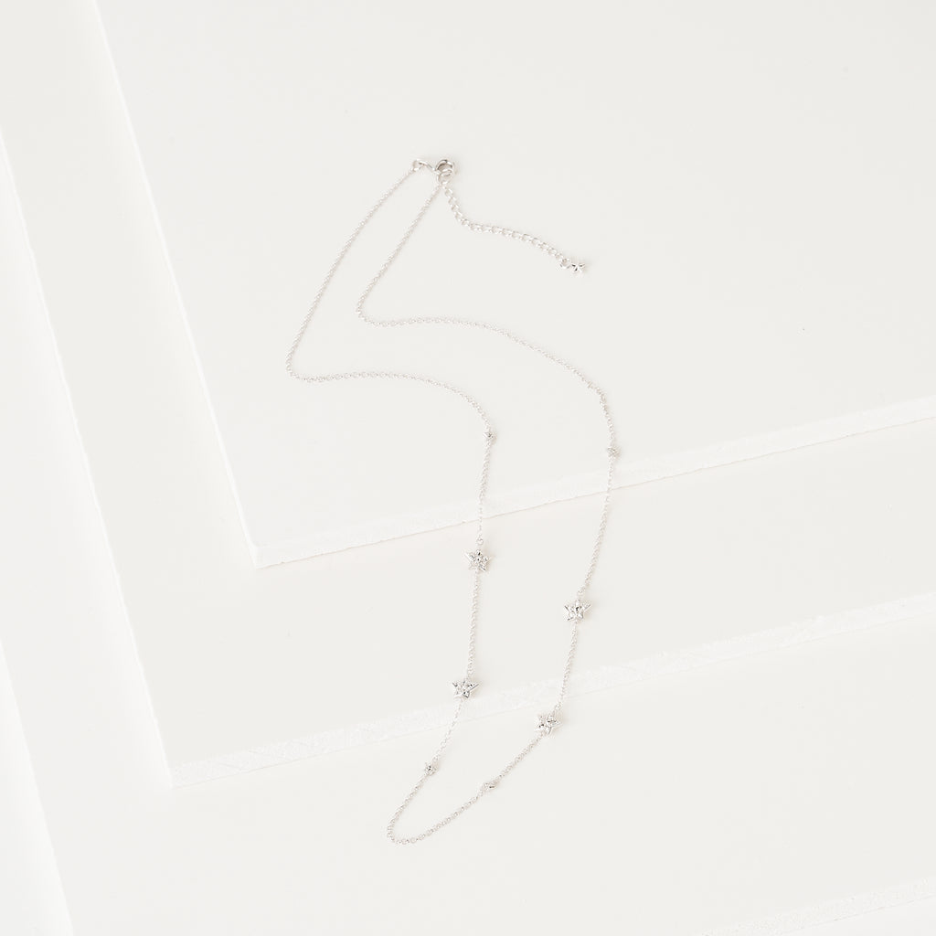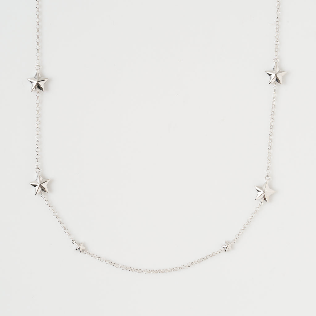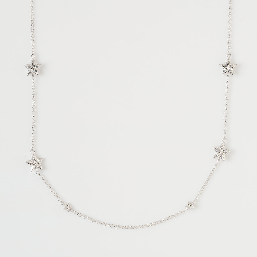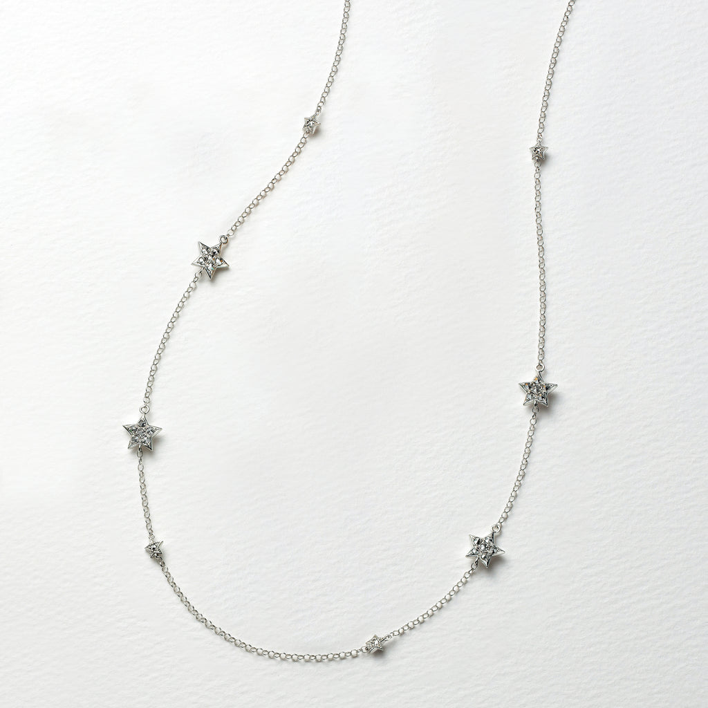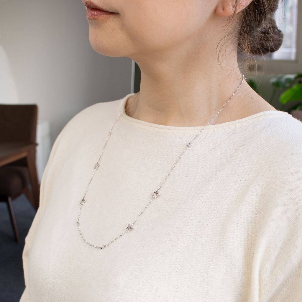 大小のスターモチーフが連ねられた全長約65cmのロングネックレスです。