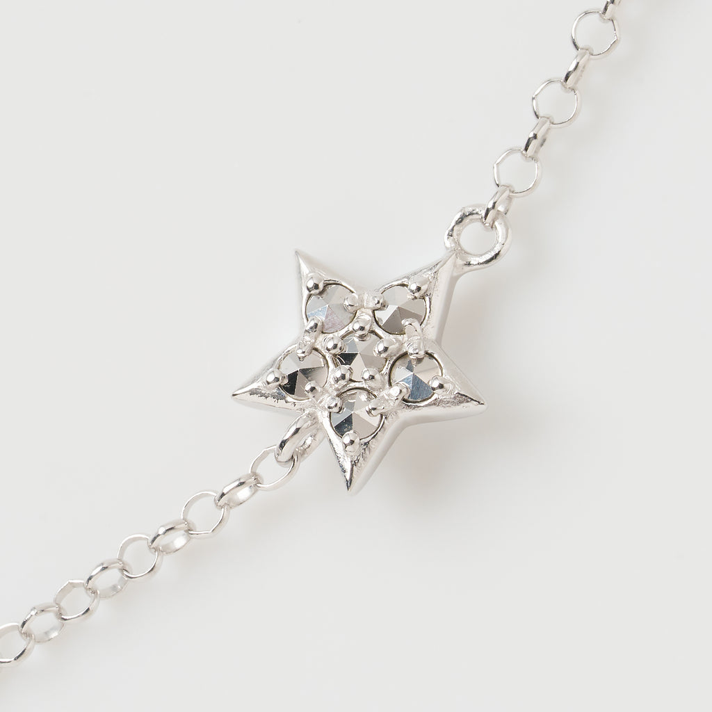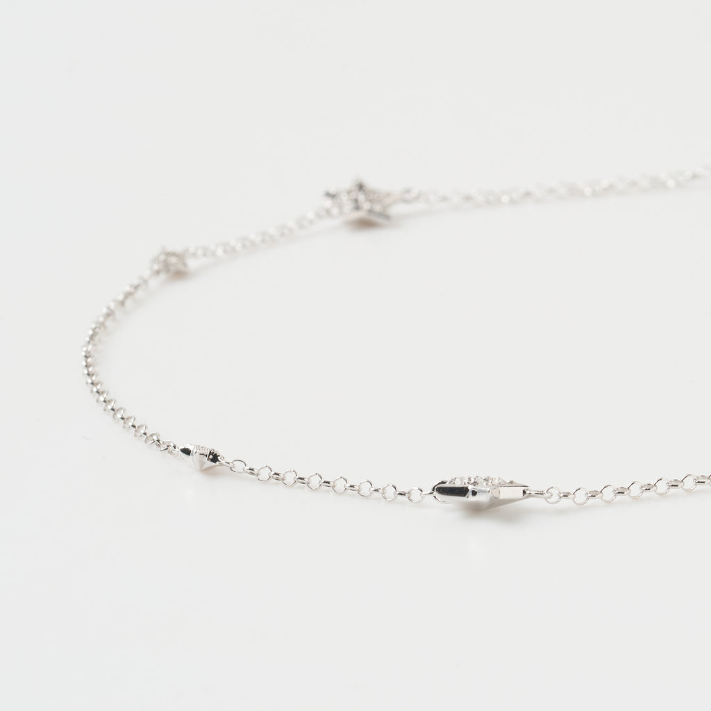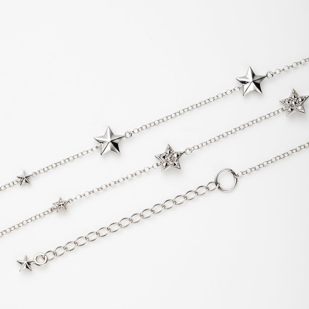 厚みと立体感のある大小のスターモチーフをバランスよく配置しました。スターモチーフにはキラキラと輝くマルカジットを留めてあり、胸元で上品な輝きを放ちます。