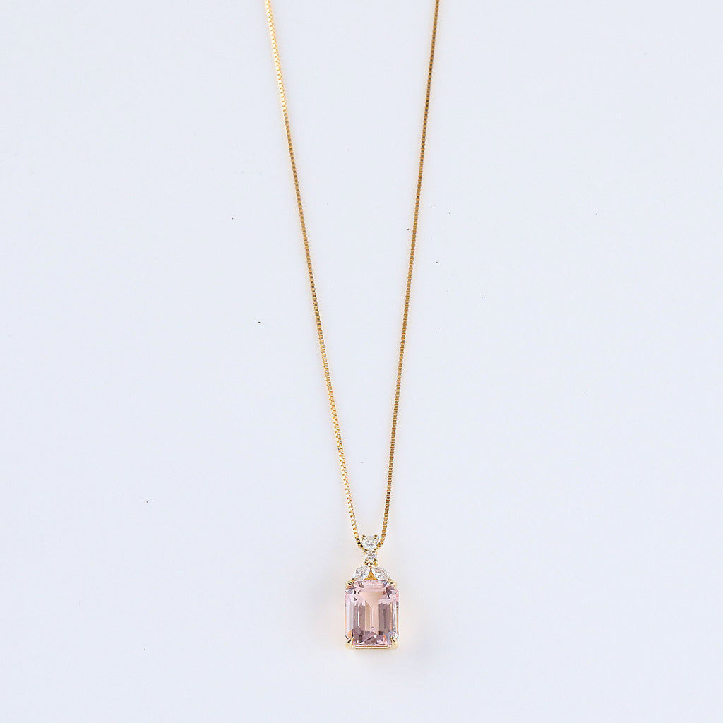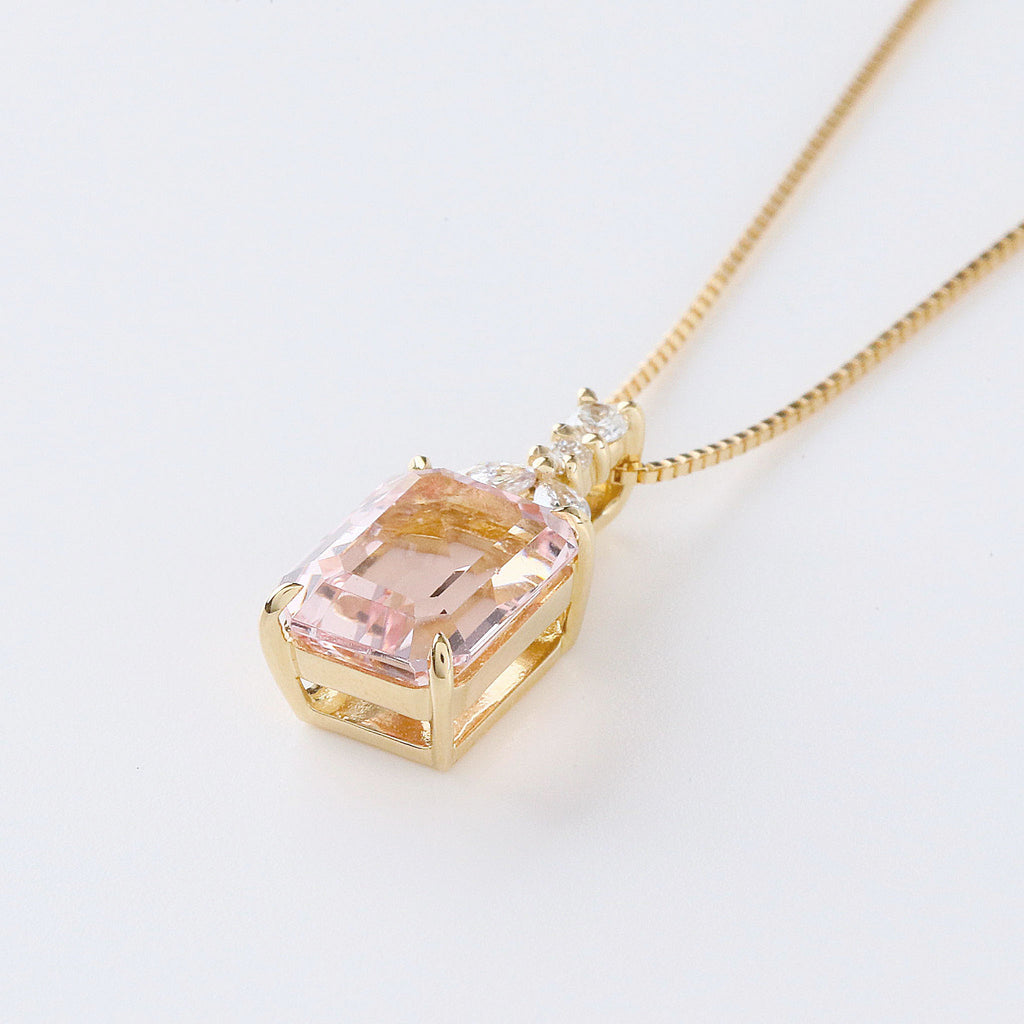4本の爪でモルガナイトをしっかりとセットし、チェーンを通すバチカン部分にマーキスカットダイヤをあしらった華やかな印象のデザインです。