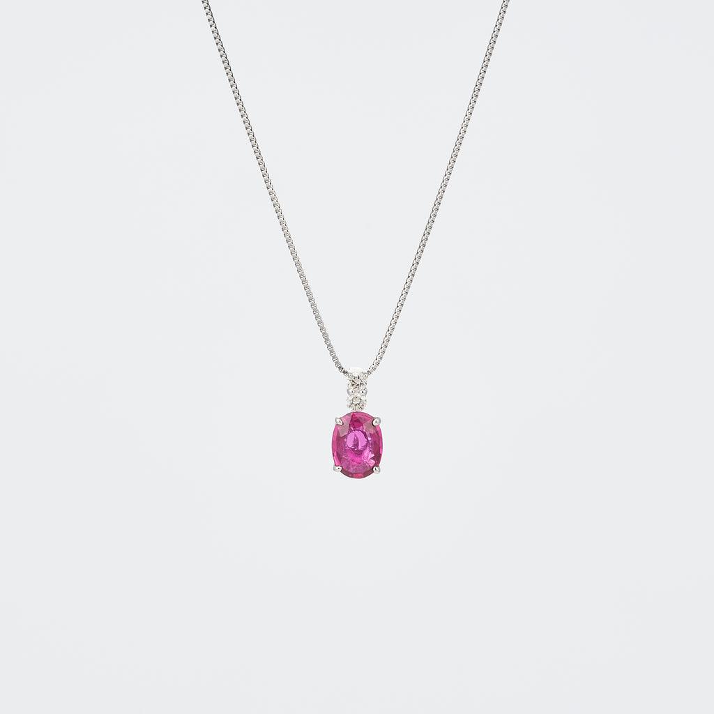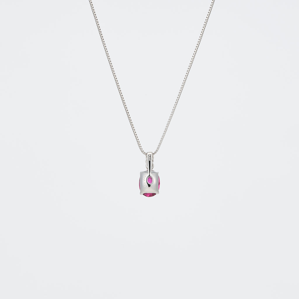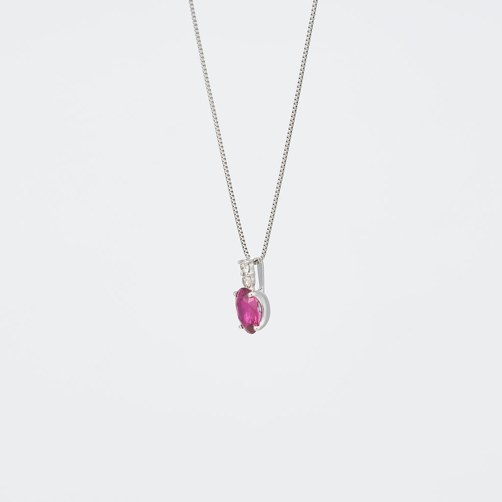 しっかりとした存在感を楽しめる0.5ctのルビーを留めて、チェーンを通すバチカン部分にはメレダイヤを縦に2石セットしました。