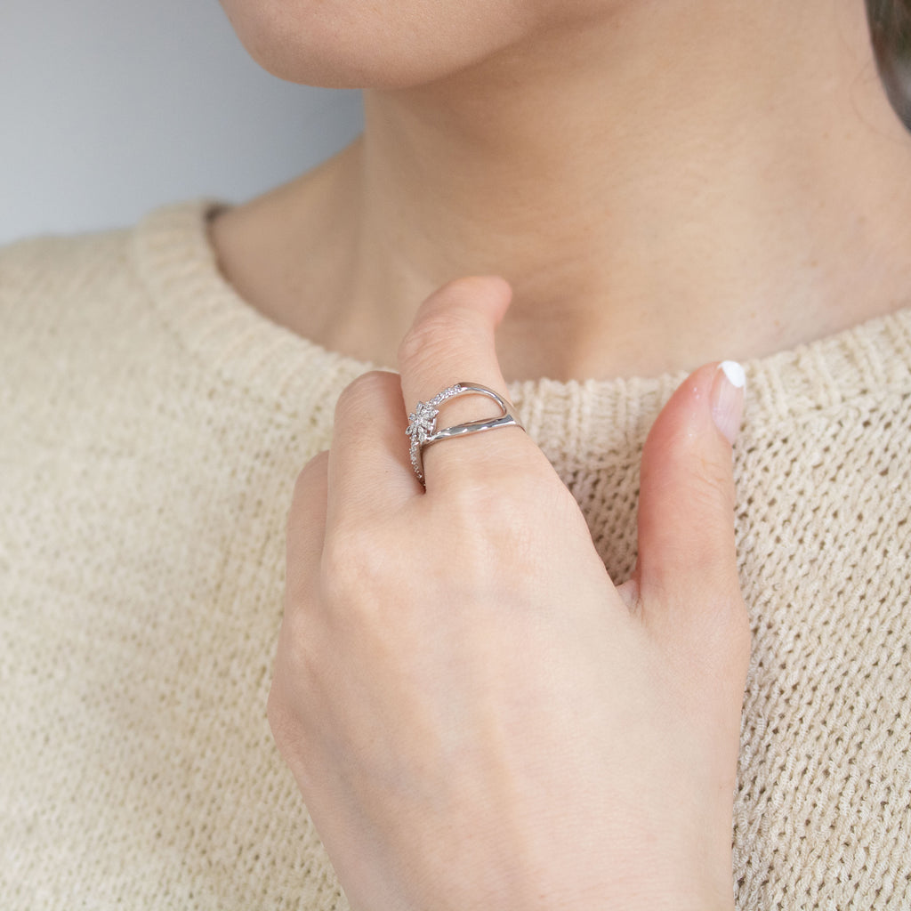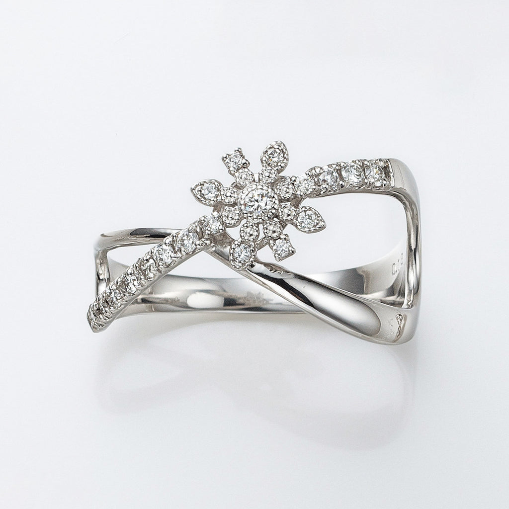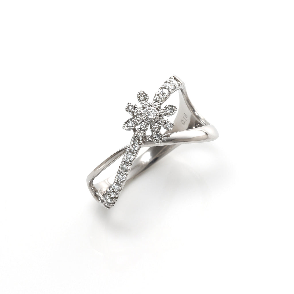 メレダイヤを留めたラインとプレーンな鏡面仕上げのラインが左右非対称にクロスしたリング。リングの中央にある花のようにも雪の結晶のようにも見えるモチーフがデザインのポイントになっています。