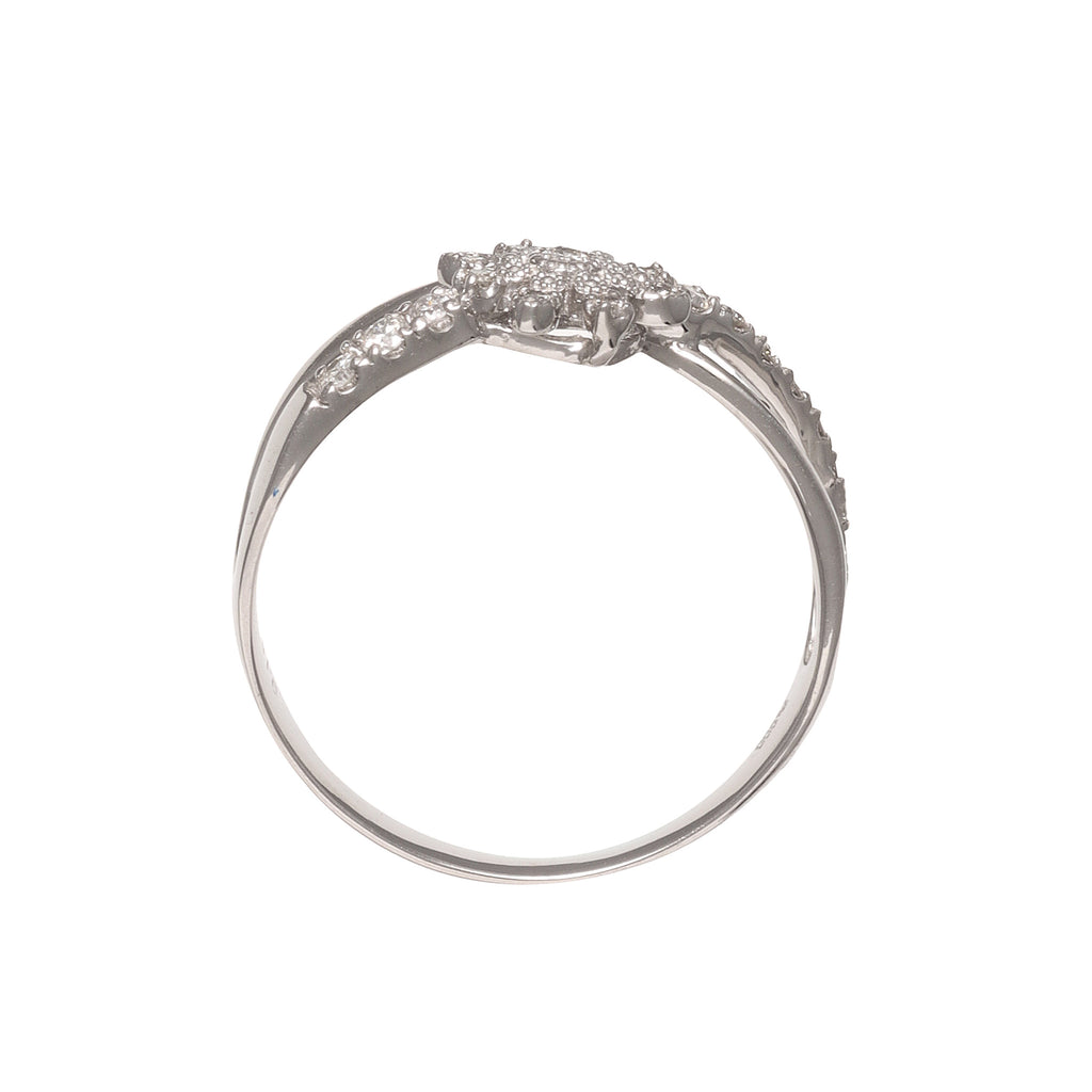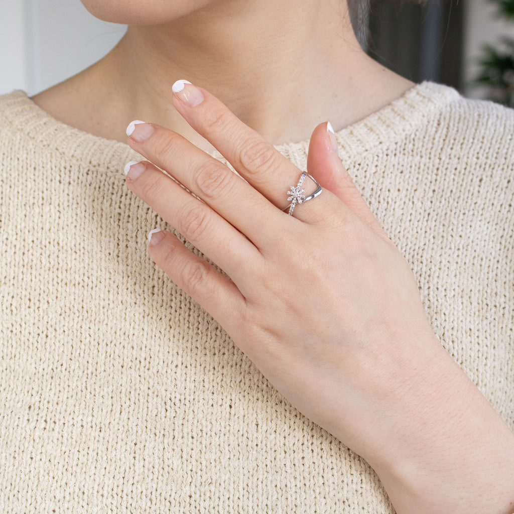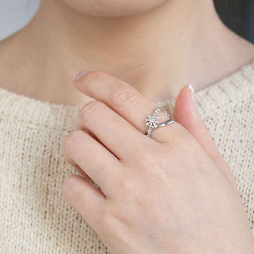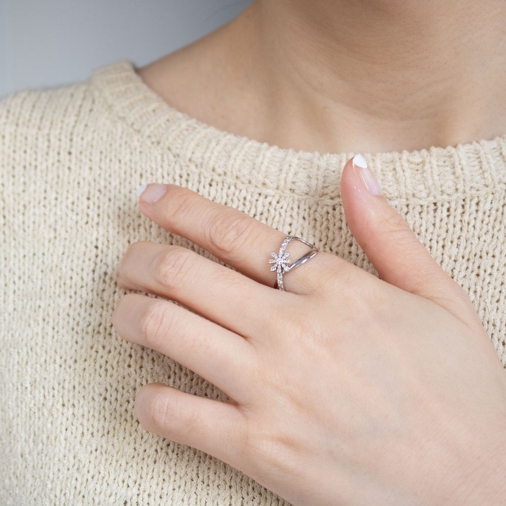 メレダイヤを留めたラインとプレーンな鏡面仕上げのラインが左右非対称にクロスしたリング。リングの中央にある花のようにも雪の結晶のようにも見えるモチーフがデザインのポイントになっています。