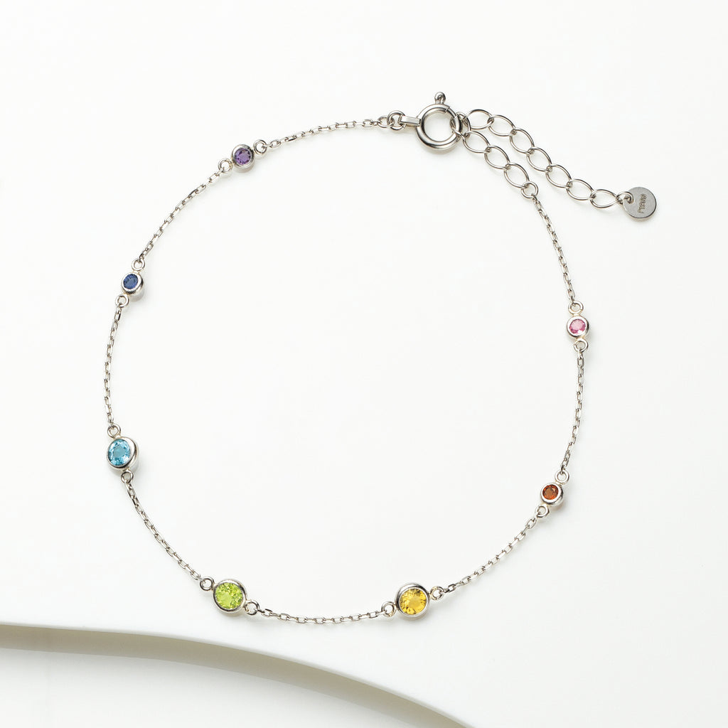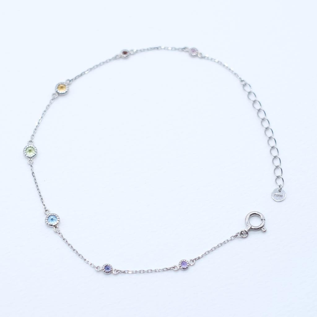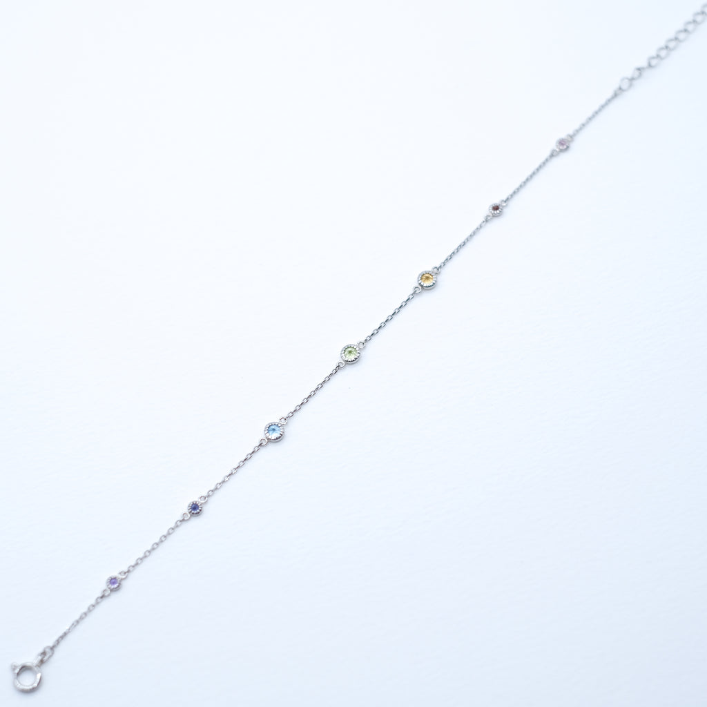 7色の大小のカラーストーンを等間隔に留めたデザイン。プラチナ製のチェーンと組み合わせてあるので、それぞれのカラーストーンの色が分かりやすいです。