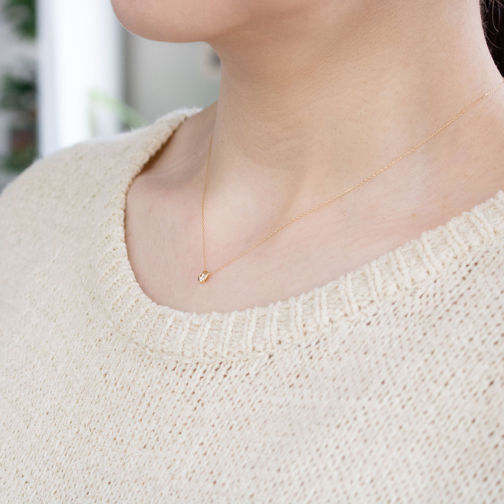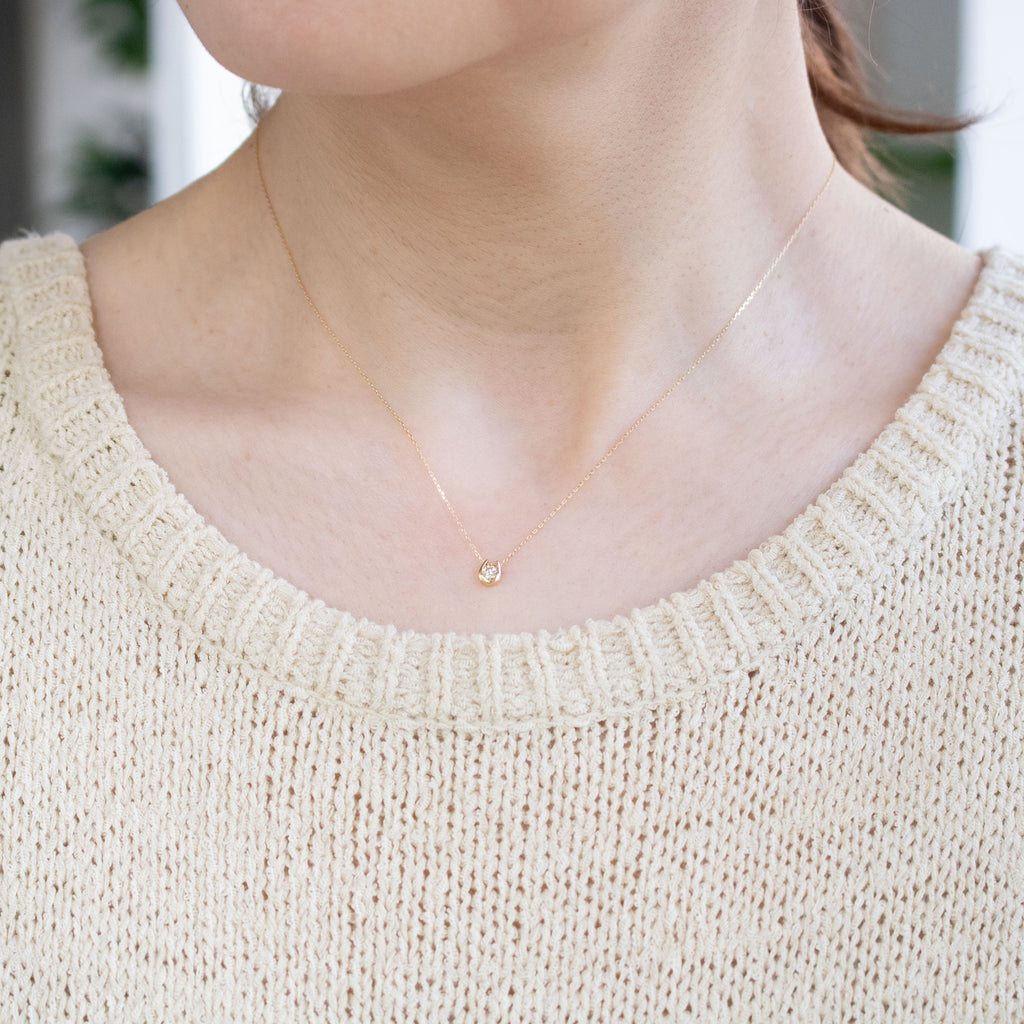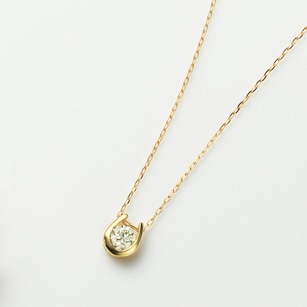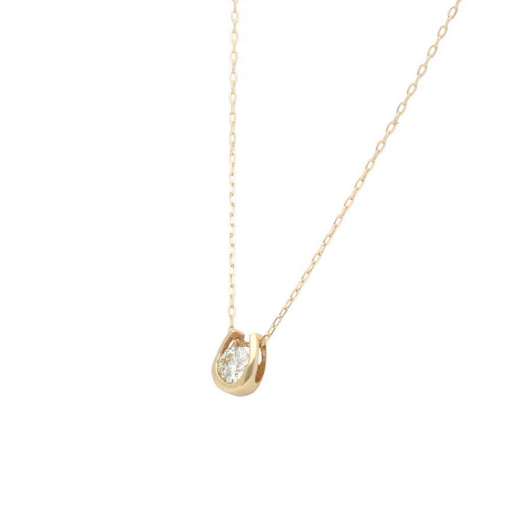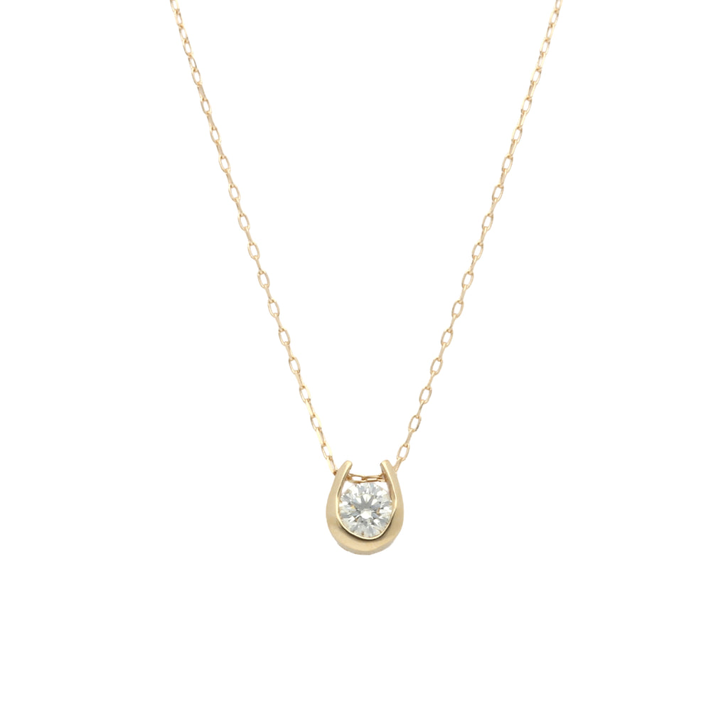 18金イエローゴールド製の小ぶりな馬蹄モチーフに、キラッと輝くメレダイヤを1石留めたネックレスです。