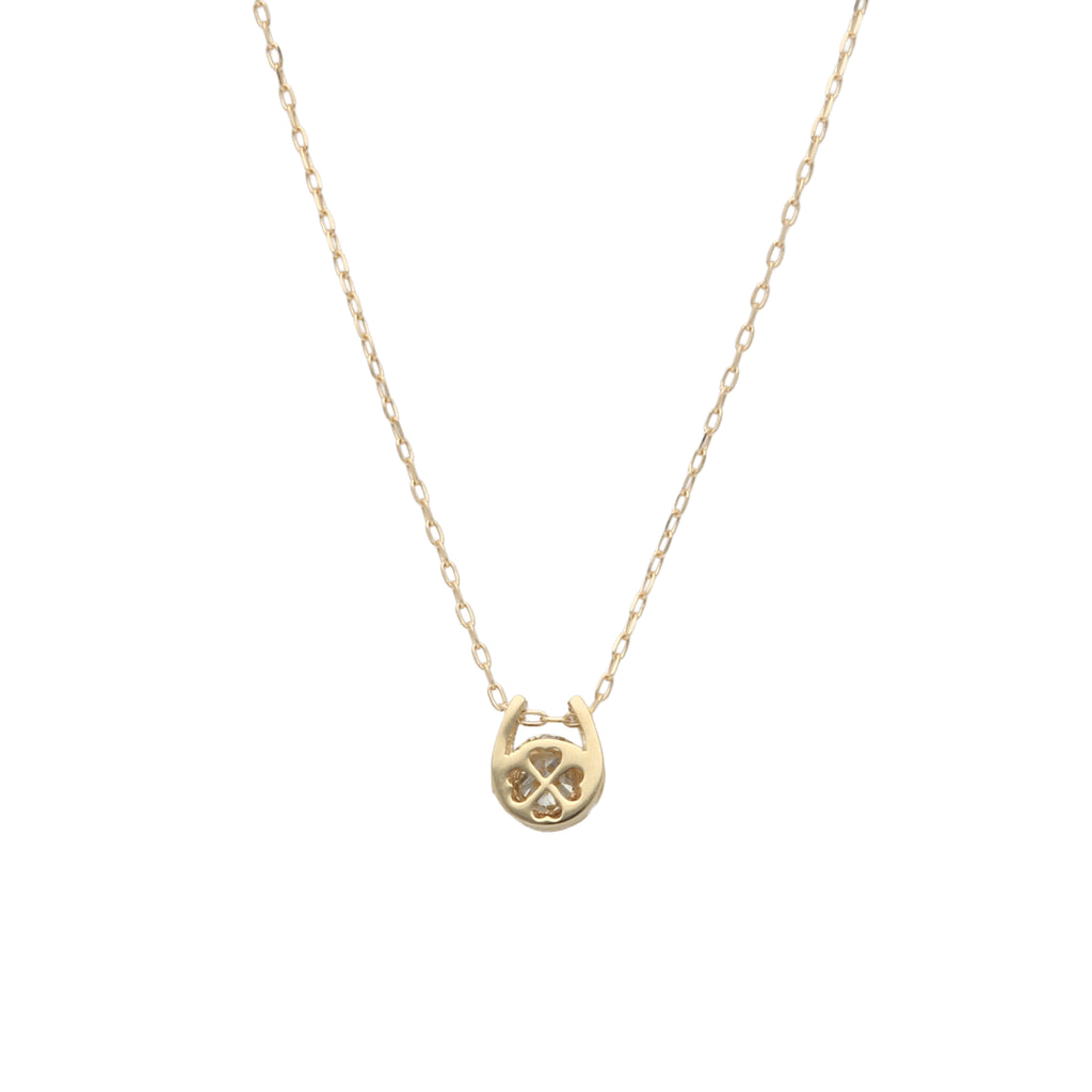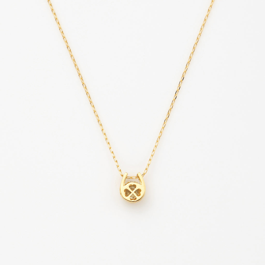 魔除けや幸運を呼ぶとされる馬蹄モチーフ。このネックレスの裏側にはさらに、幸運をもたらすとされる四つ葉のクローバーのモチーフもデザインされています。