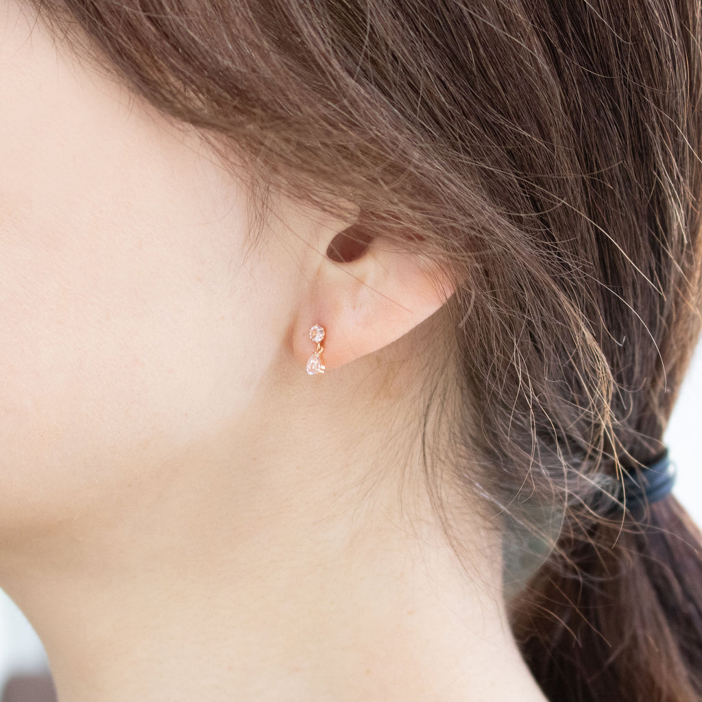 ラウンドカットのモルガナイトの下でペアシェイプのモルガナイトが揺れてキラキラと輝きます。