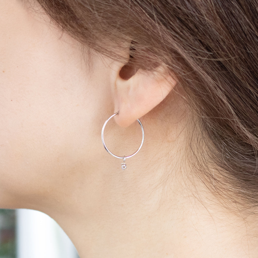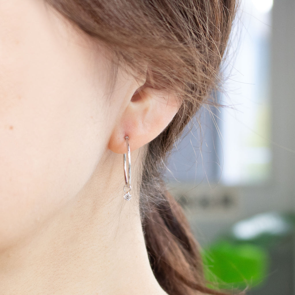 メレダイヤのチャームが揺れるフープタイプピアスです。