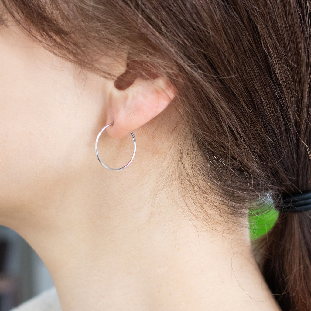 フープピアスは高級感のあるプラチナ製です。中空なので見た目の割に軽やかな着け心地です。