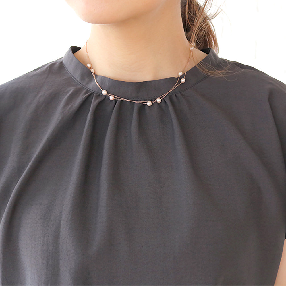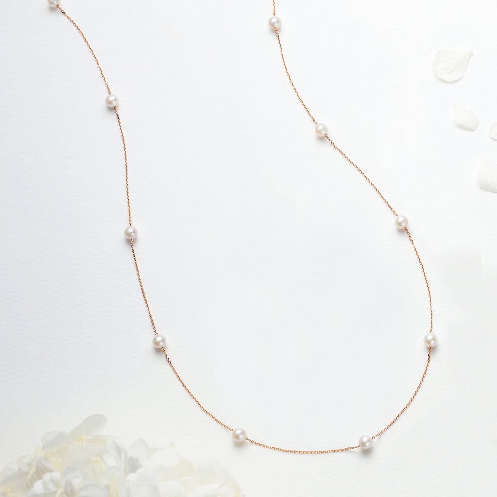 そのまま被って着けることができ、2連にしても楽しめる約80cmのロングタイプ。ピンクゴールドのチェーンの温かみのあるトーンに、アコヤパールの強いてりがとてもきれいに際立ちます。