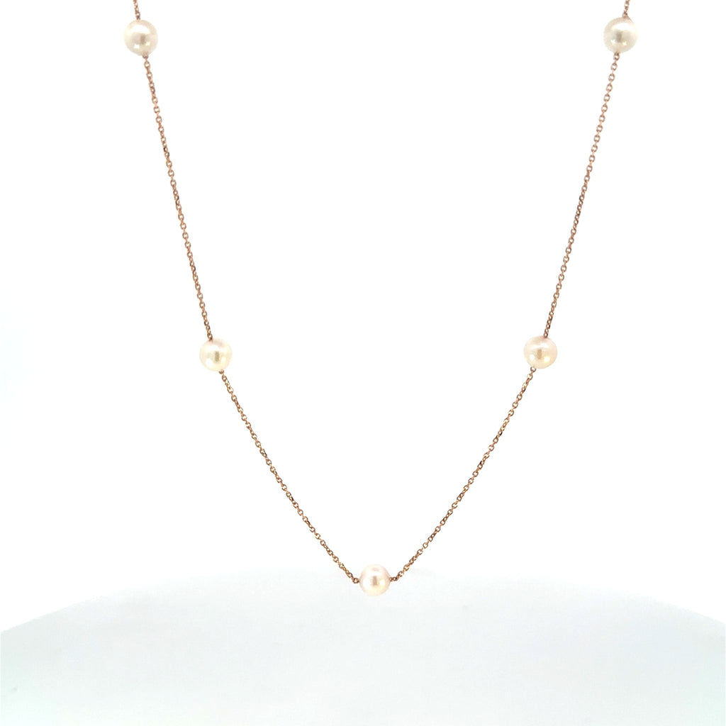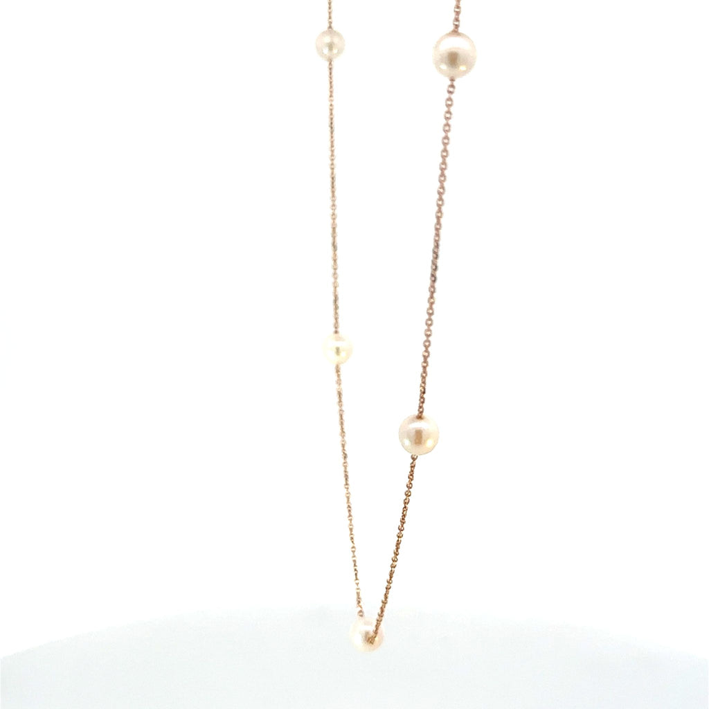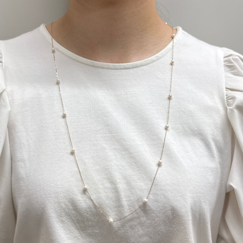 アコヤの4mm珠ベビーパールをステーションにセットした18金製ロングネックレスです。