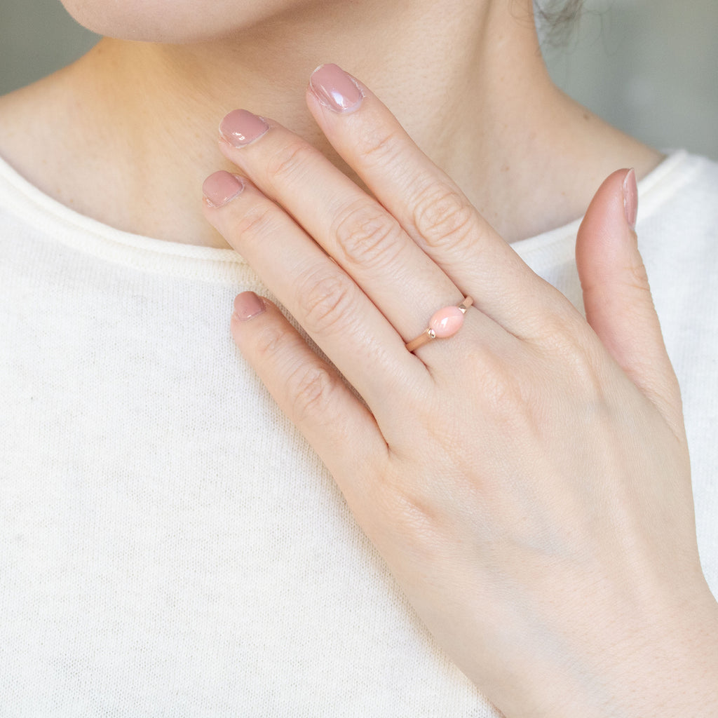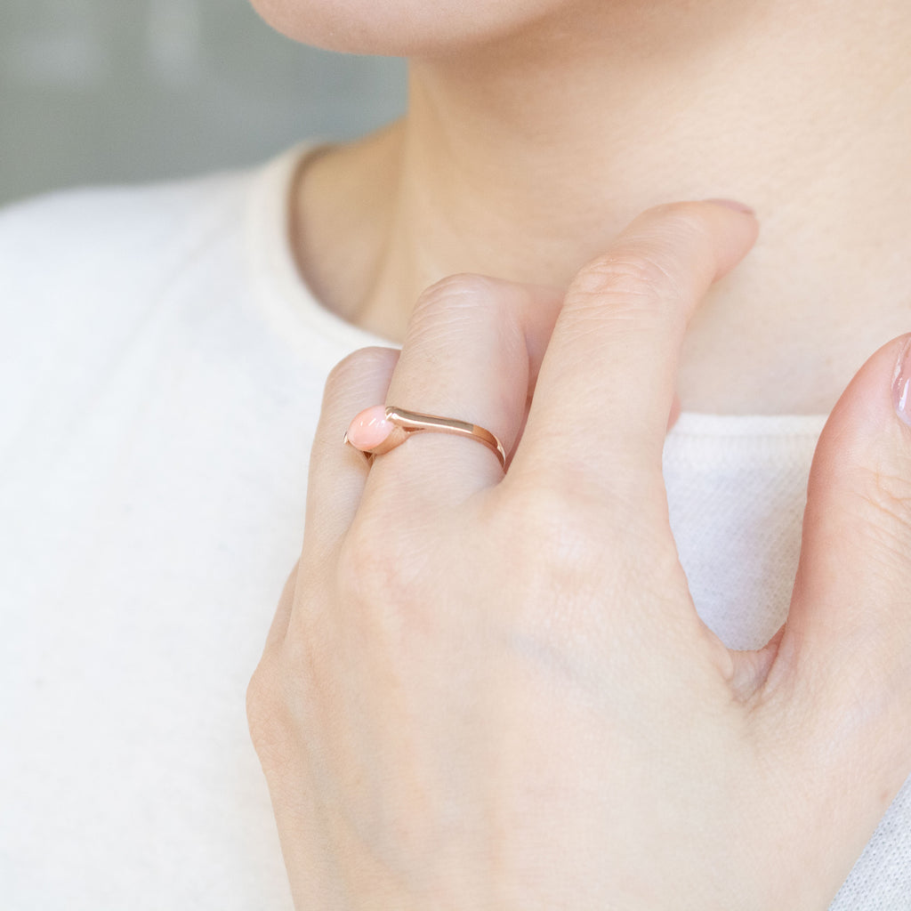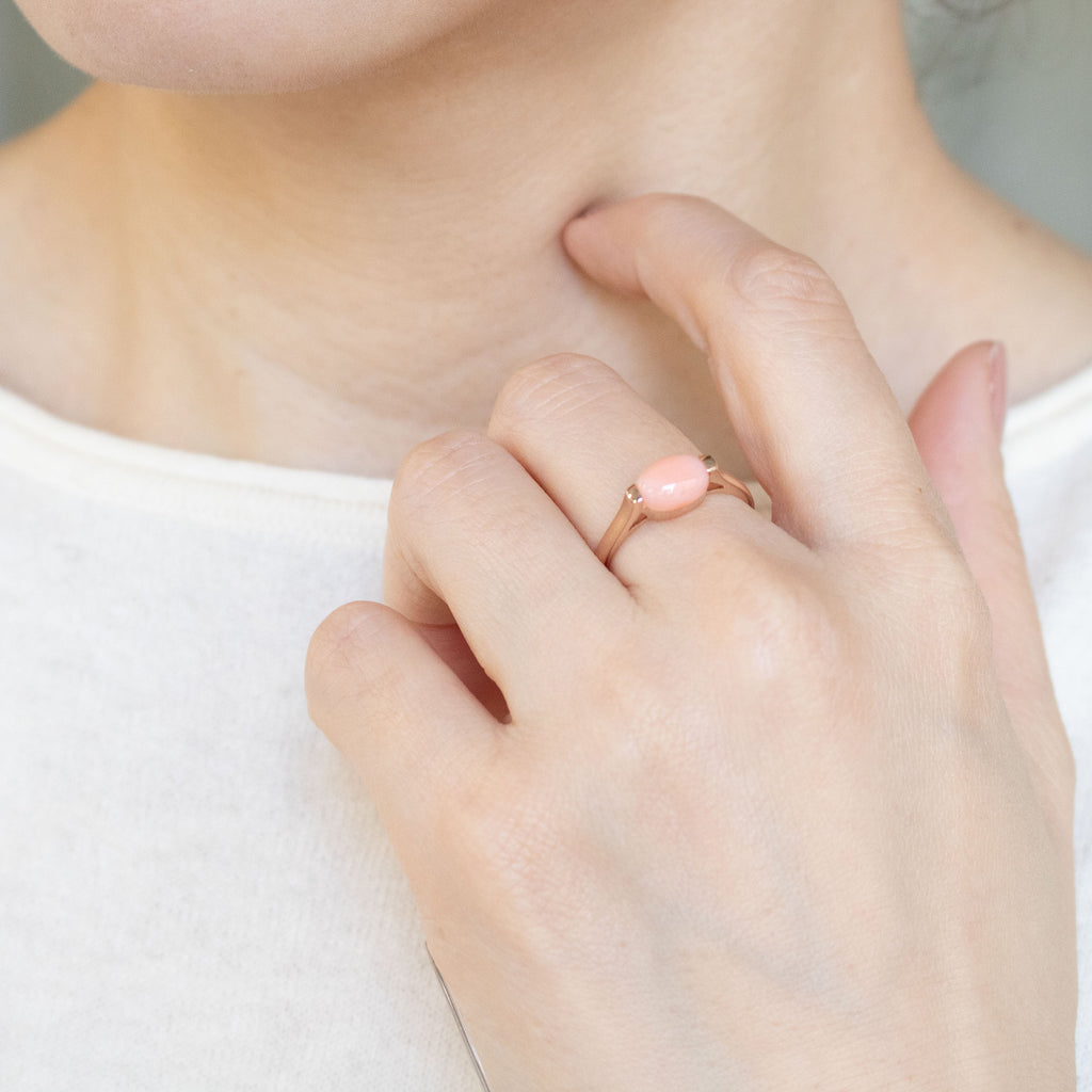 サンゴの柔らかなピンク色と相性抜群の18金ピンクゴールド製のリングで、サンゴを挟み込むようにセットしました。