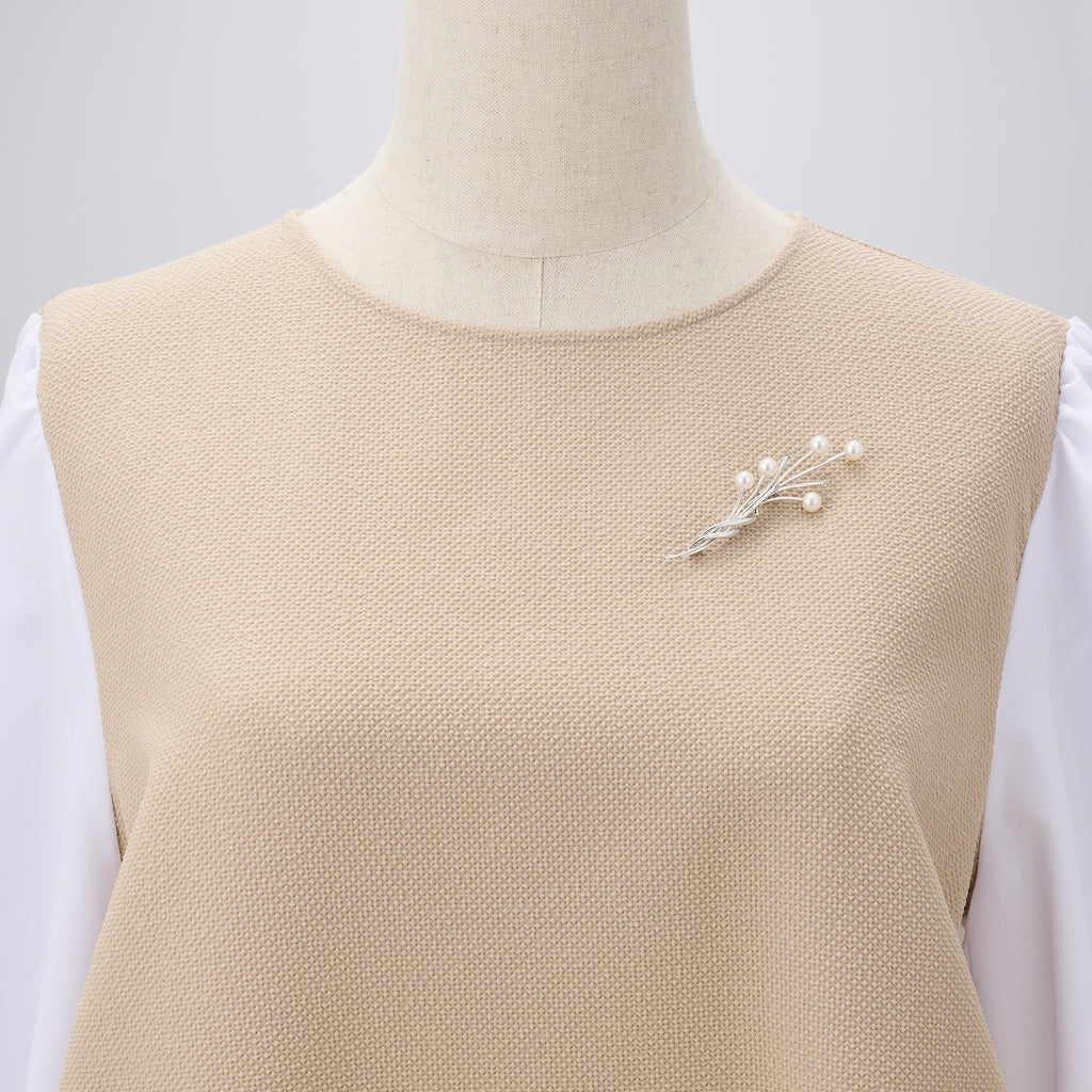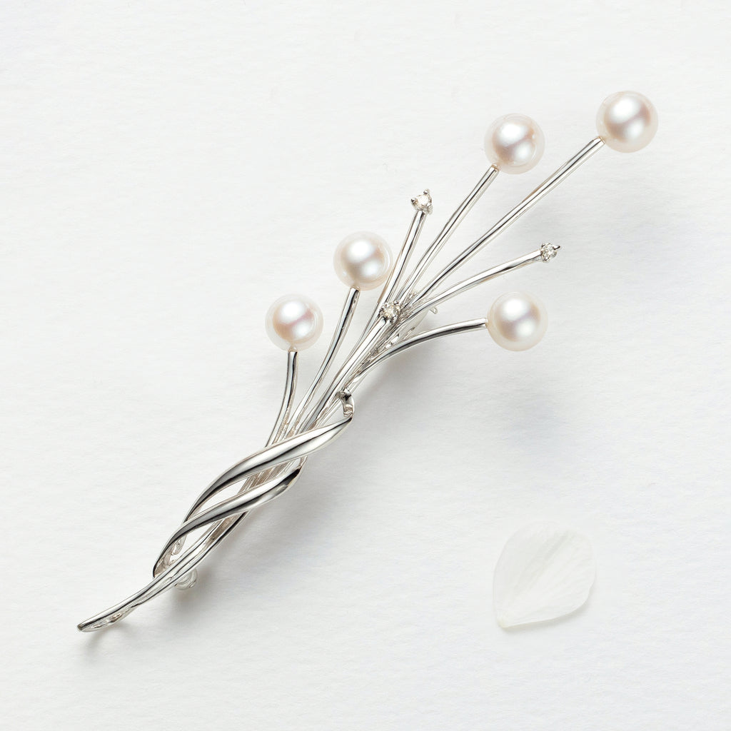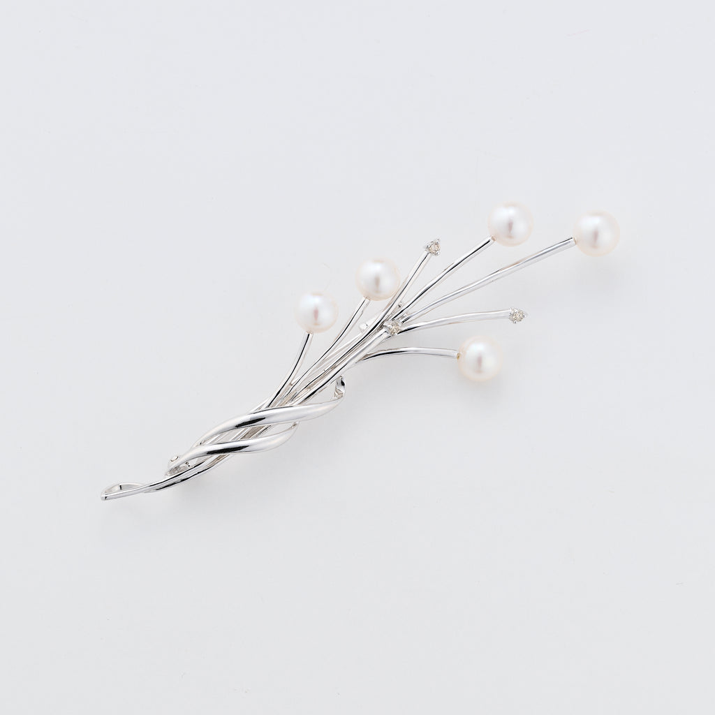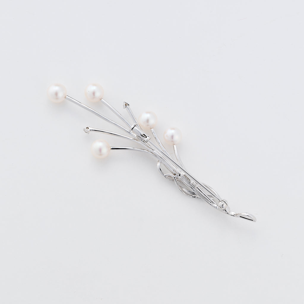 まるで枝ものの花束のような、すらっとエレガントな印象のブローチです。 シルバーのラインの先端にはそれぞれ、てり抜群のアコヤパールやメレダイヤを留めてあります。