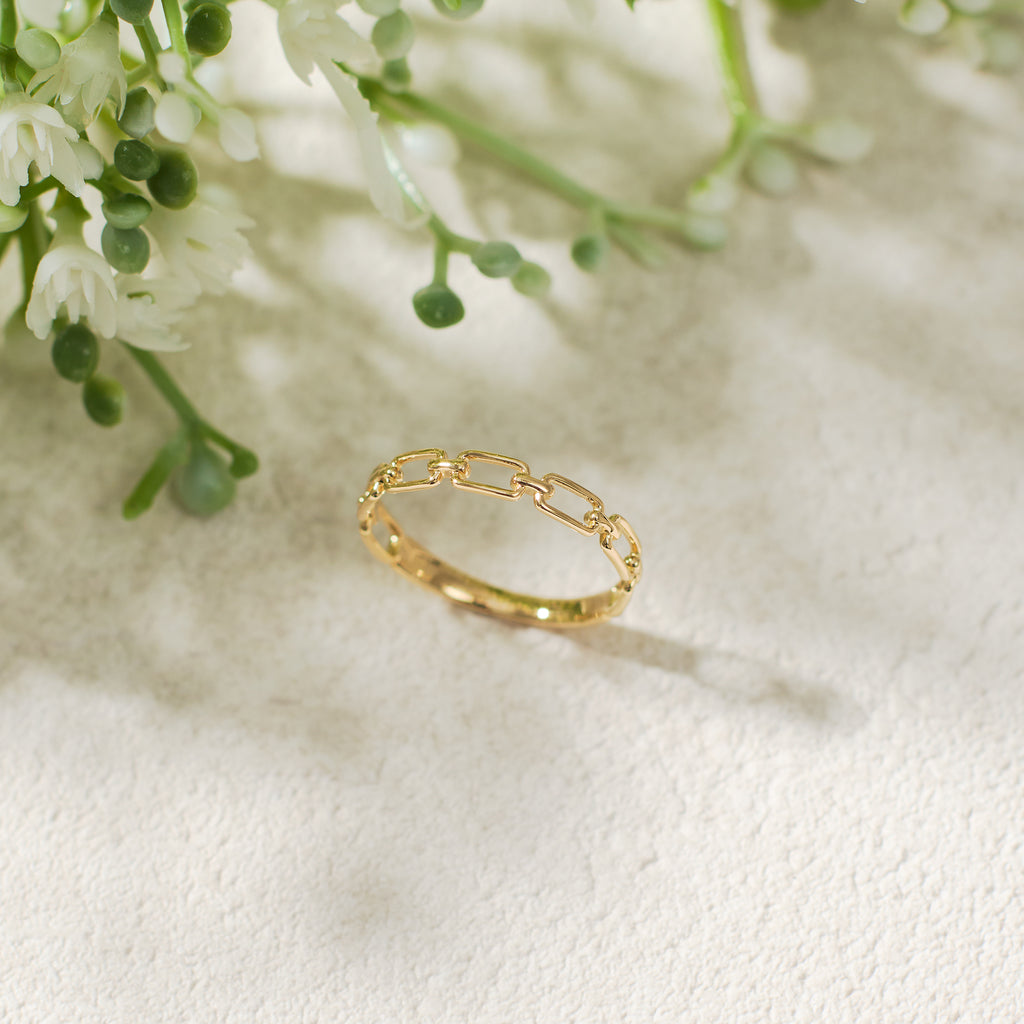 スタイリッシュでおしゃれな印象の長方形のコマを連ねたスクエアタイプのチェーンをモチーフにしました。ピッチが広いので軽やかな印象です。