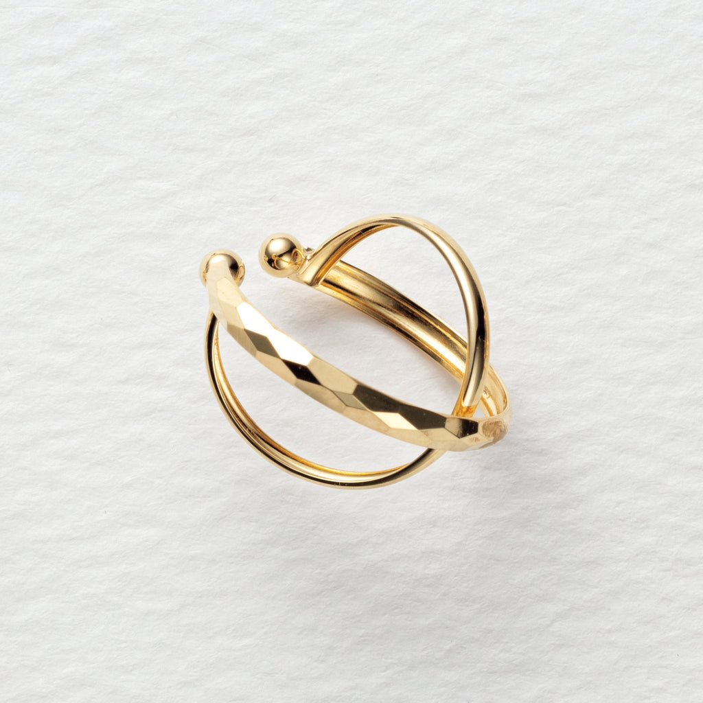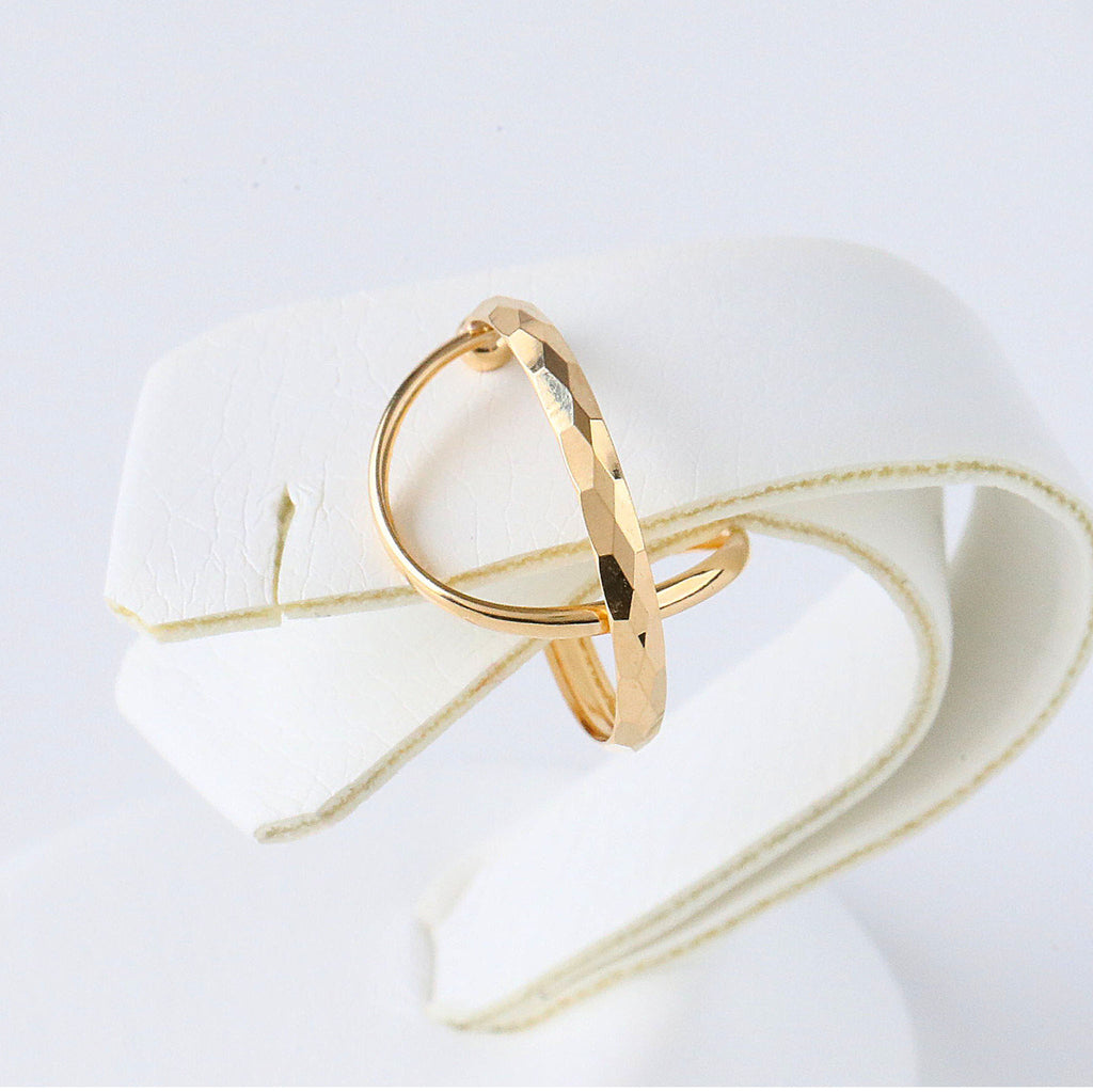 プレーンな鏡面仕上げのフープと、表面にキラキラと輝くカットを施したフープ、2種類のフープが交差した程よいボリューム感のあるイヤーカフです。