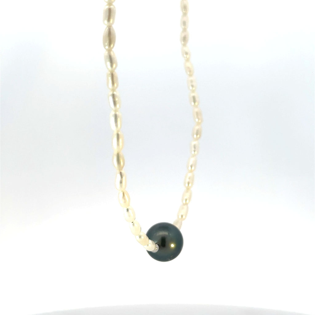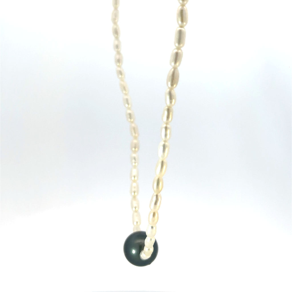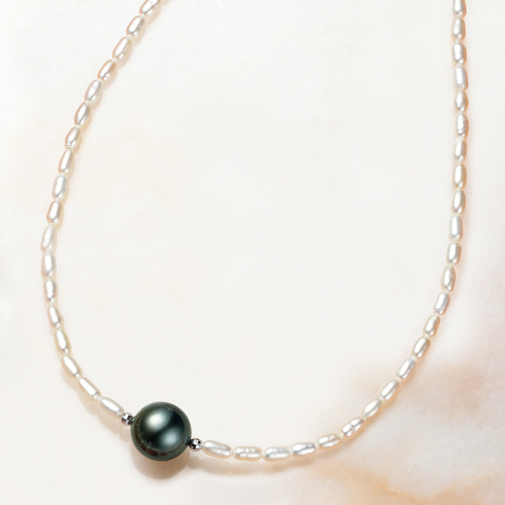 大珠10mmの黒蝶パールをセンターに留めて、ネックレス部分にはライス形の淡水パールを連ねました。くっきりとした黒と白のコントラストがおしゃれです。