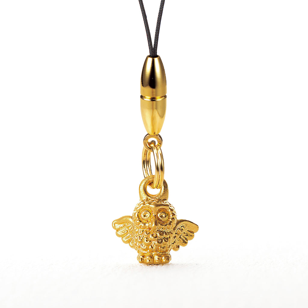 縁起のよいフクロウをモチーフにした純金製のストラップ。羽を広げている愛らしいデザインです。