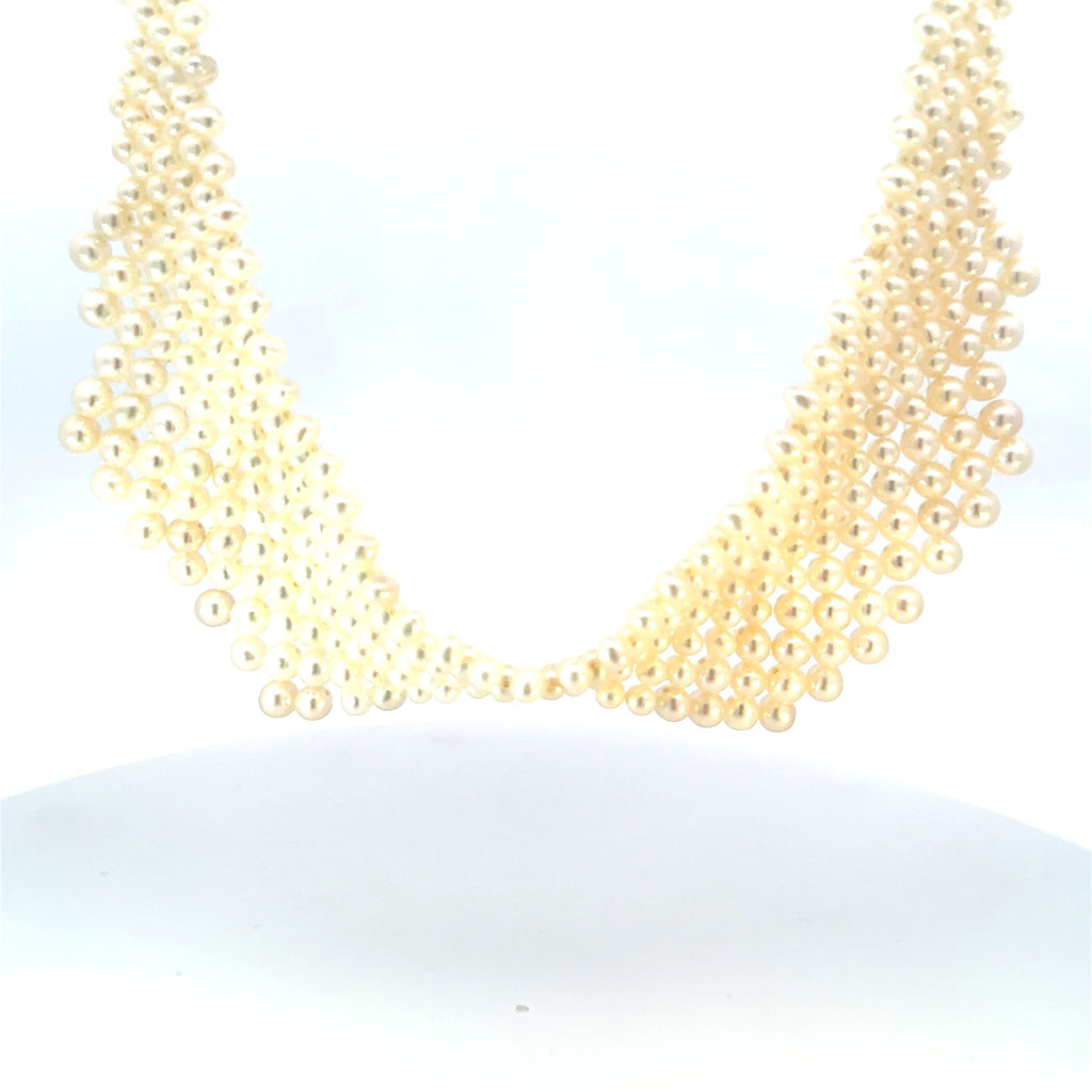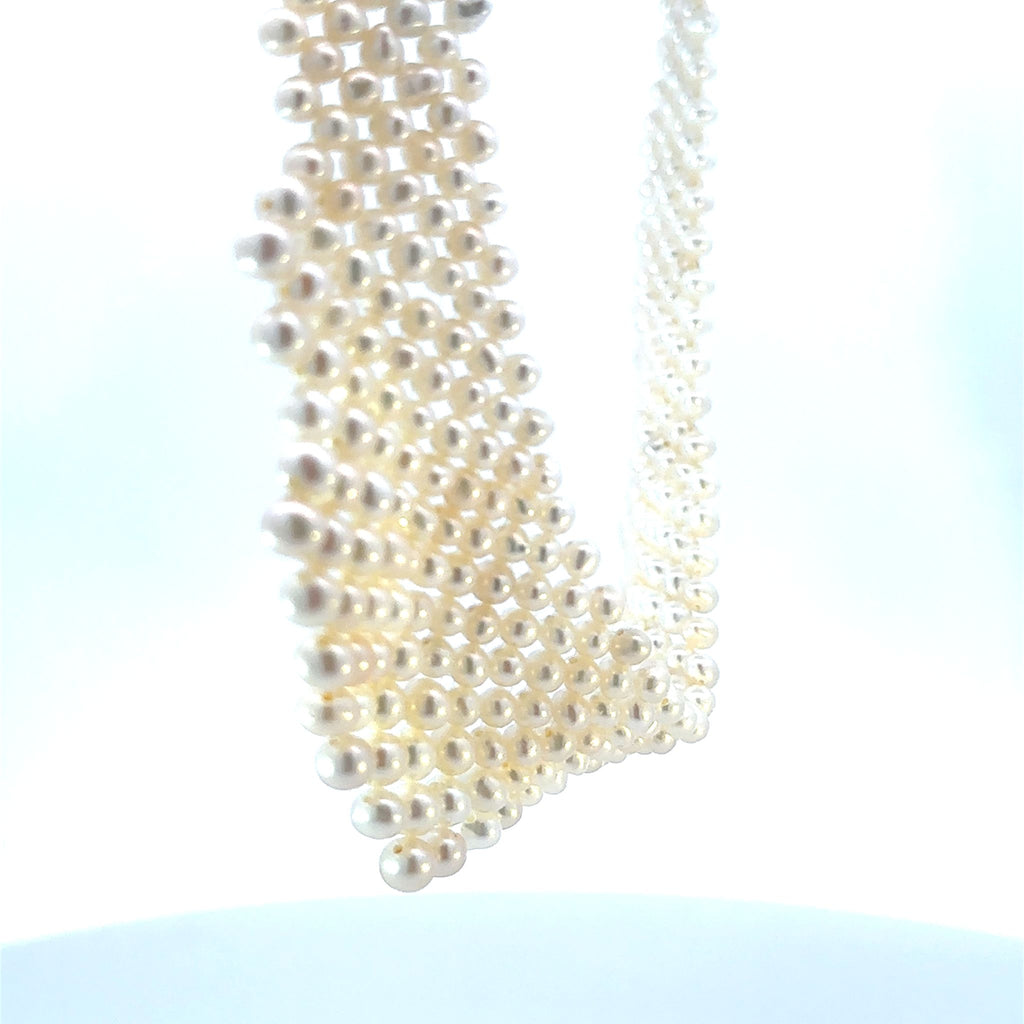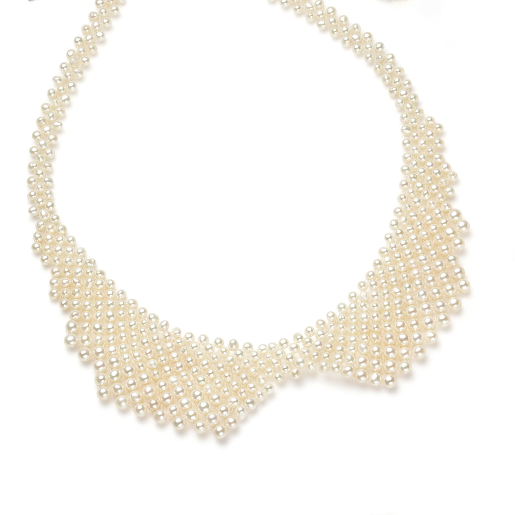 上品な光沢感を放つホワイト系カラーの淡水パールをテグスで編んで、つけ襟のようなデザインのネックレスに仕立てました。
