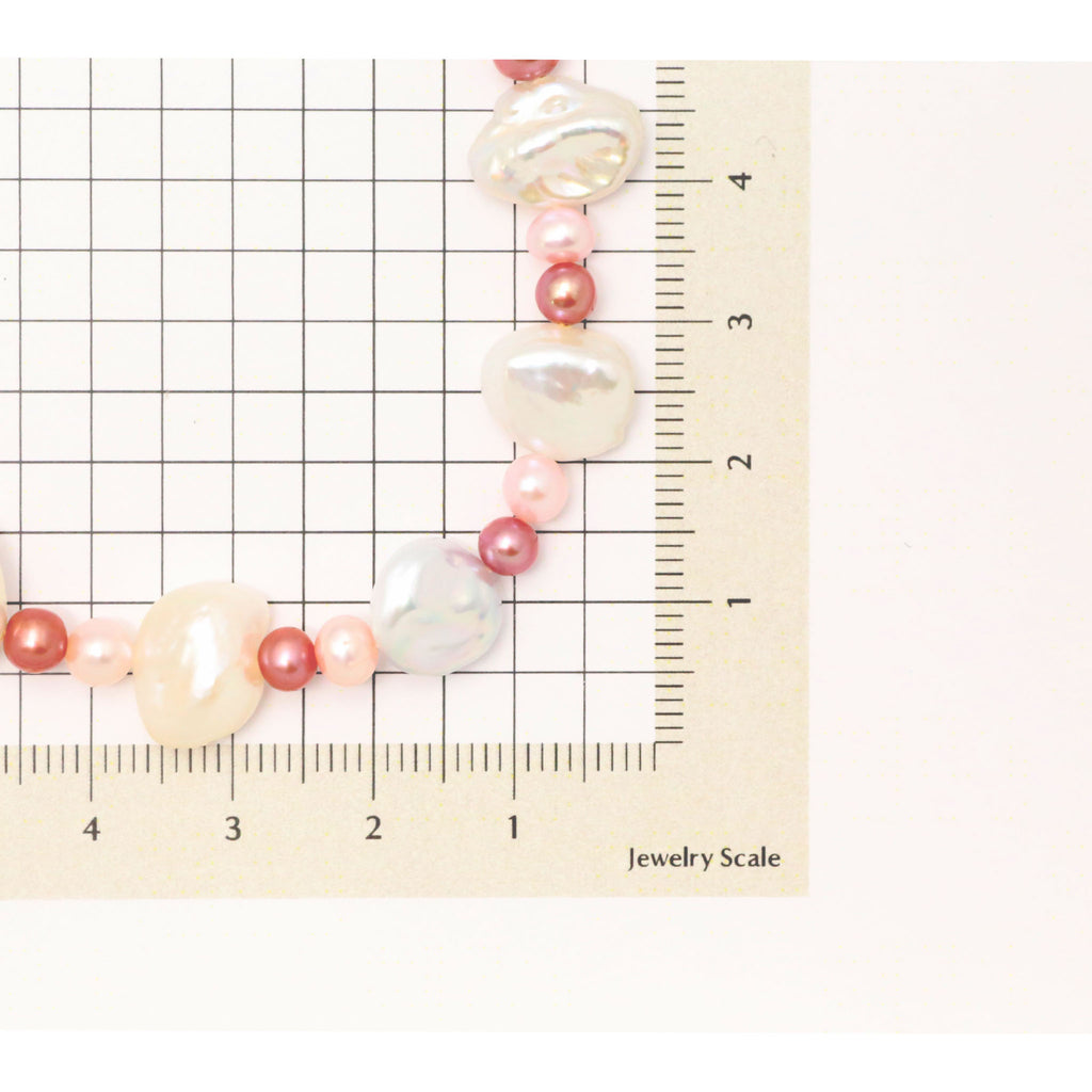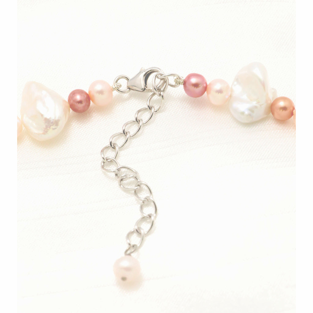 花びらのような形がユニークなホワイト系淡水パールのバロック珠に、淡いピンク色と赤い色に染めた小粒の淡水パールを組み合わせました。