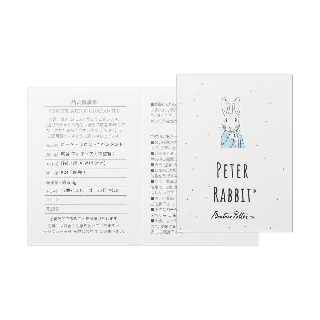 純金製のピーターラビットは中空製。見た目のボリューム感の割に軽量のつくりになっているので身に着けやすいネックレスです。留め具下5cmの箇所にアジャスター環が付いているので2段階の長さでお楽しみいただけます。