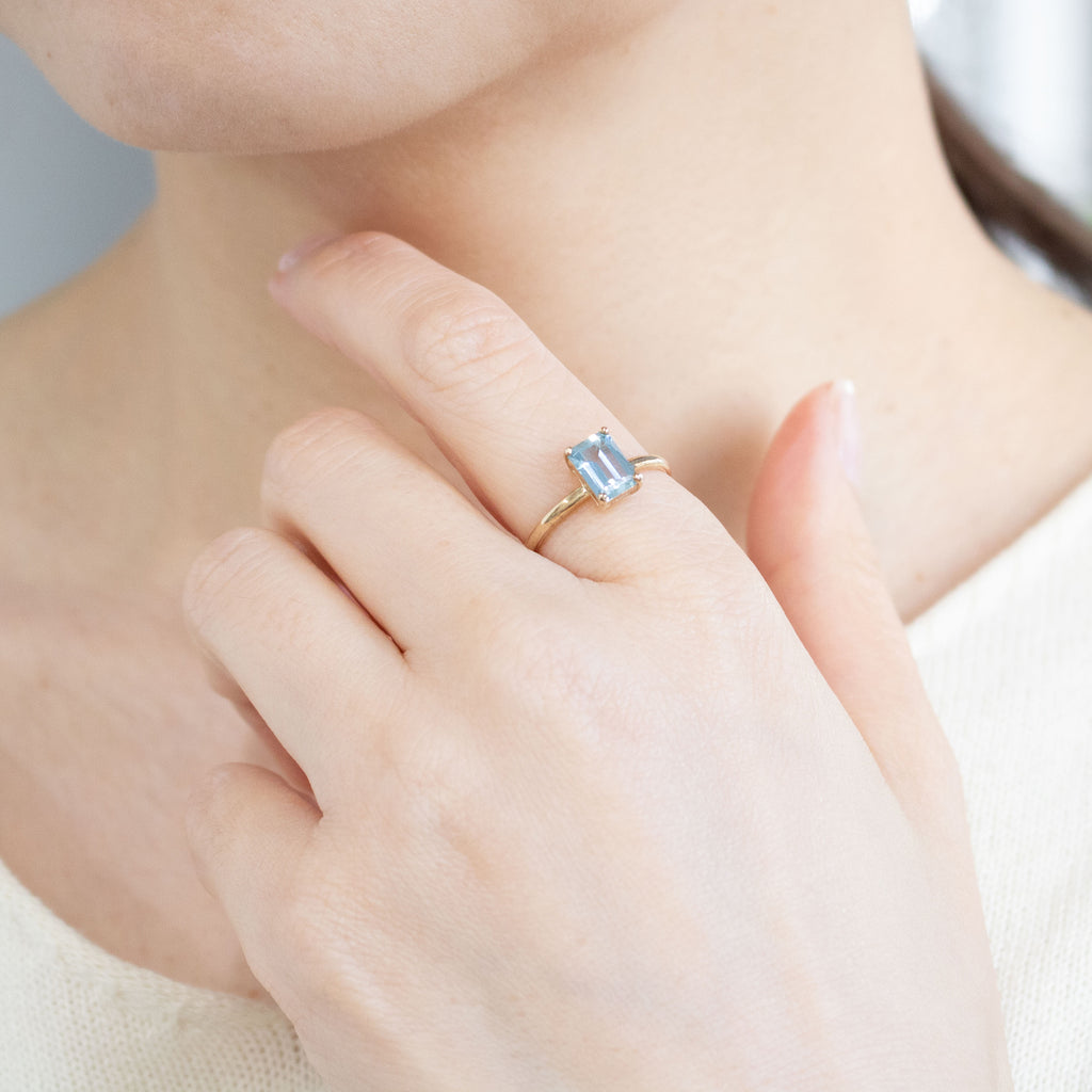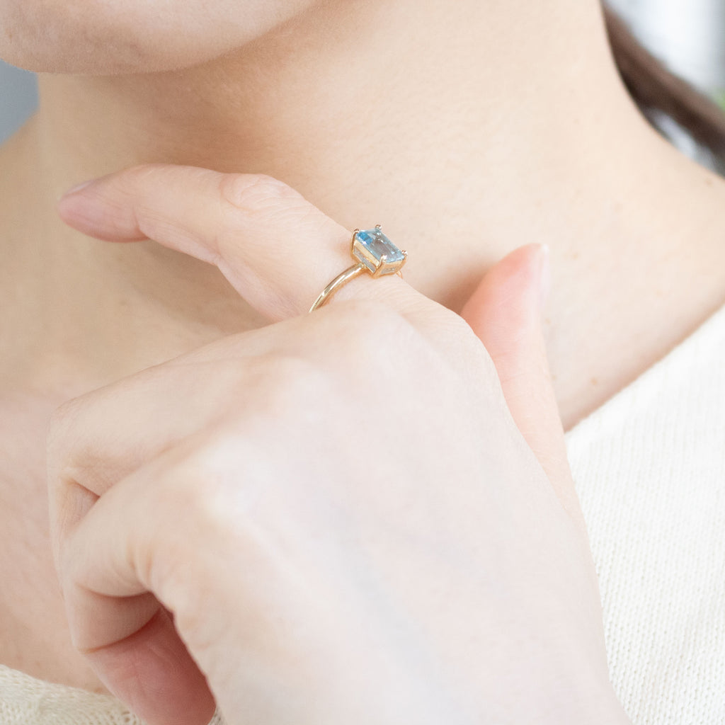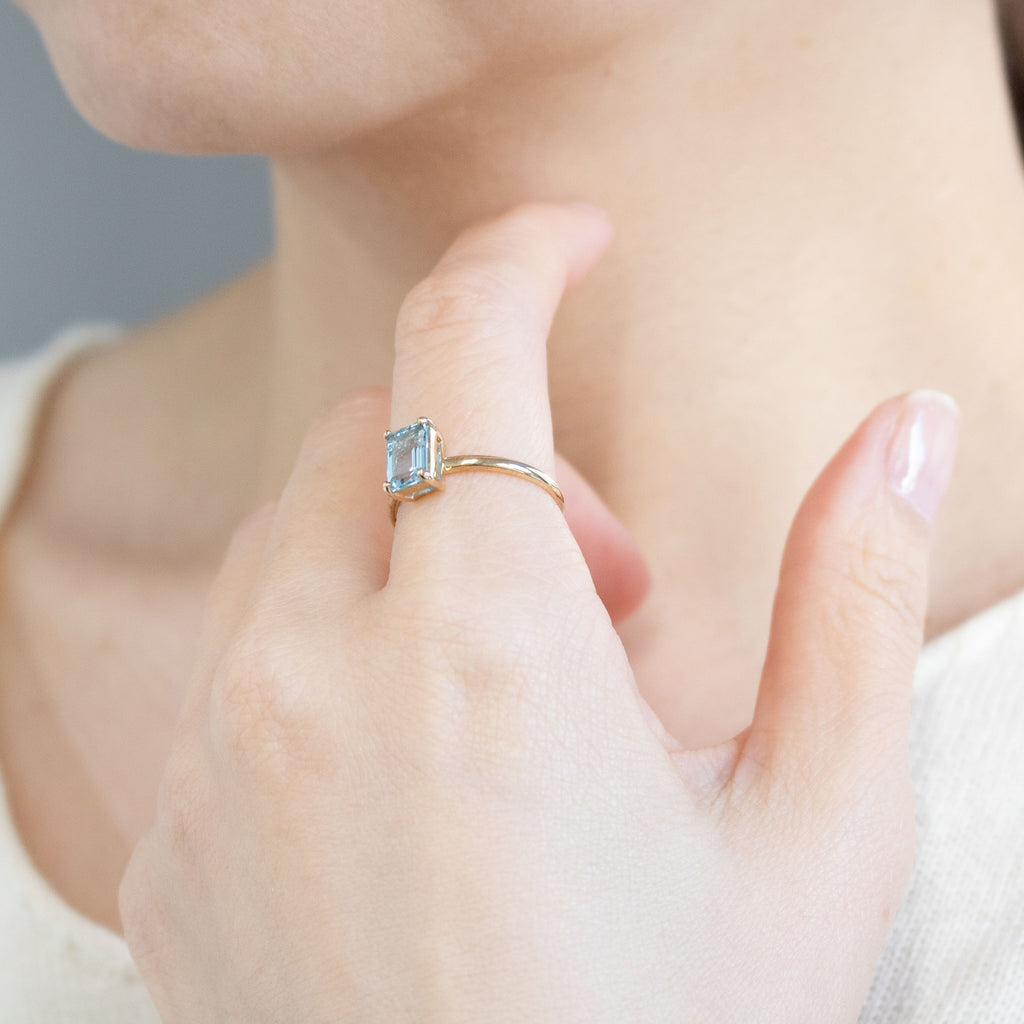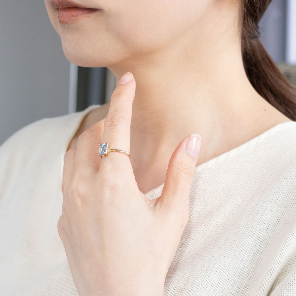 アクアマリンのブルーが引き立つ18金イエローゴールドの枠に縦向きにセット。メレダイヤなどの装飾が全くない大変シンプルなデザインのリングです。
