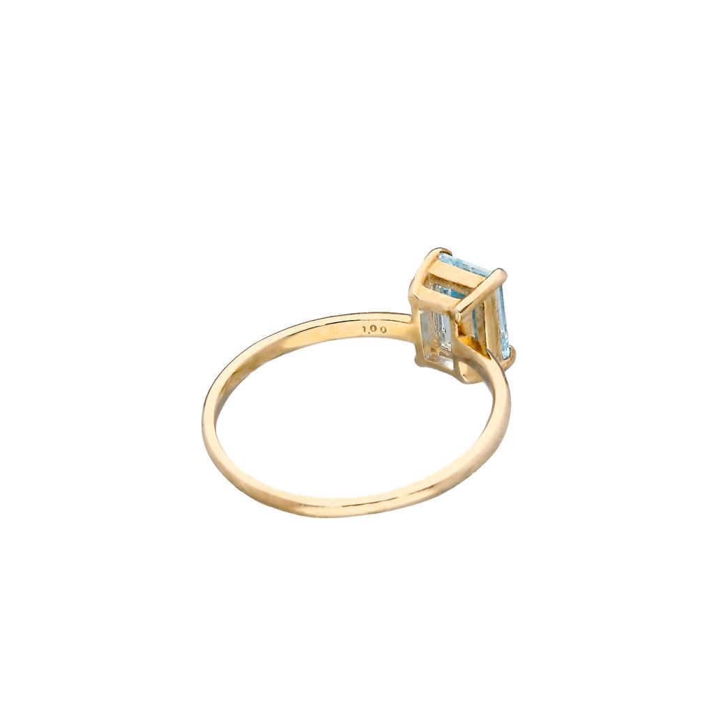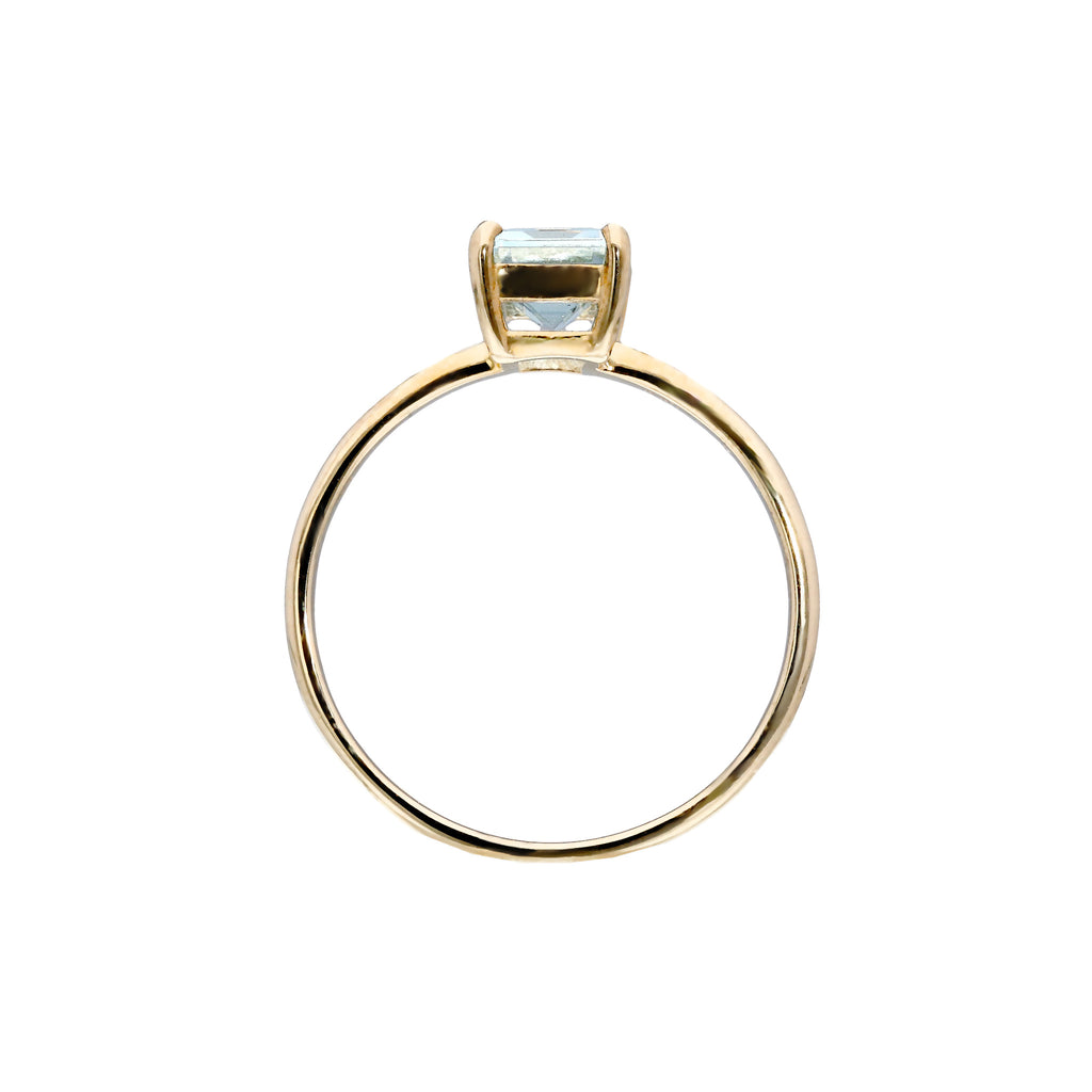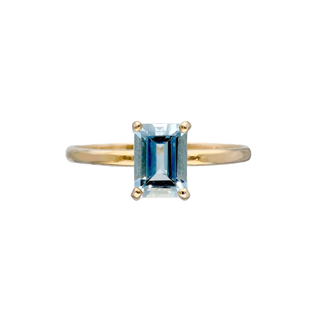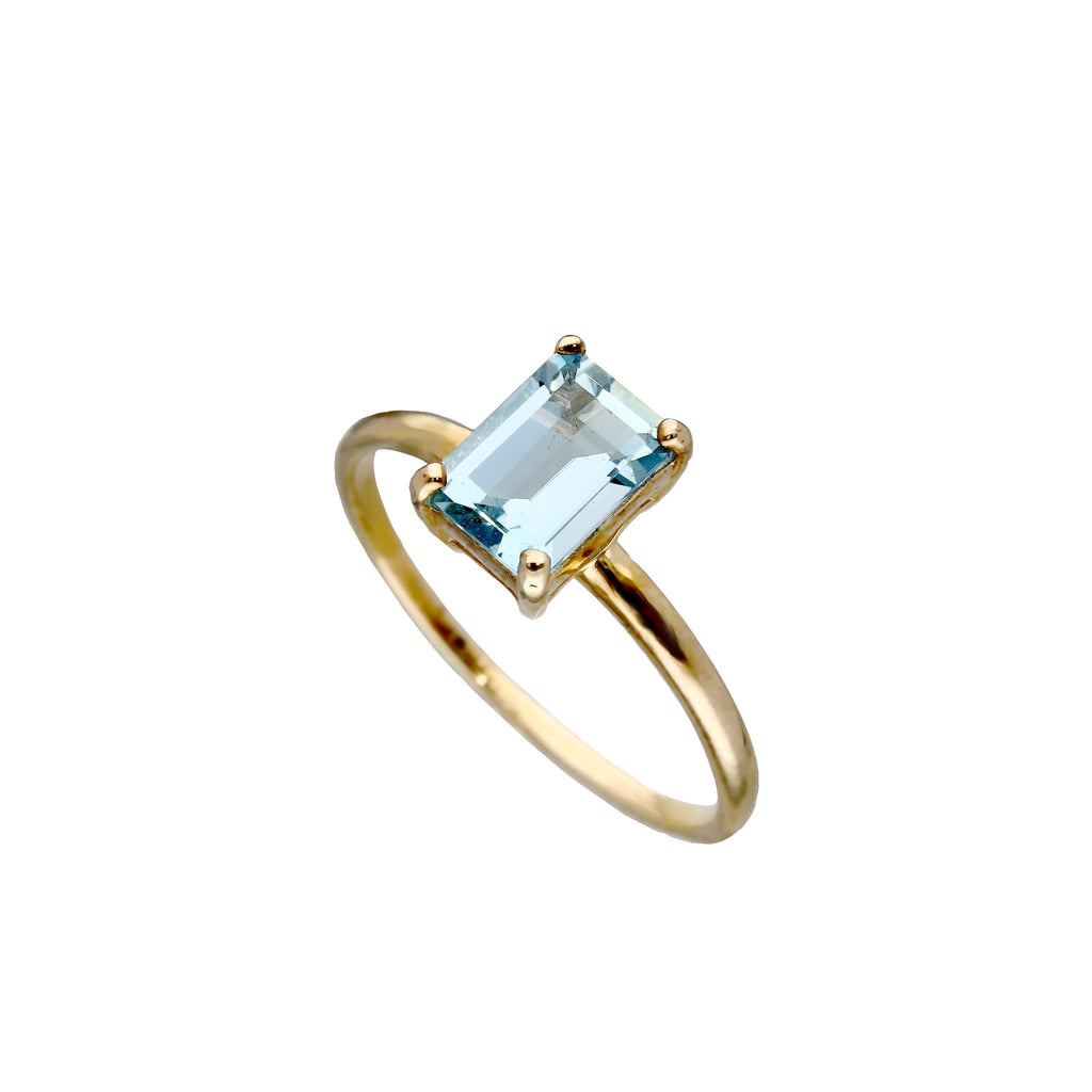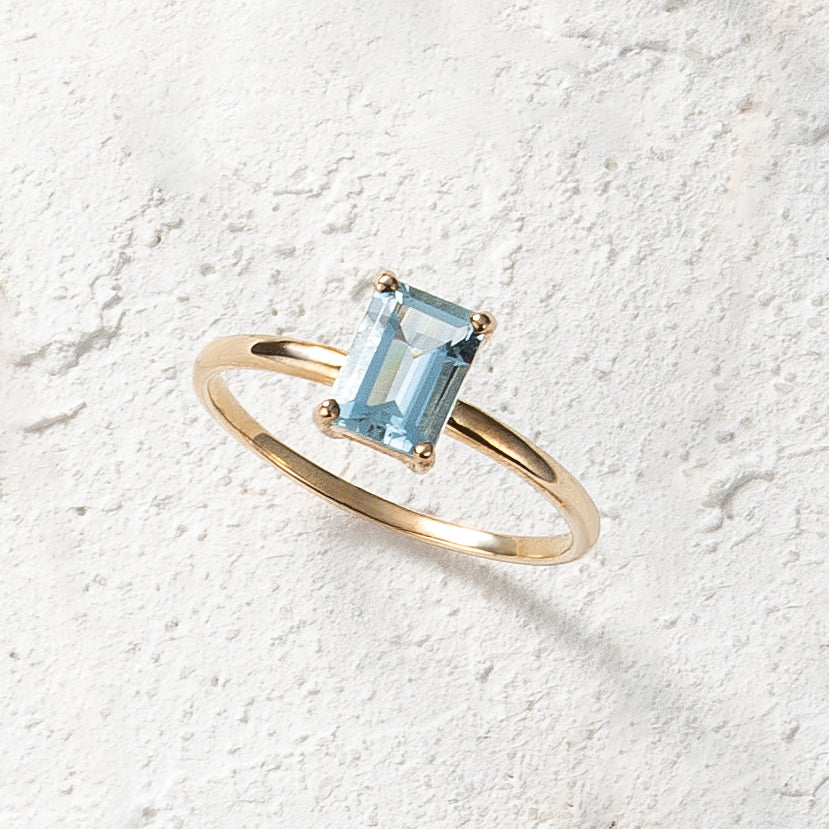 アクアマリンのブルーが引き立つ18金イエローゴールドの枠に縦向きにセット。メレダイヤなどの装飾が全くない大変シンプルなデザインのリングです。