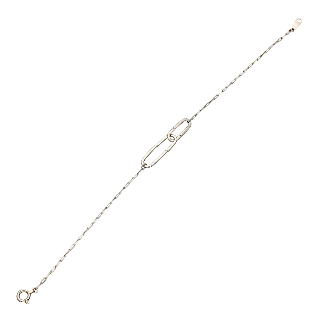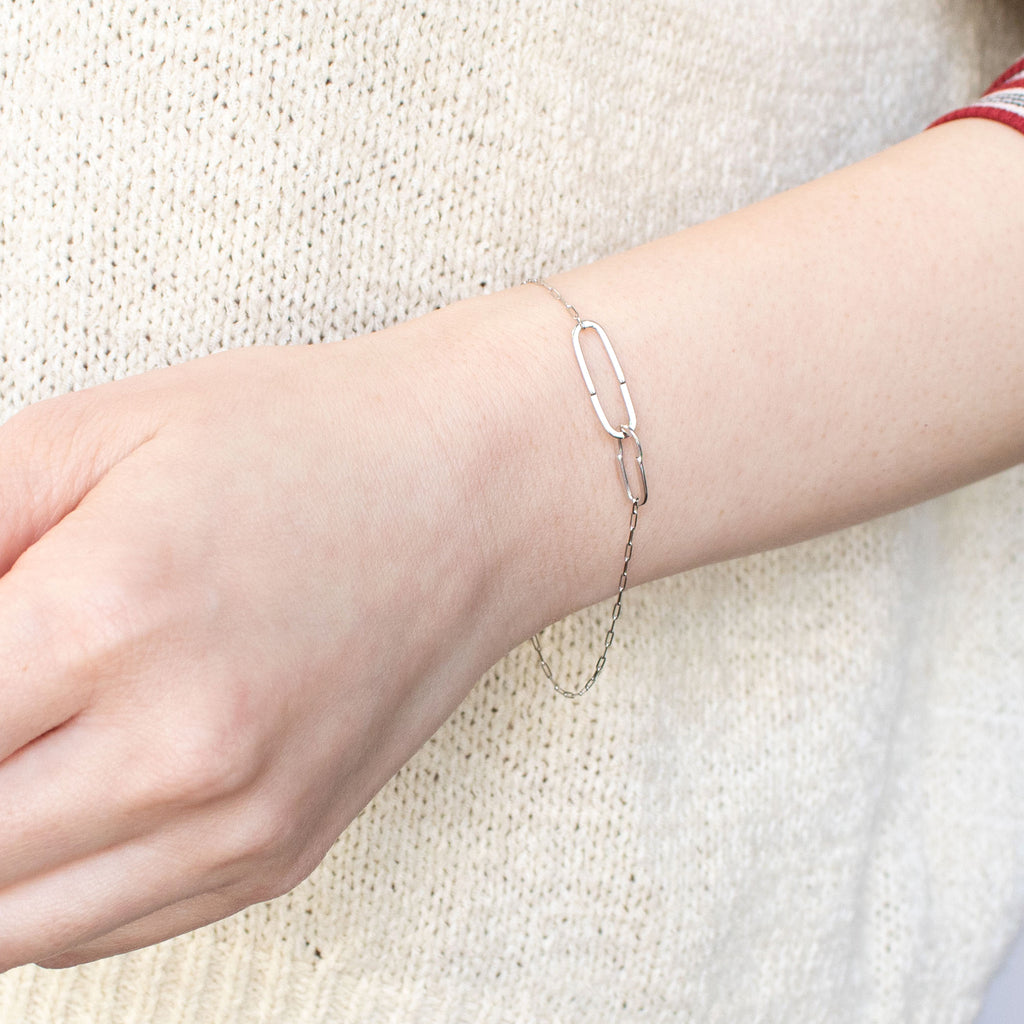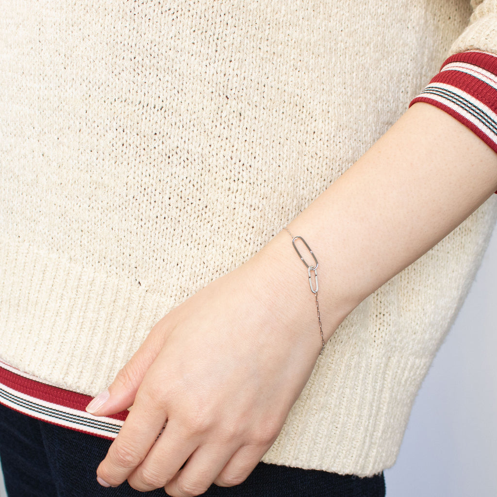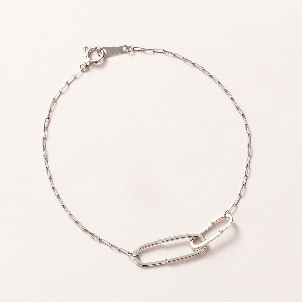 大小の楕円形のプラチナ製パーツが並んだアシンメトリーなデザインがおしゃれなブレスレットです。